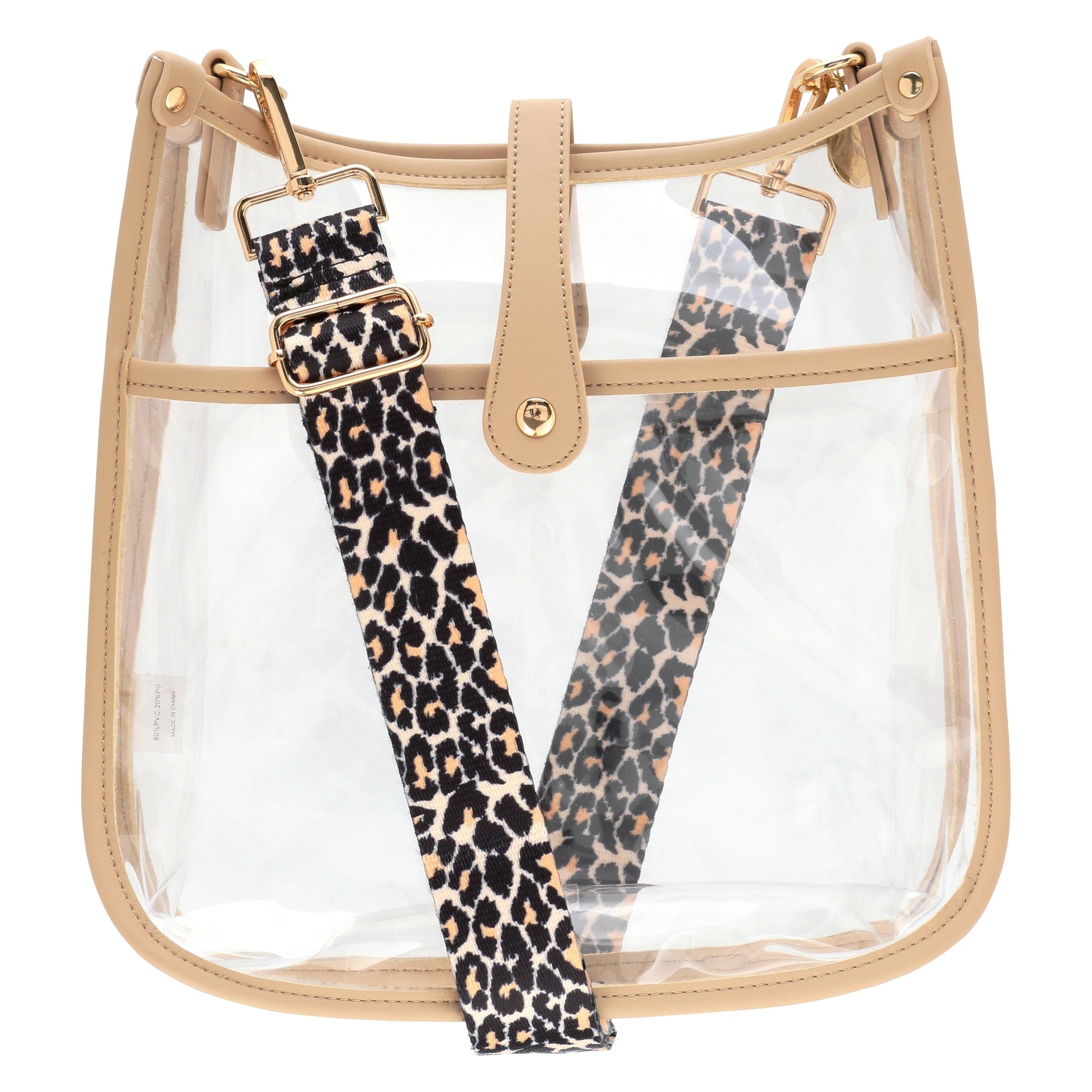 The Milly Kate Clear Crossbody Bag is 11" x 11" making it perfect for football games, basketball games, professional sporting events and many concerts! This clear bag is trimmed in light tan vegan leather with gold hardware. Each clear bag comes with a strap included. Change out the strap to support your favorite college or NFL team!
