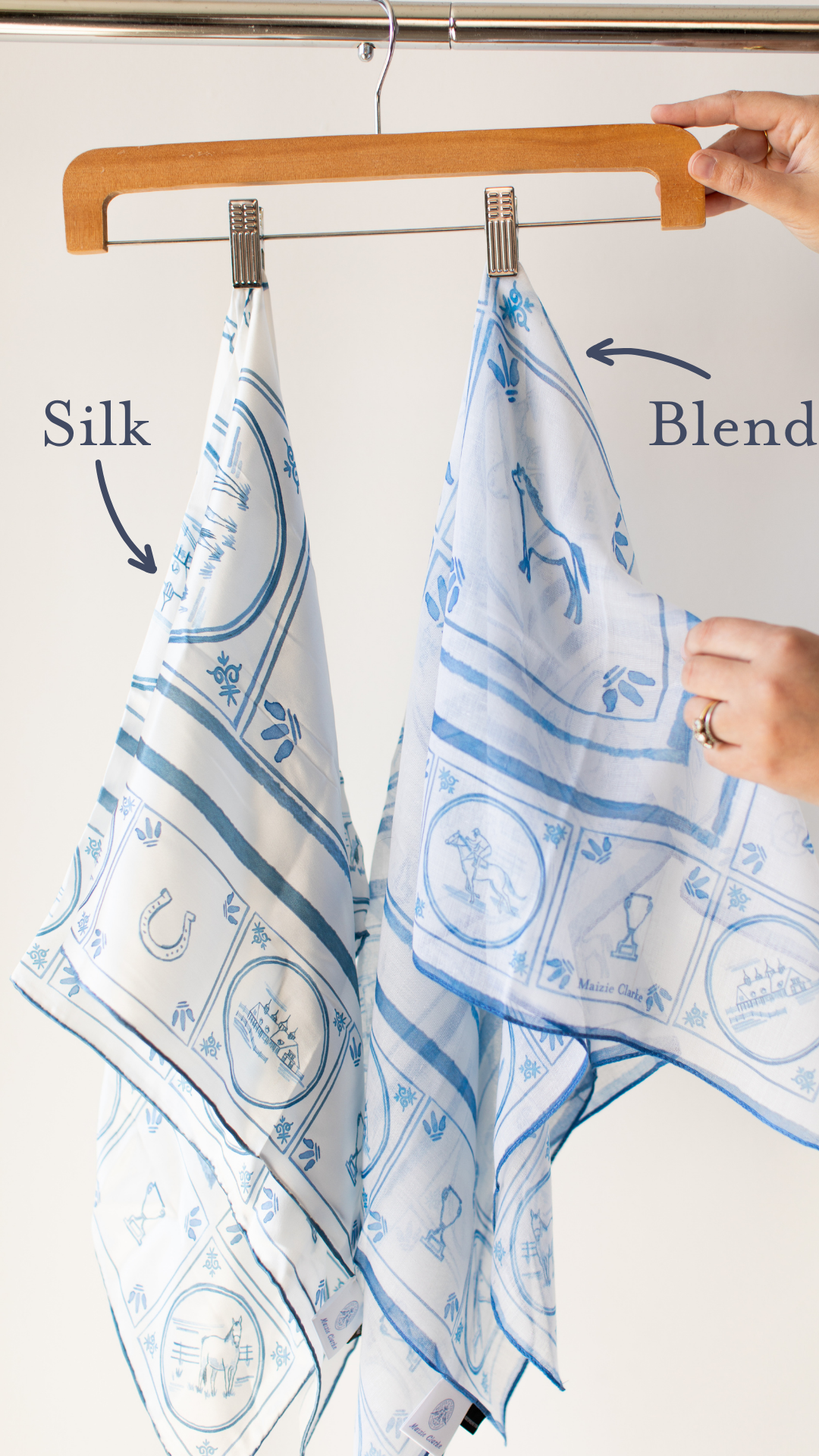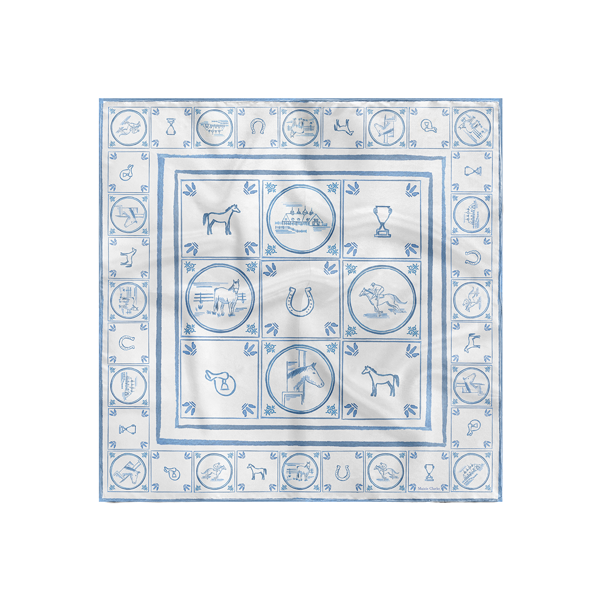 This blue and white inspired equestrian 33"x33" square scarf featuring classic blue and white delft tile motifs.