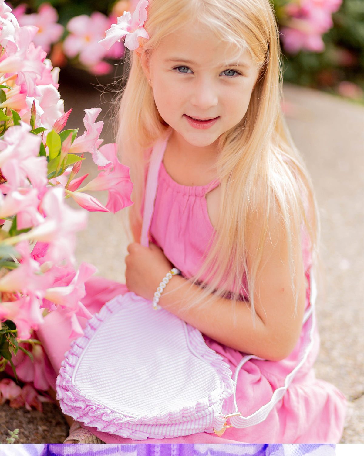 Every little girl-on-the-go needs a go-to bag as sweet and special as she is. With a soft, striped Palmer Pink cotton seersucker heart-shaped body, polished gold heart Bits & Bows logo charm and hardware, matching ruffle trim, adjustable crossbody strap, and wipe-clean lining, it’s a functional, feminine accessory she’s sure to just love season after season.