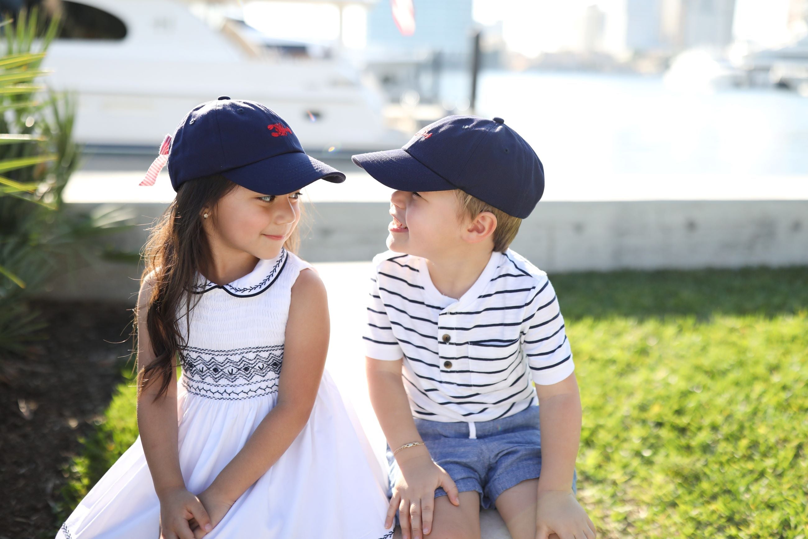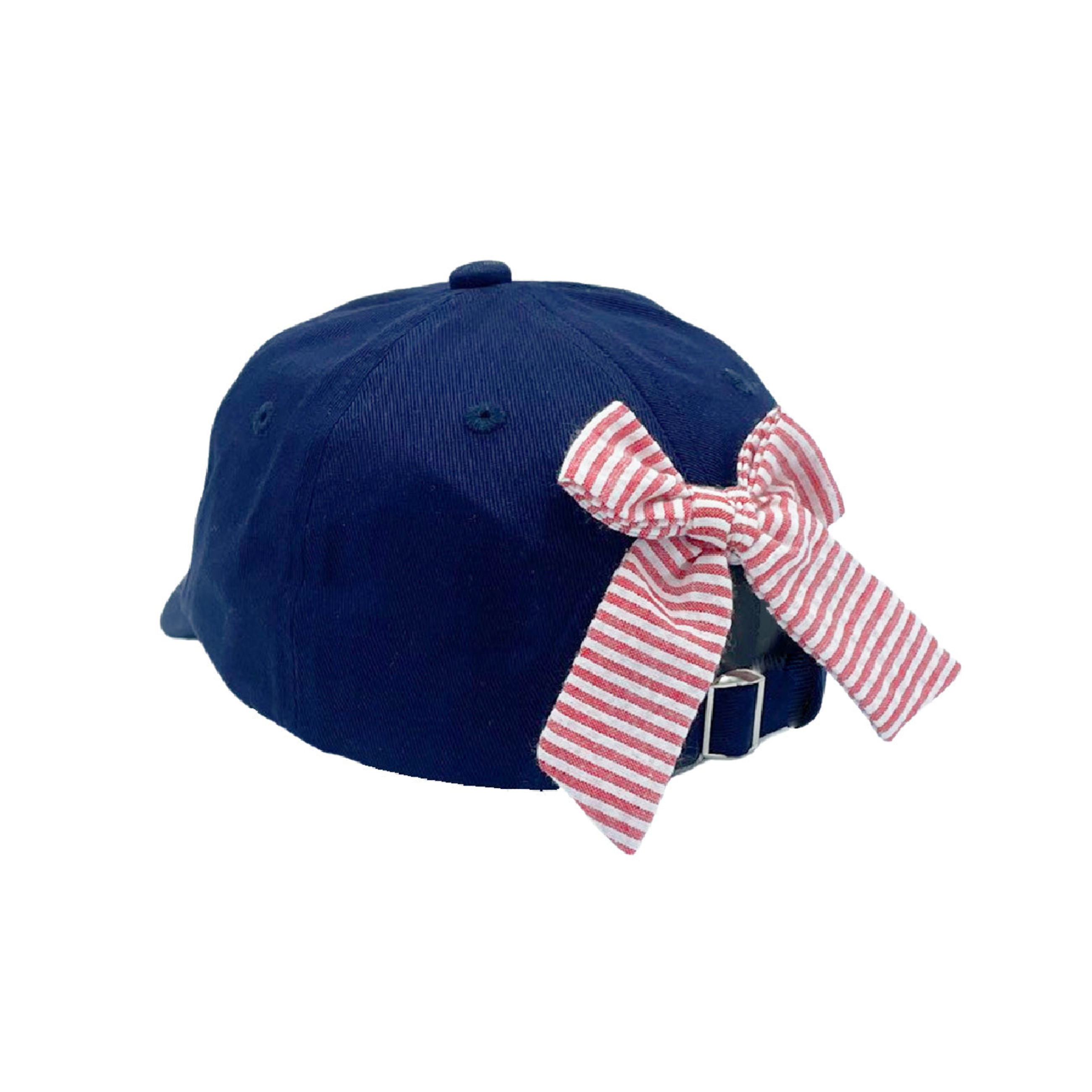 Cap off your little girl's style with an accessory adorned with the most classic of crustaceans. Our feminine twist on a timelessly traditional sportswear accessory, each Nellie Navy soft cotton twill Bow Baseball Hat is embroidered with a pop of red in the lobster in front and a red-and-white seersucker bow in back.