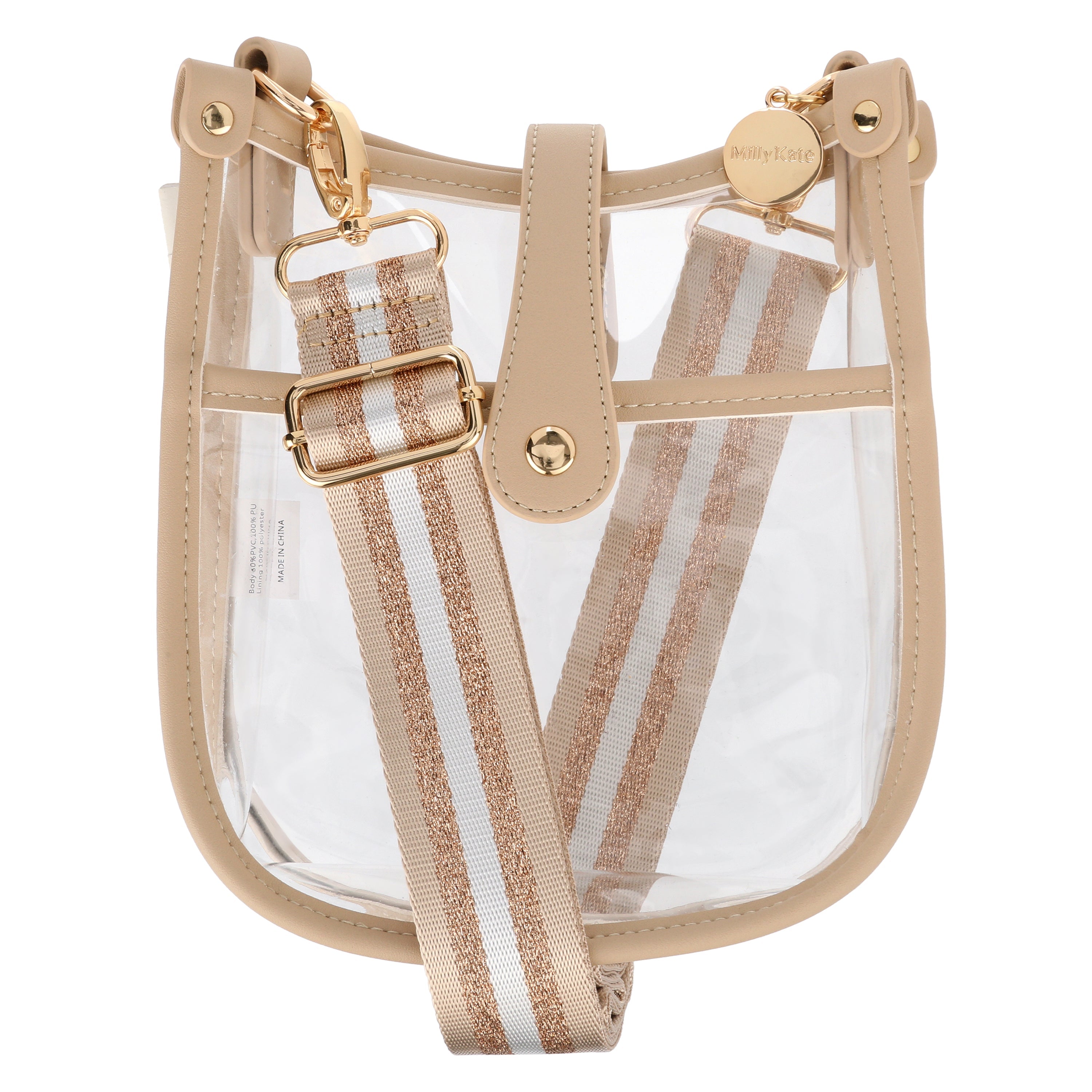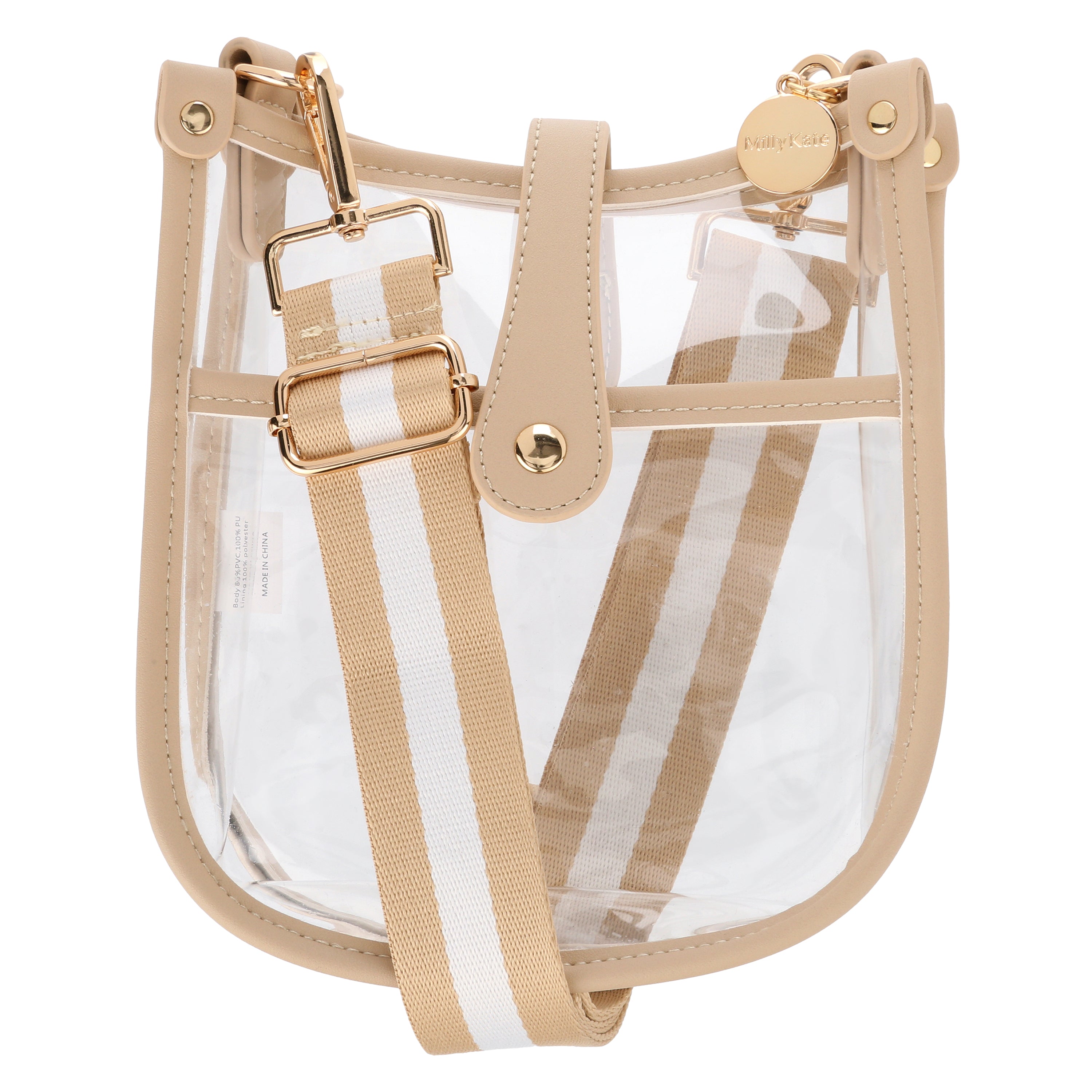 The Milly Kate Mini Clear Crossbody Bag is 8" x 8", making it perfect for football games, basketball games, professional sporting events and many concerts! It's also a great bag for amusement parks and the beach. This clear bag is trimmed in light tan vegan leather with gold hardware. Each clear bag comes with a strap included. Change out the strap to support your favorite college or NFL team!