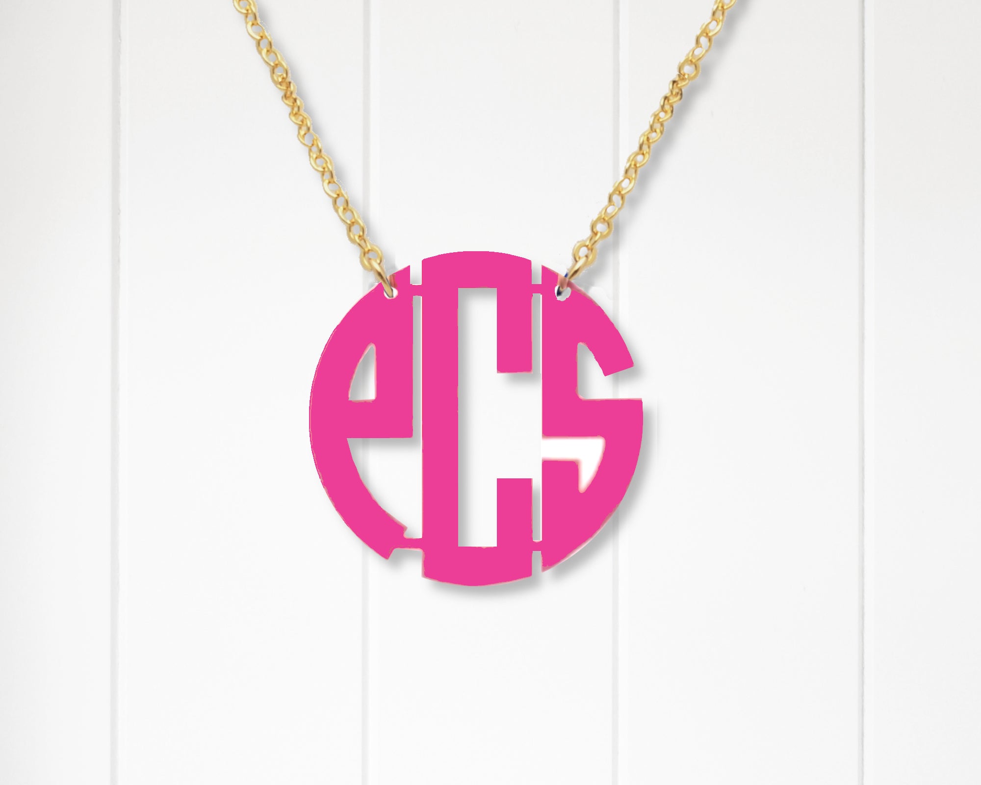 Monograms are always in style! These monogram necklaces come in a variety of fun colors and make a great preppy personalized gift! They are made from laser cut 1/8" acrylic and hang on an 18" necklace in silver or gold. Choose your monogram size and color from the drop down menu. Add your monogram in monogram order (first, LAST, middle) in the note section of checkout.