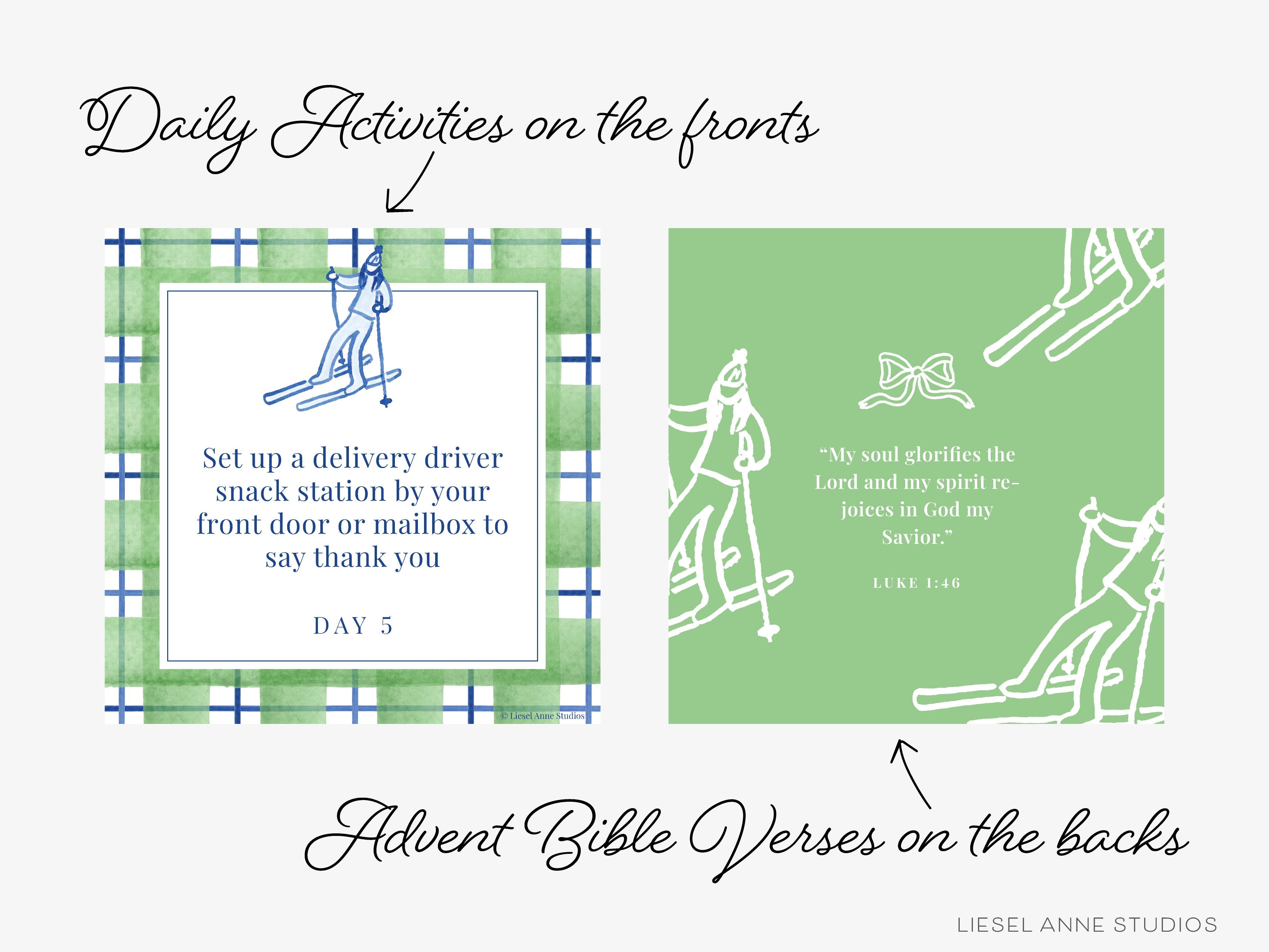 • Set of 25 Advent Cards with activities for all ages on the fronts and scripture on the backs