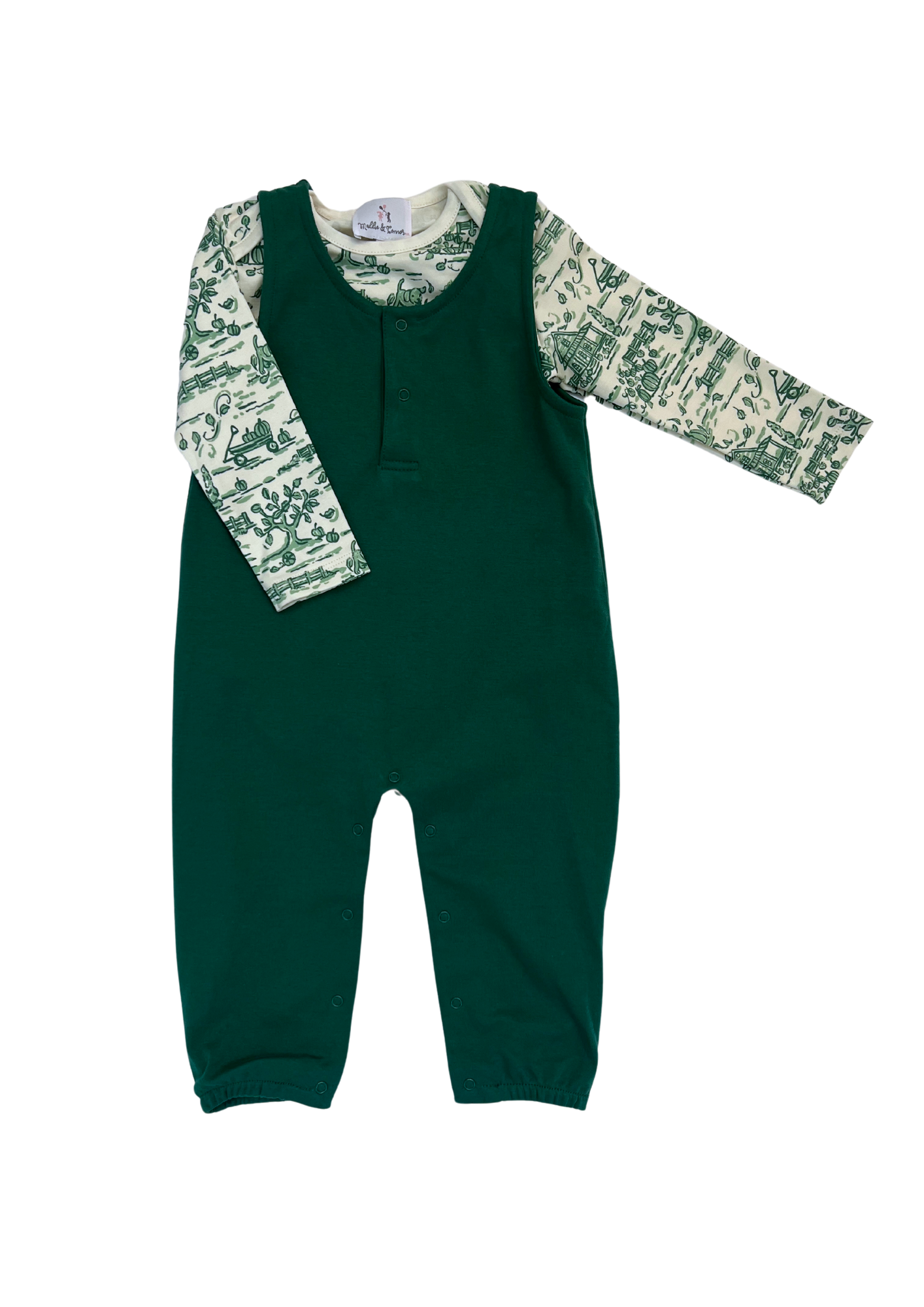 Our boys autumn toile set is the perfect fall outfit for baby boy! This pima cotton set includes an autumn toile print onesie and matching pima overalls. Fit is tts.