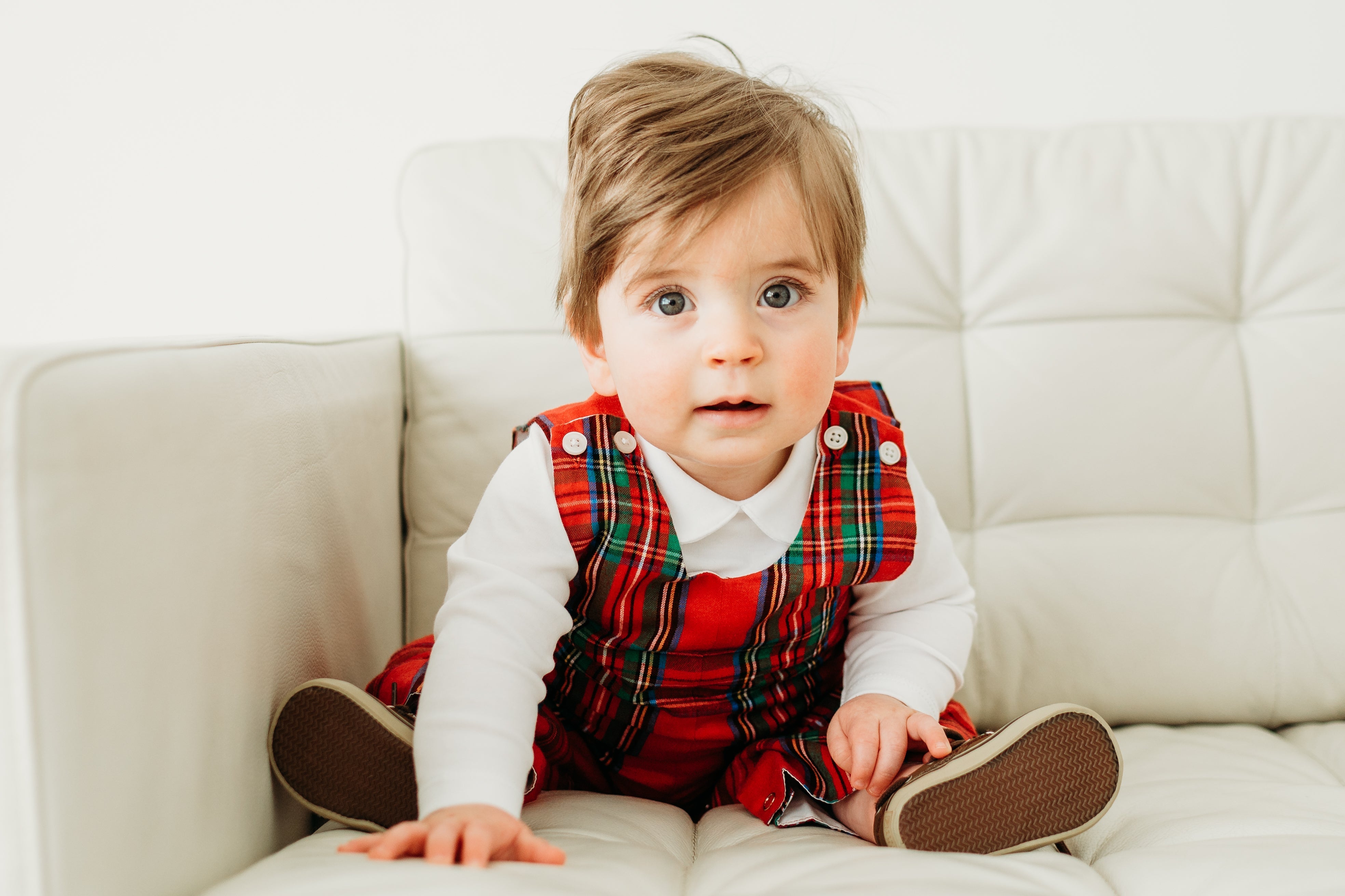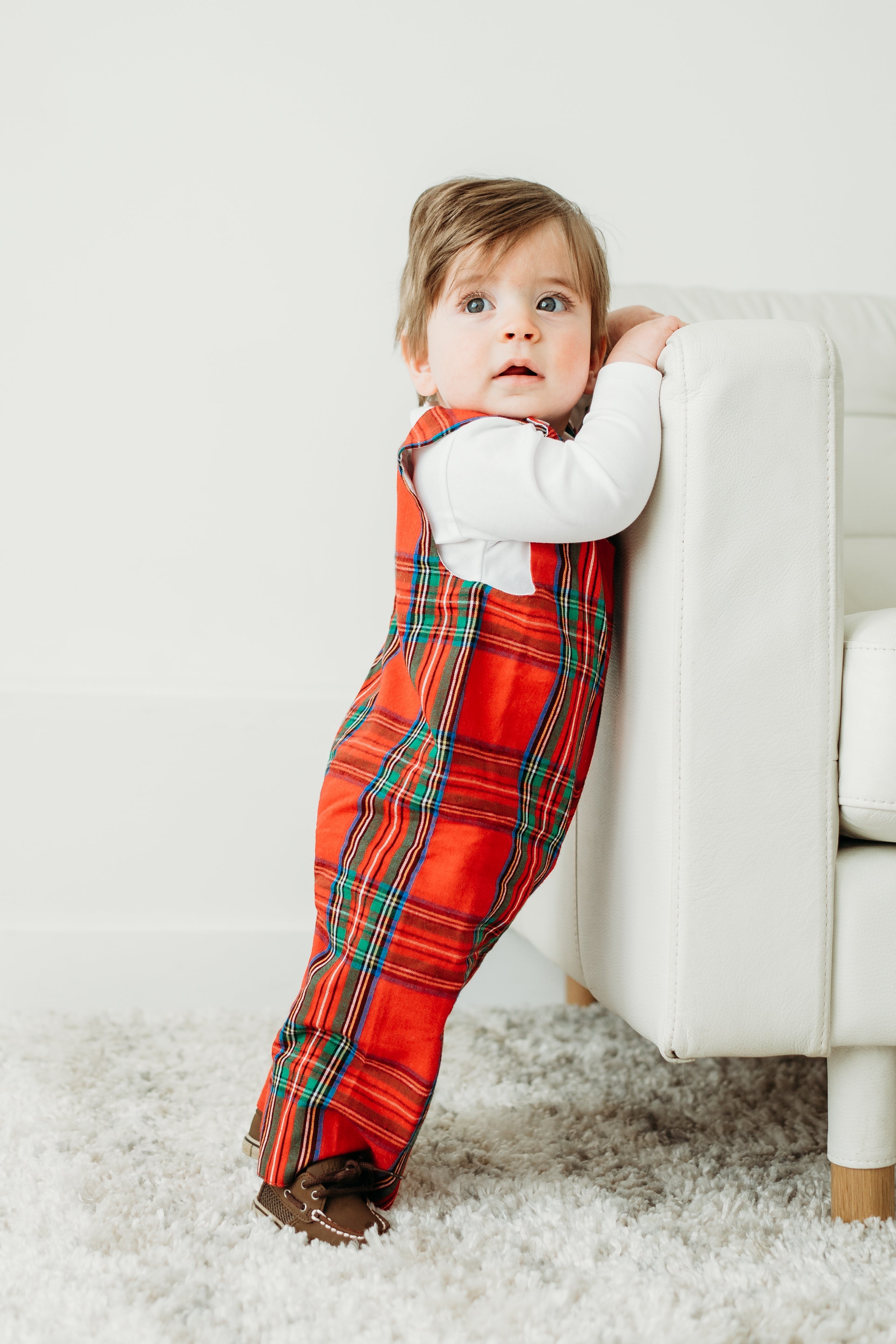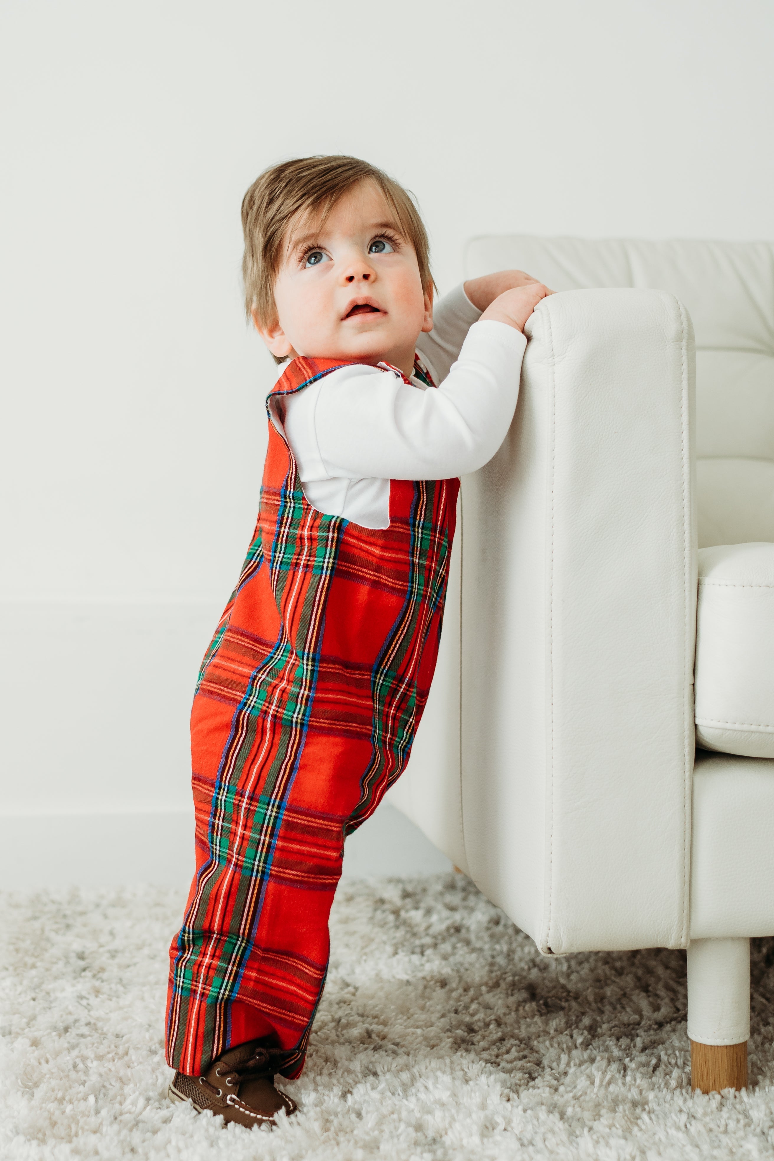 Our baby boys red tartan longall is a classic for the holidays. This longall is perfect for holiday events and meeting Santa! Fit is tts. Match with our other holiday tartan styles!