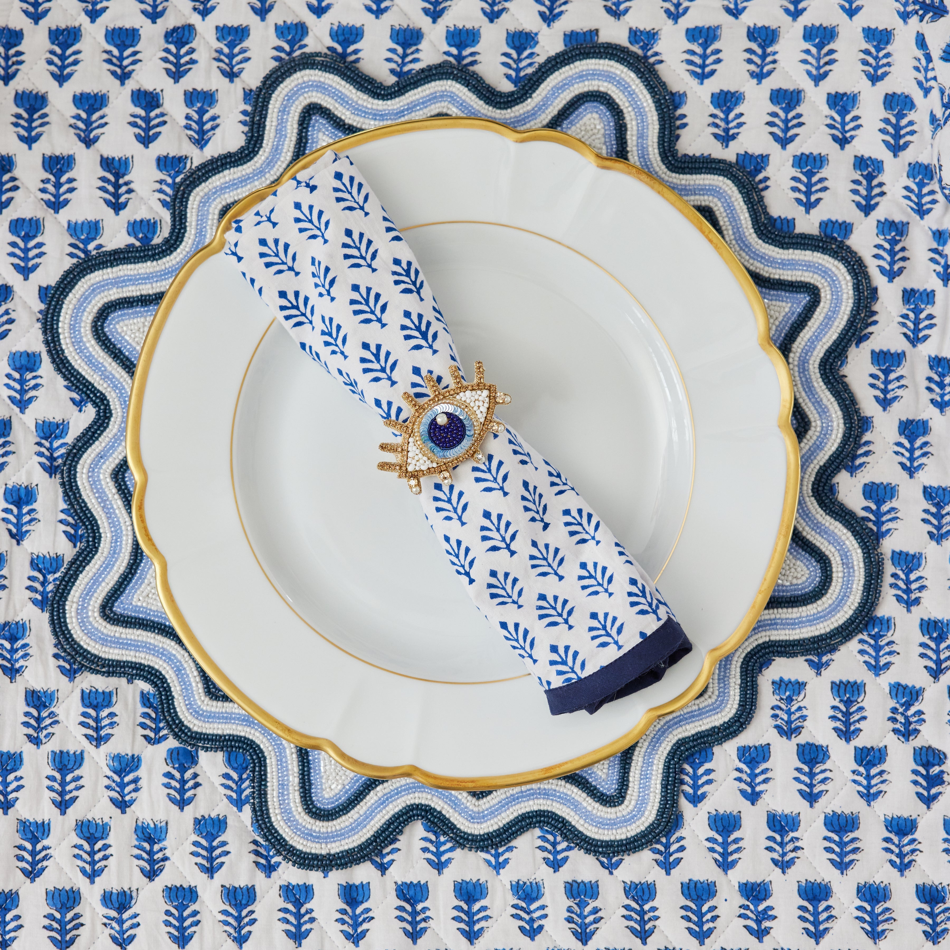 These hand beaded placemats are so fun and easy to layer with so many different tablecloths and other table accessories! This one is white, navy blue and periwinkle.