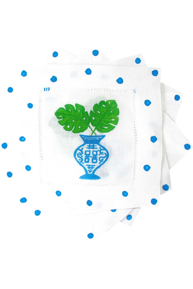 Blue Chinoiserie Monstera Leaf Linen Cocktail Napkins