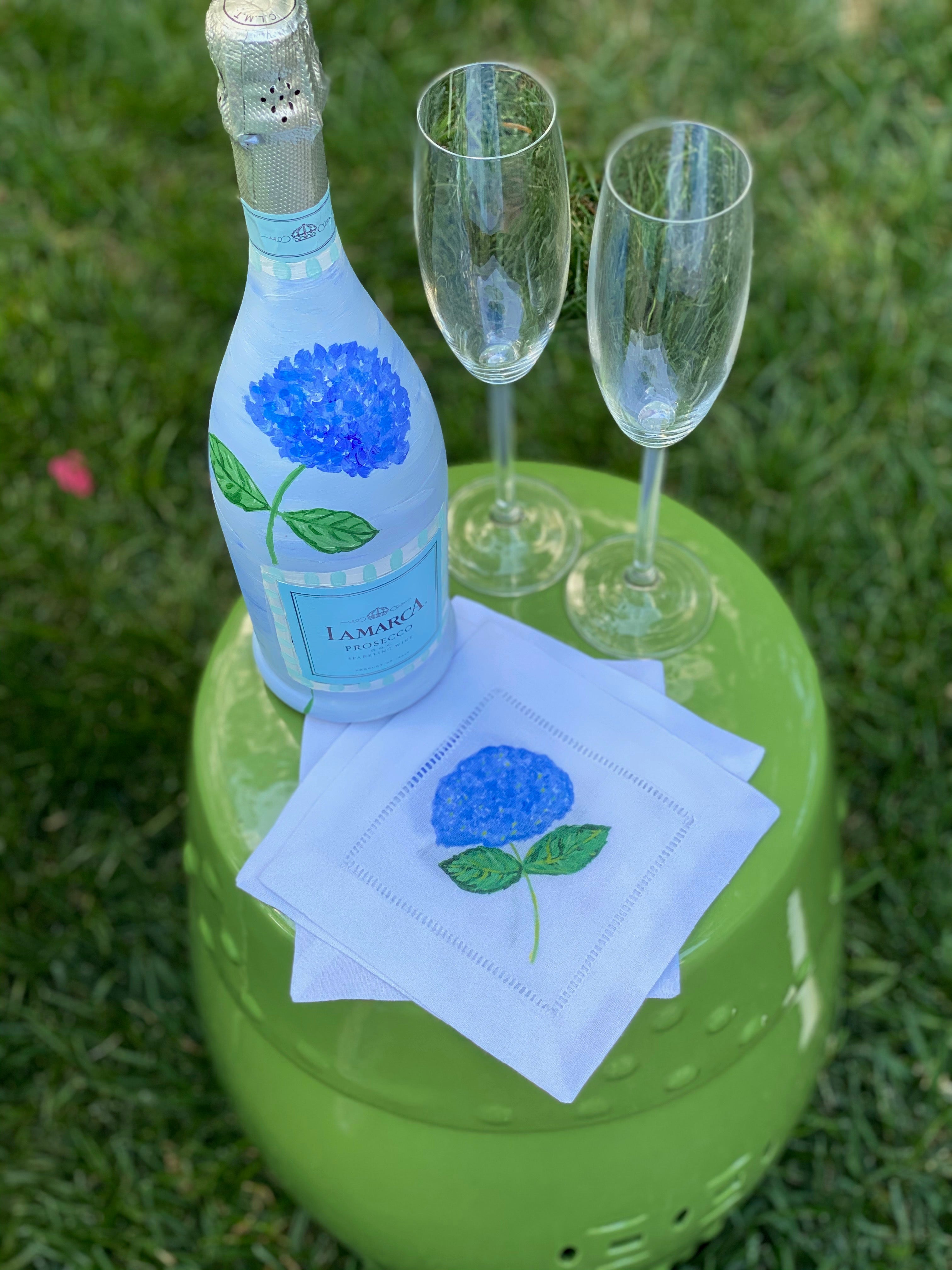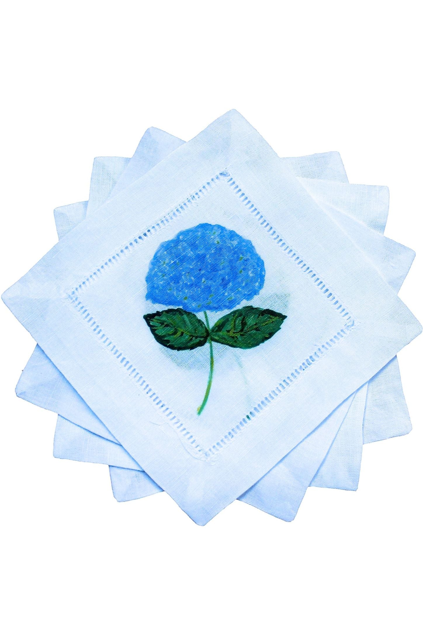 Custom designed linen cocktail napkins featuring a single blue hydrangea. Makes a great hostess, housewarming, and birthday gift idea.