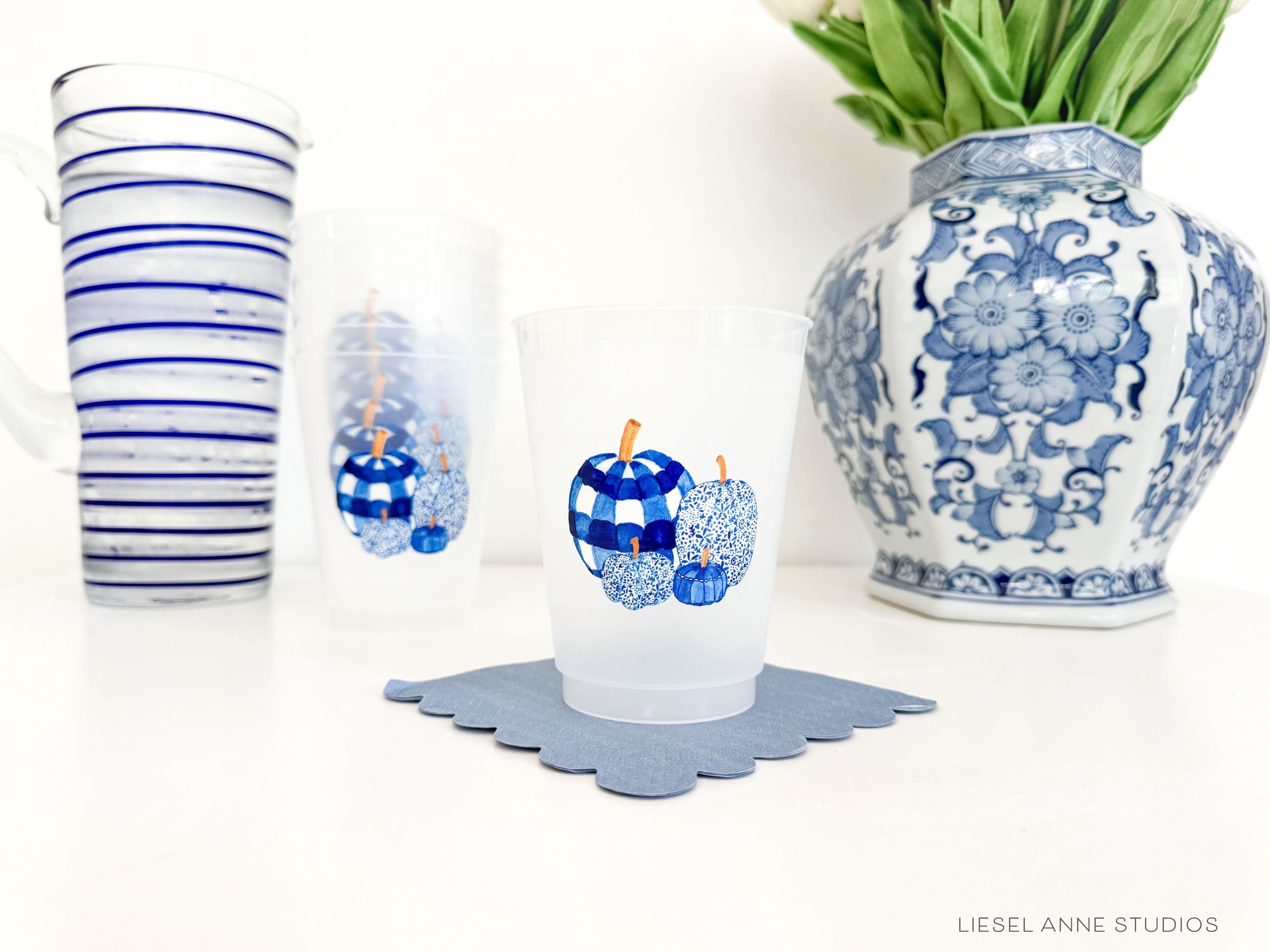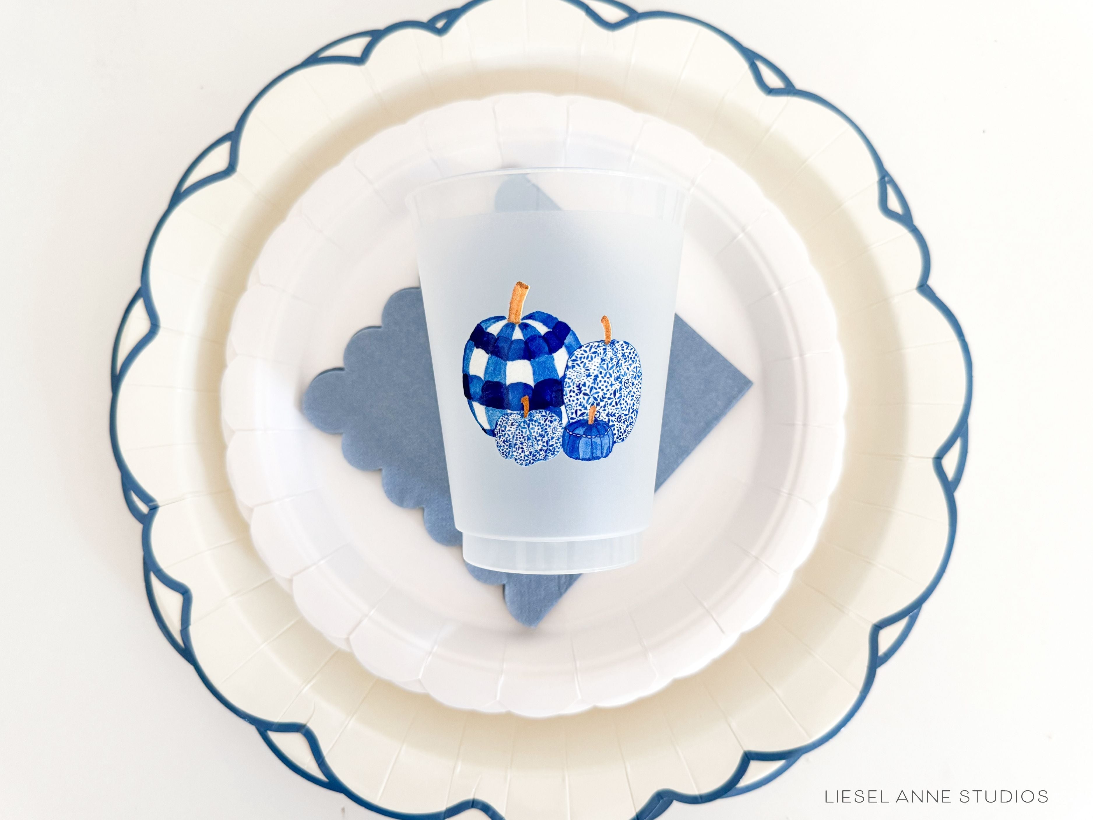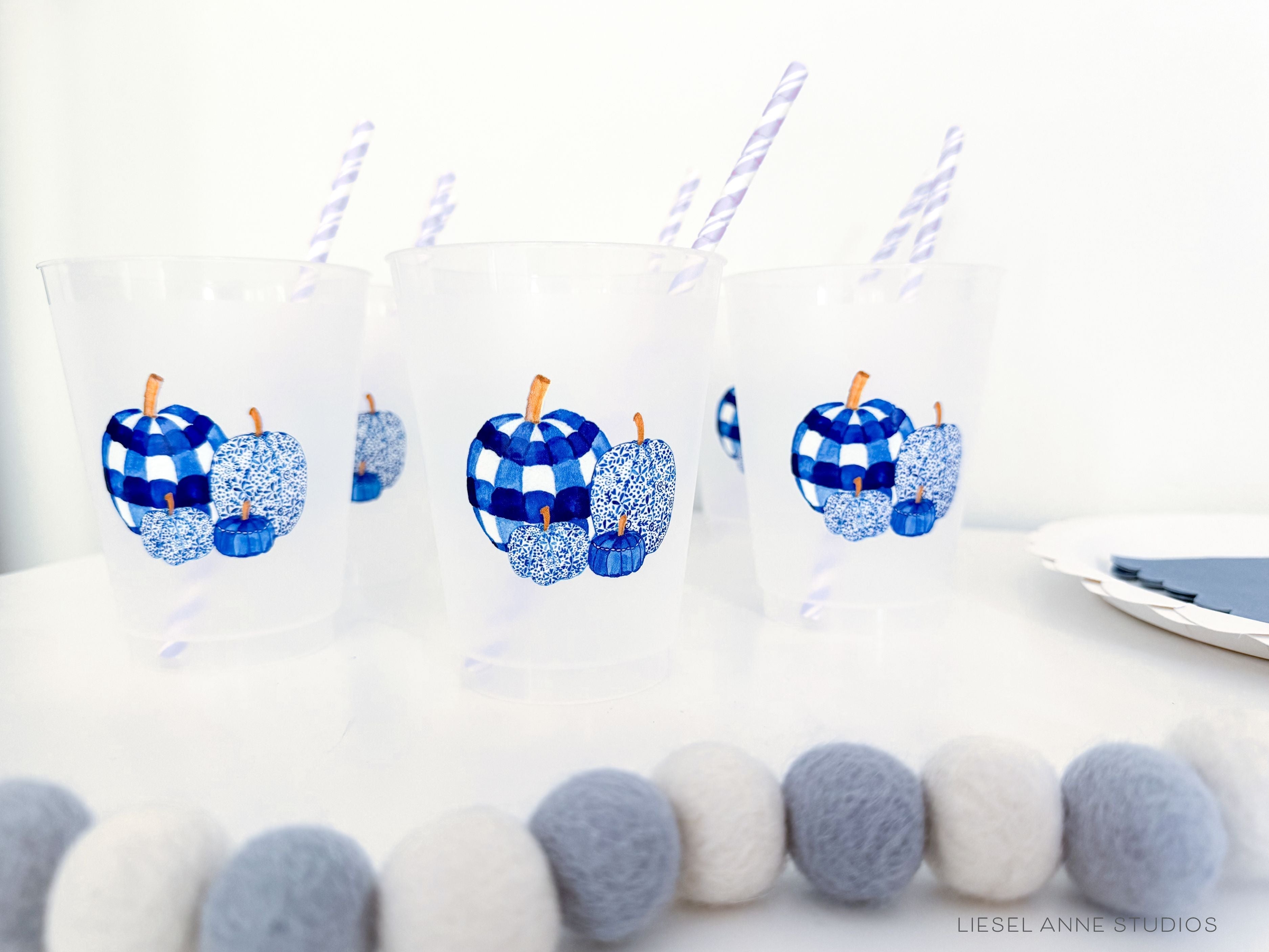 Blue & White Pumpkin Frosted Shatterproof Cups | Set of 8 | Reusable Preppy Fall Party Cups | BBQ Cook Out Cups | 16oz Halloween Party Cup | Blue & White Gingham Chinoiserie