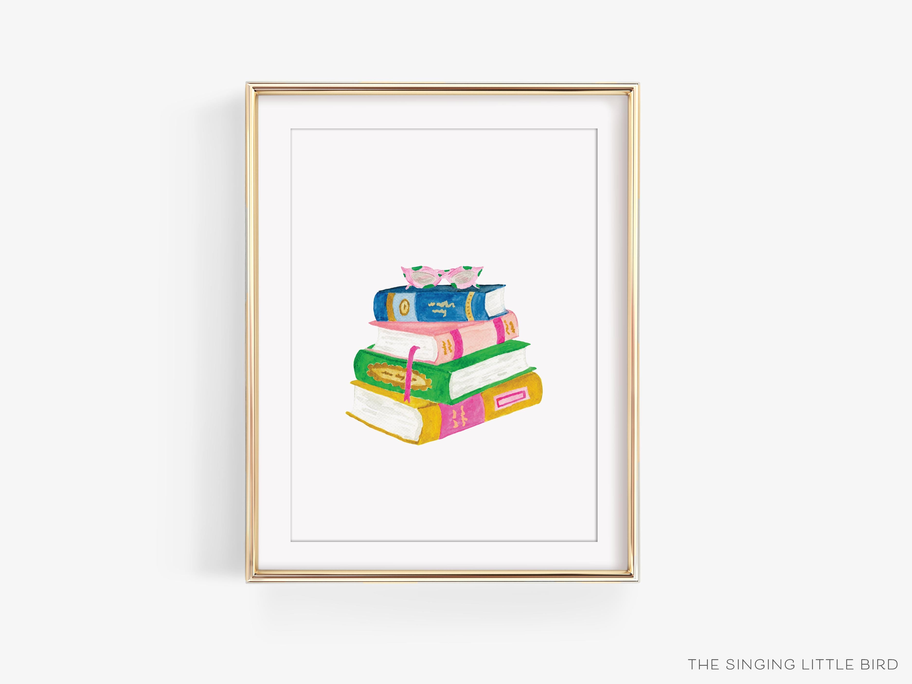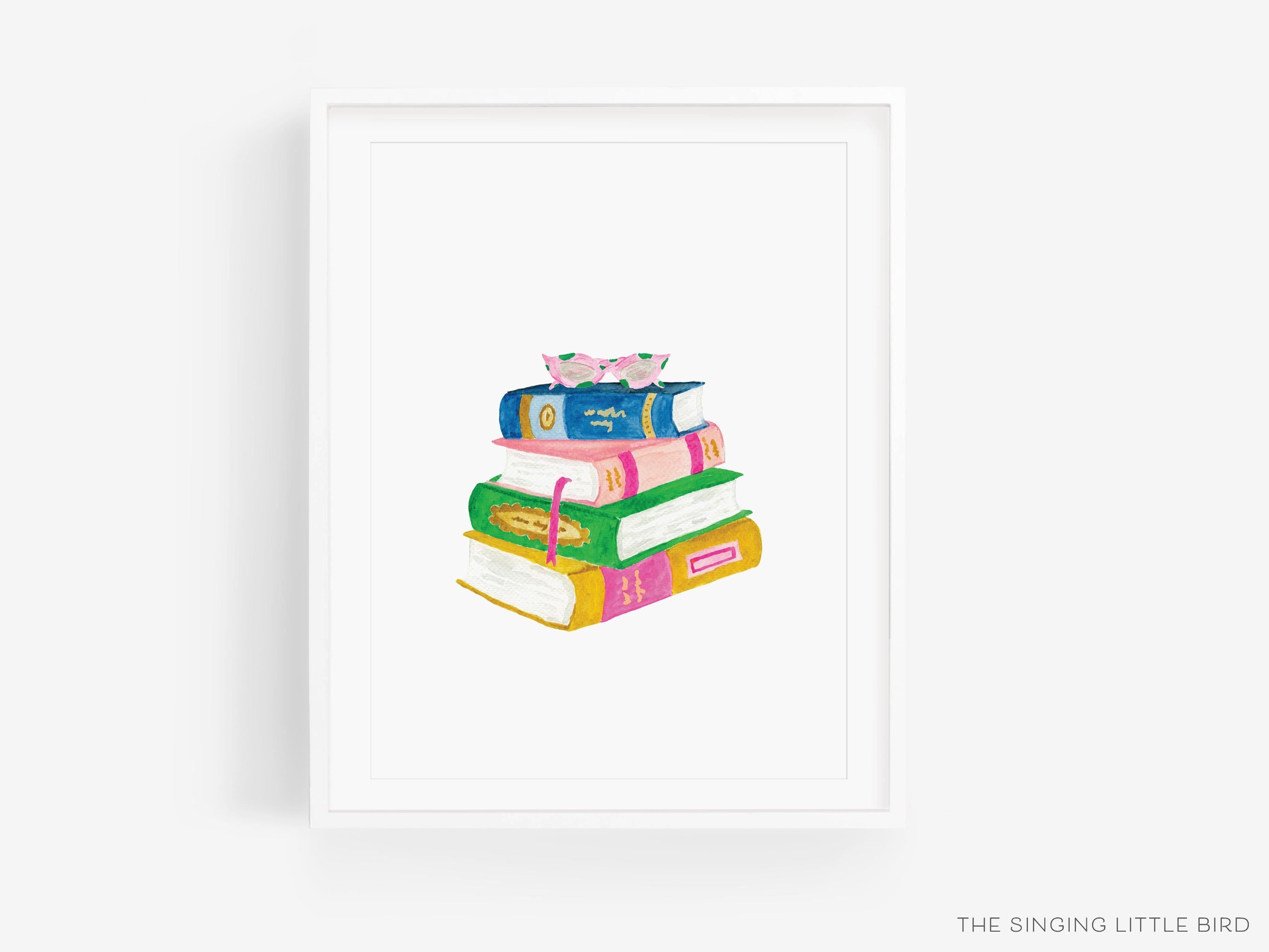 Book Lover Art Print | Hand Painted Book Stack Art | Readers Nook Watercolor | Library Books Wall Art | Preppy Funky Reading Glasses | Decor