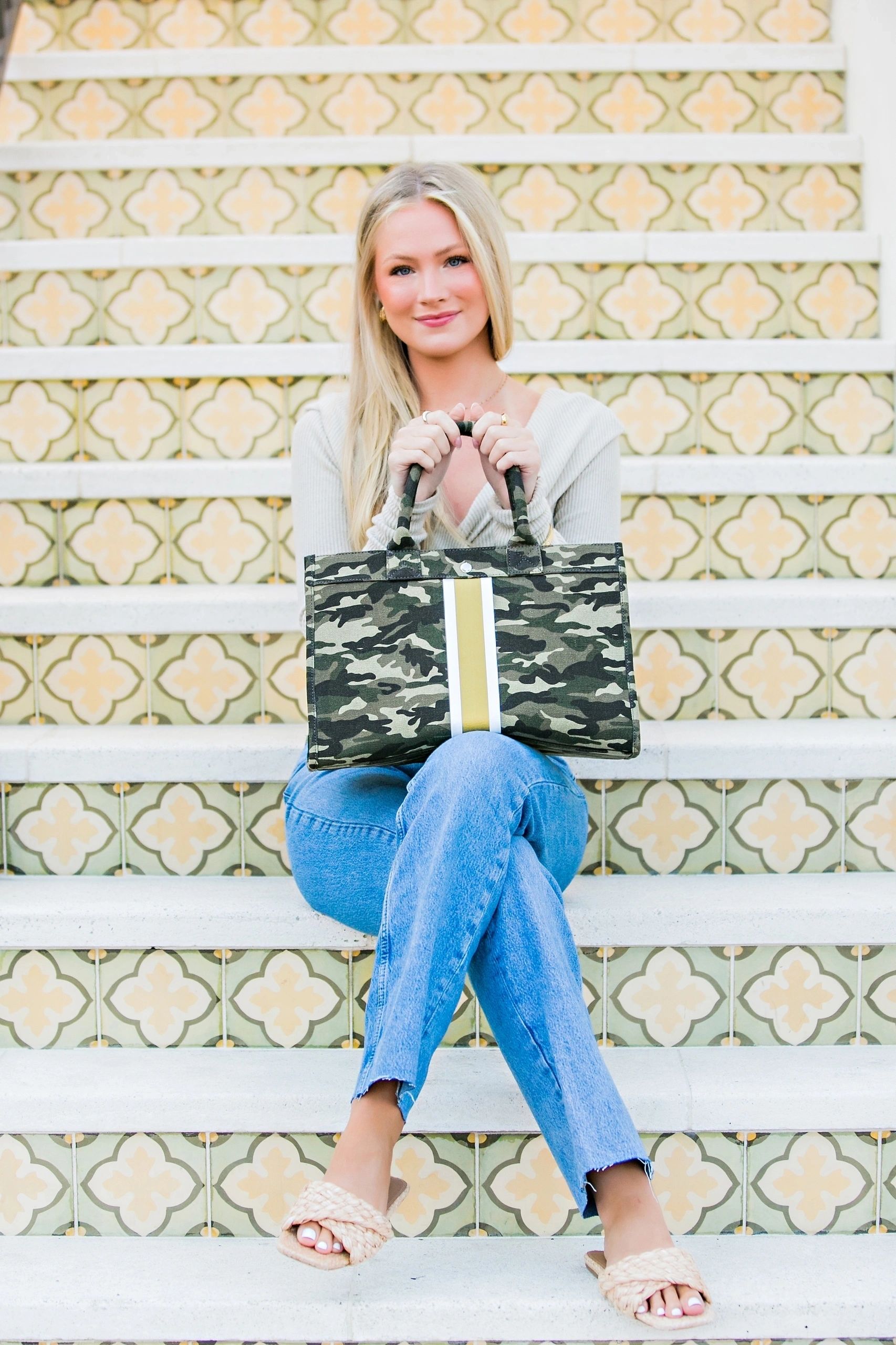 The best selling camouflage tote by Milly Kate is stylish, on-trend and practical. It’s the perfect bag to hold everything you need for your busy day, a night out, or while traveling. The fun stripes on the classic camouflage create a fashionable combination you will be proud to wear. It is big enough to hold all of your essentials and has a magnetic closure and inside pockets. The detachable strap lets you carry it as a tote, over your shoulder or as a crossbody.