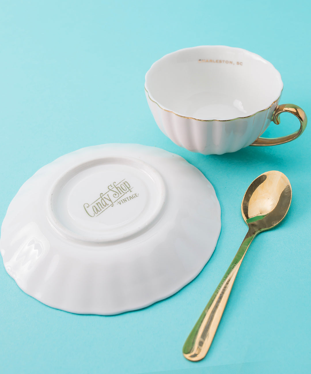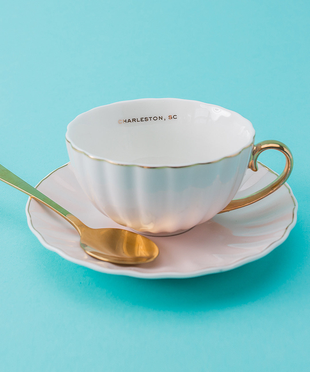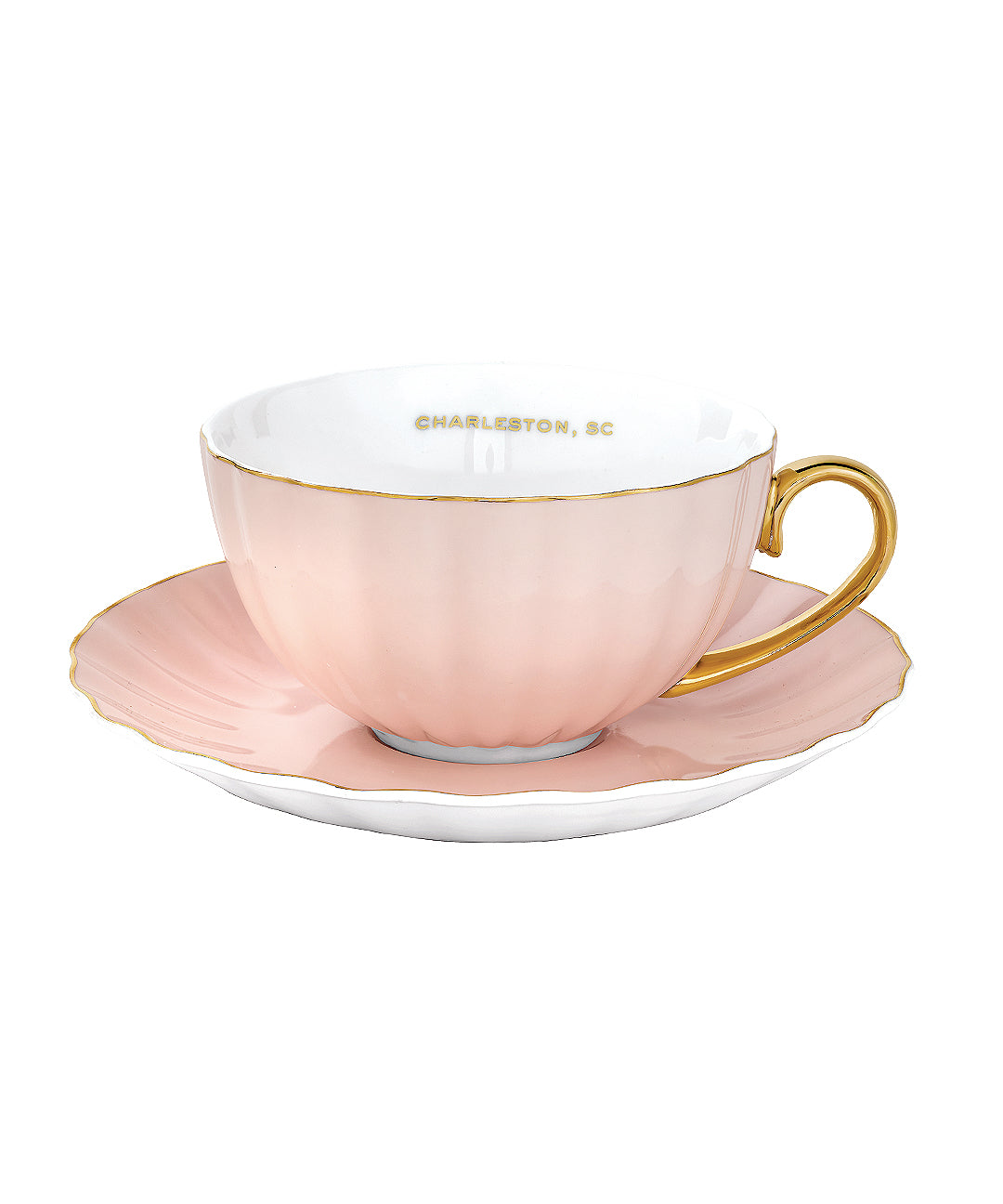 Do you know the only tea plantation in North America is located in Charleston, SC? And we serve tea locally grown on the Charleston Tea Plantation at all of our tea parties held at our Charleston, SC retail store. Each tea party guest gets to leave with their own porcelain teacup and saucer, customized by us with "CHARLESTON, SC" along the interior rim. Now you can also purchase this sweet, scalloped pink teacup and saucer online. A perfect tribute to one of one of America's most beautiful cities! Comes individually packed in a gift box. 10.2 x 8.7 x 8.1 inches.