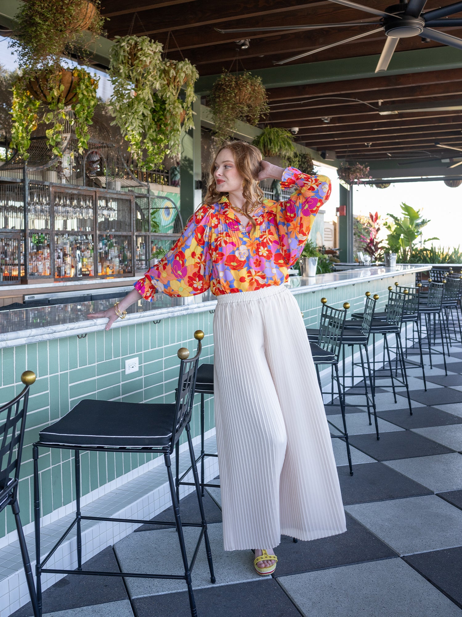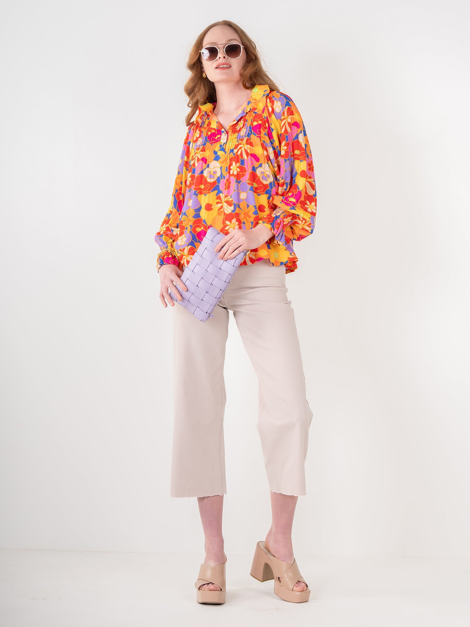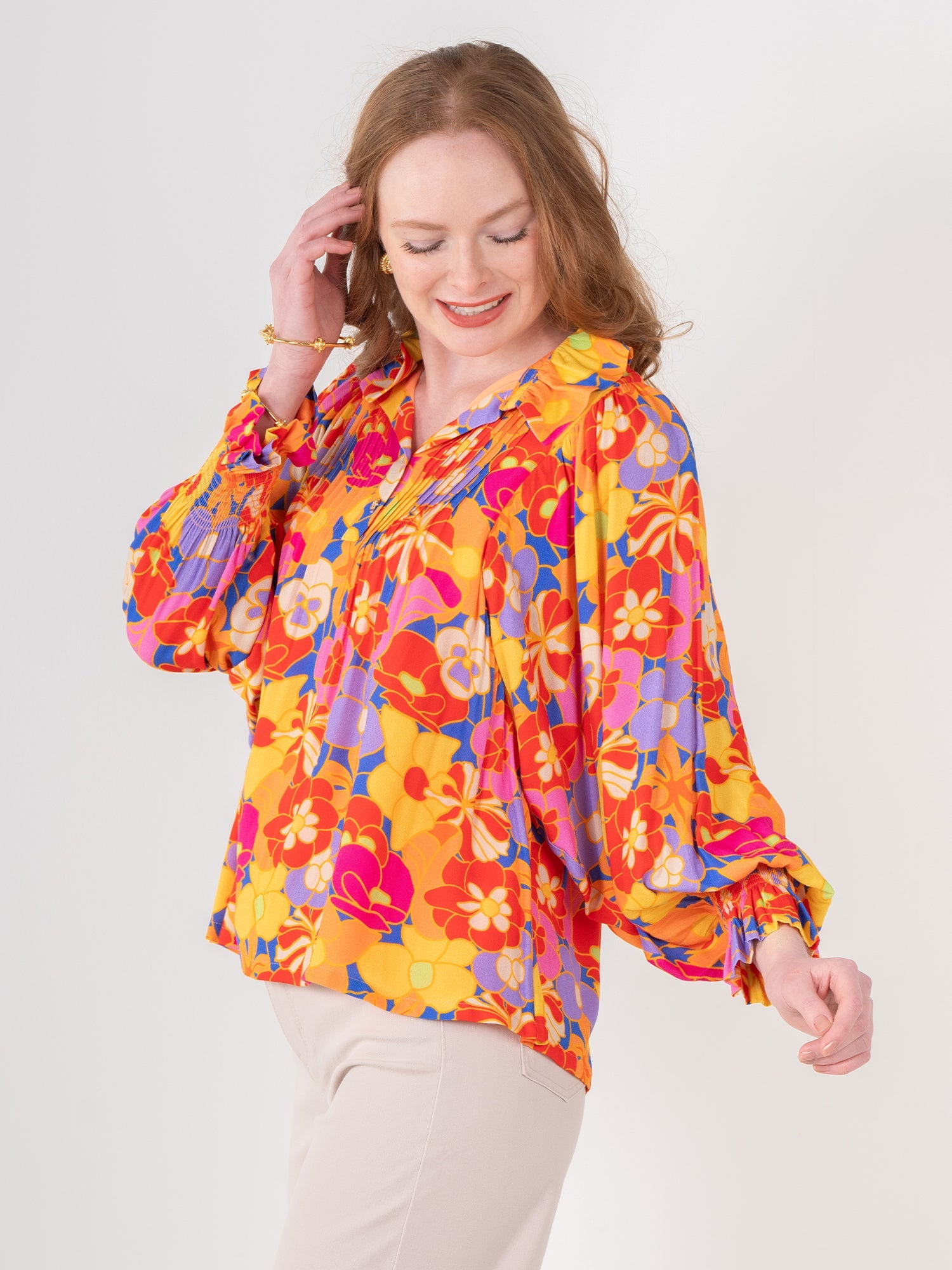 The Charlotte Top is a feminine confection with timeless charm. Featuring a ruffle stand collar, pintuck pleats, and smocked wrist cuffs serving unique detail and effortless style. Designed in a retro inspired floral print that boasts playful color and feminine flair. Pair with the Pleated Pant in Sandshell for a touch of texture and on-trend style!