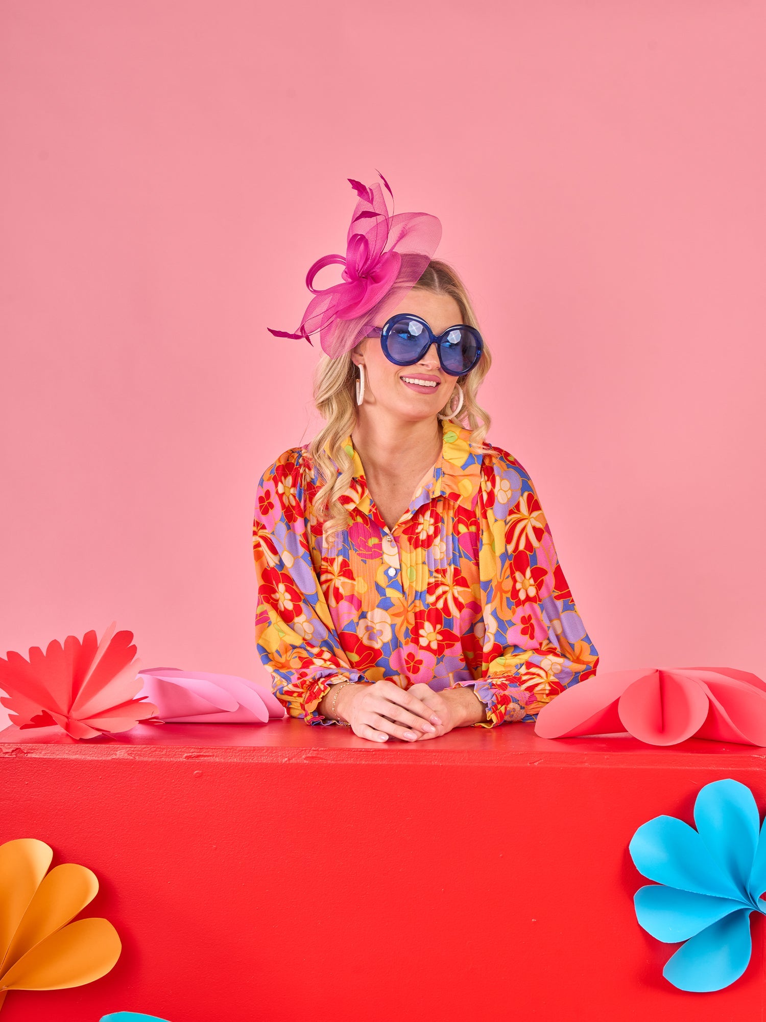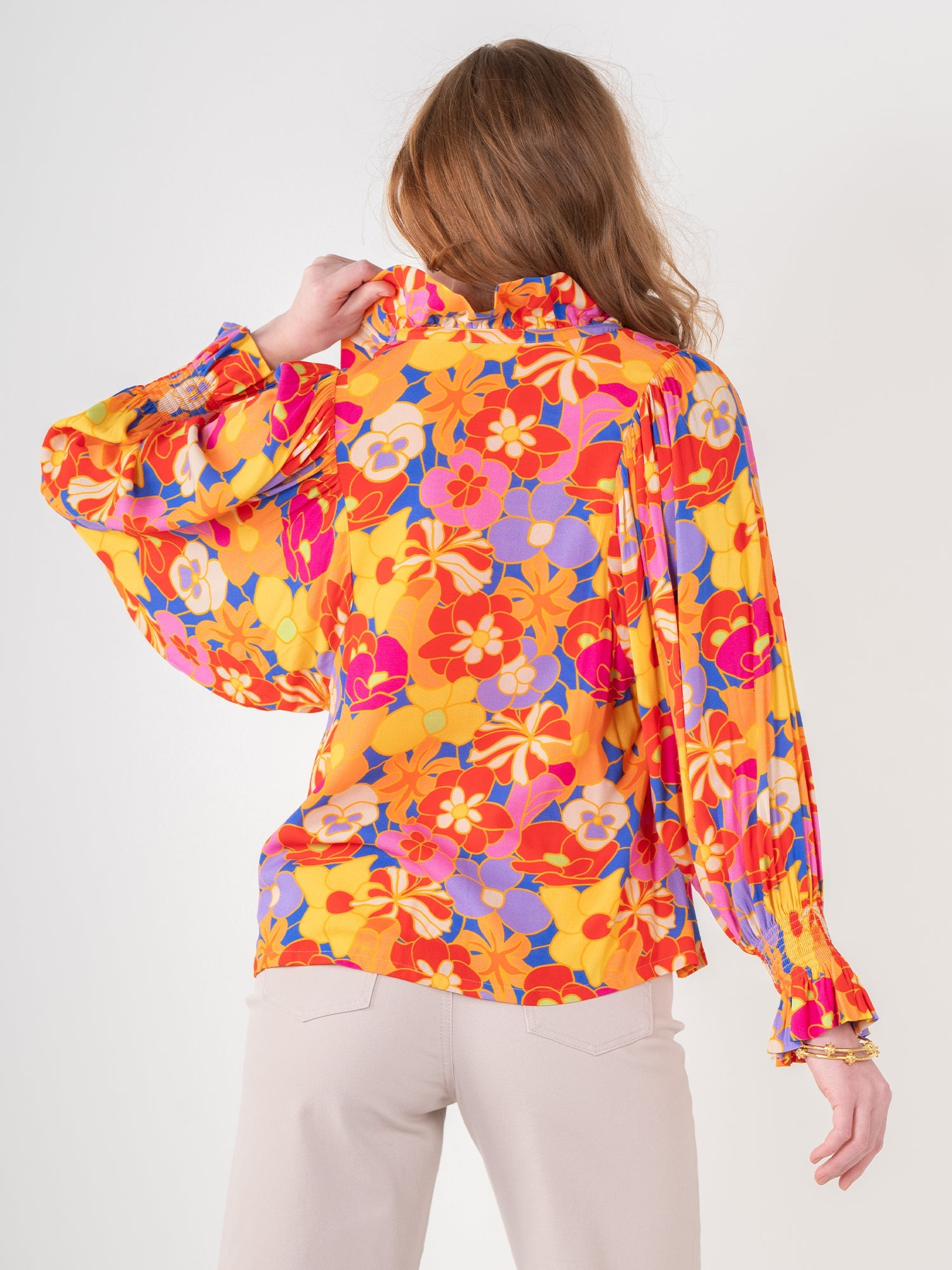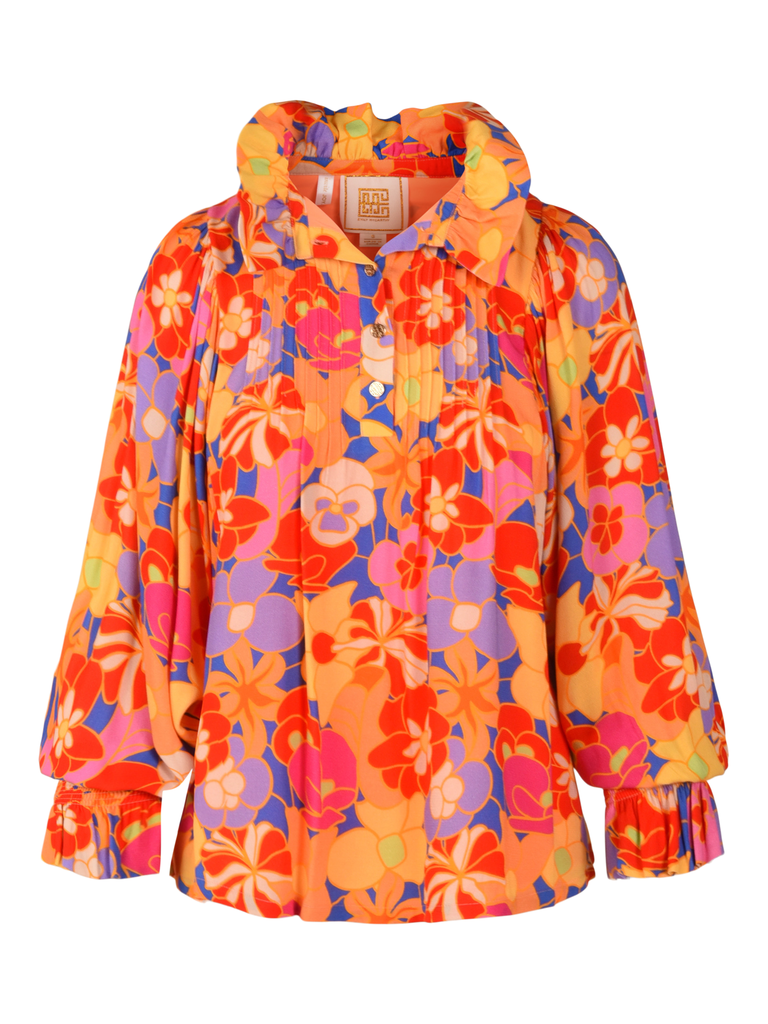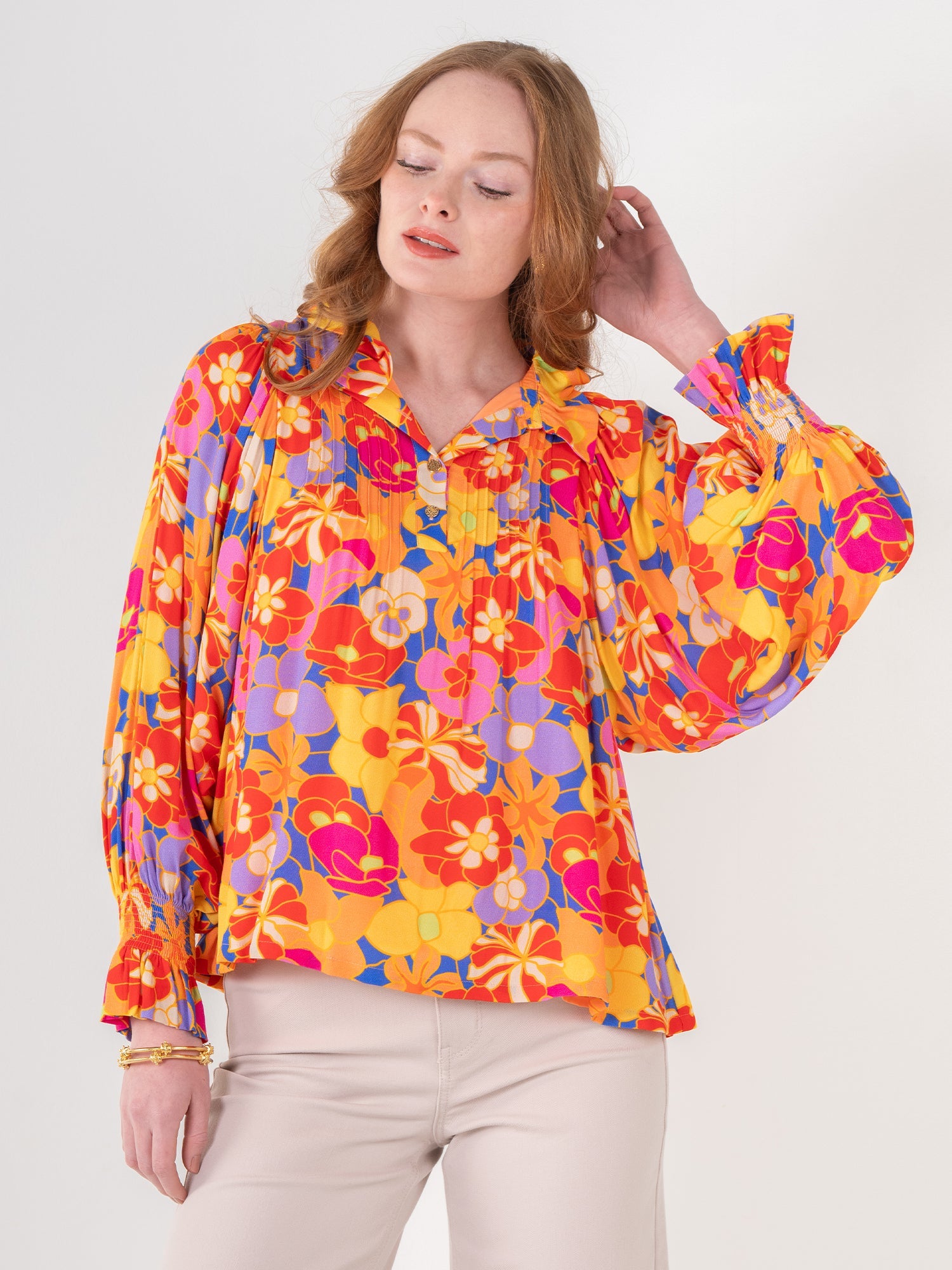 The Charlotte Top is a feminine confection with timeless charm. Featuring a ruffle stand collar, pintuck pleats, and smocked wrist cuffs serving unique detail and effortless style. Designed in a retro inspired floral print that boasts playful color and feminine flair. Pair with the Pleated Pant in Sandshell for a touch of texture and on-trend style!