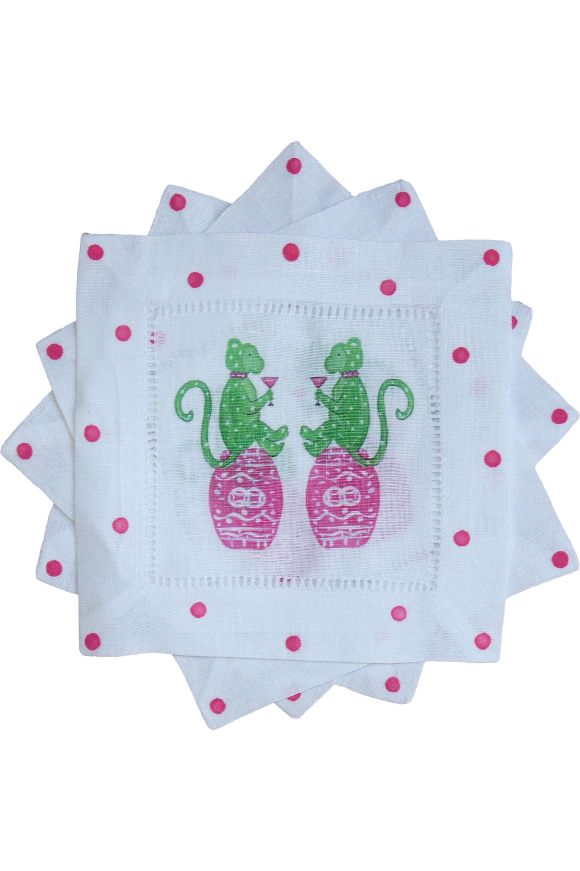 Colorful Pink and Green Chinoiserie Monkey linen cocktail napkins are the perfect complement to your beverage. Custom designed with a funny set of monkeys sipping cocktails on their chinoiserie garden stools. Your guest will be impressed by the custom design and having the option to personalize them makes them a great hostess gift, birthday gift and a great gift idea for any occasion.