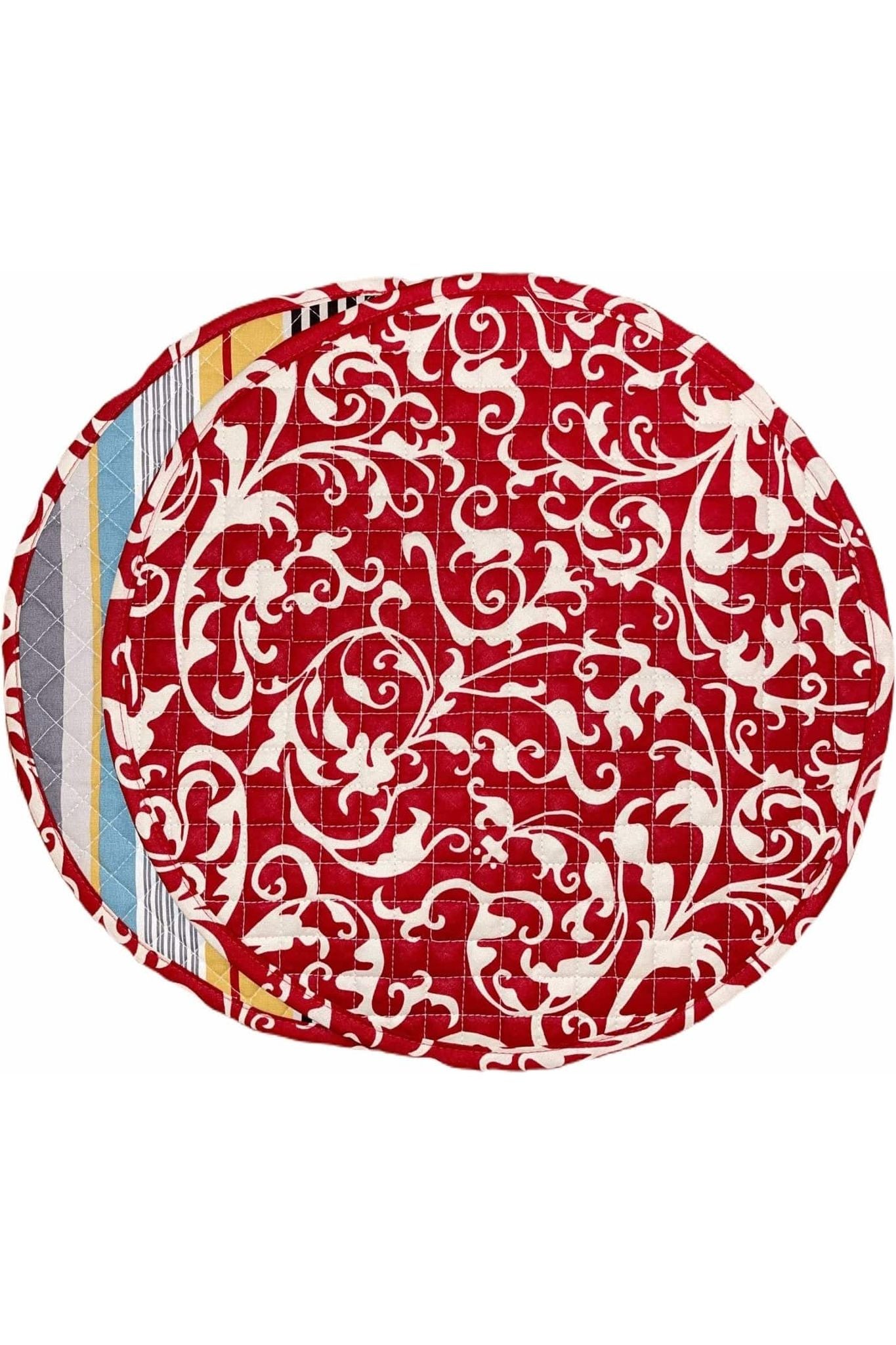 devine scarlet red reversible bold striped licorice black printed round quilted cloth placemats