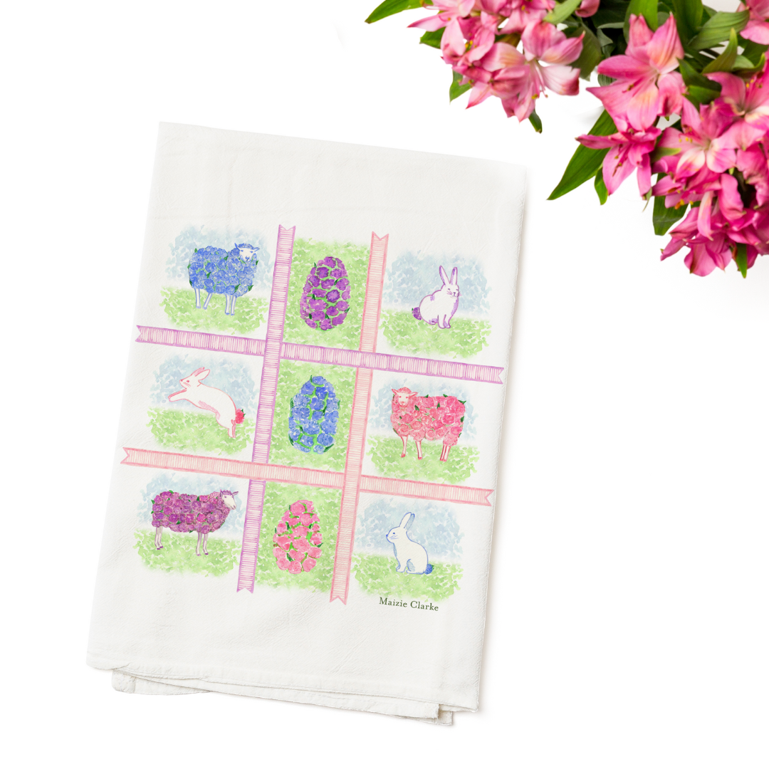 This springy Easter design decorates this 27"x 27" 100% tea towel. Lamb and bunny designs accompany an Easter egg and illustrated ribbon trim.