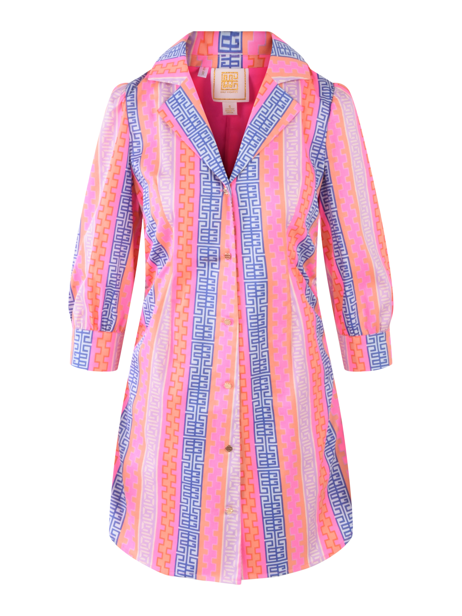 The Felicity Dress offers a modern take on the classic shirt dress. Figure-flattering side ruching complements the timeless elegance of a traditional collar and simple three-quarter length sleeves. Embroidered covered buttons add a subtle touch of luxury. The 'Geo Stripe' print combines neon hues of geometric shapes and our signature monogram logo in a joyful stripe pattern. Dress it up with a heel, or pair with your go-to sneakers for a more casual, effortless look.