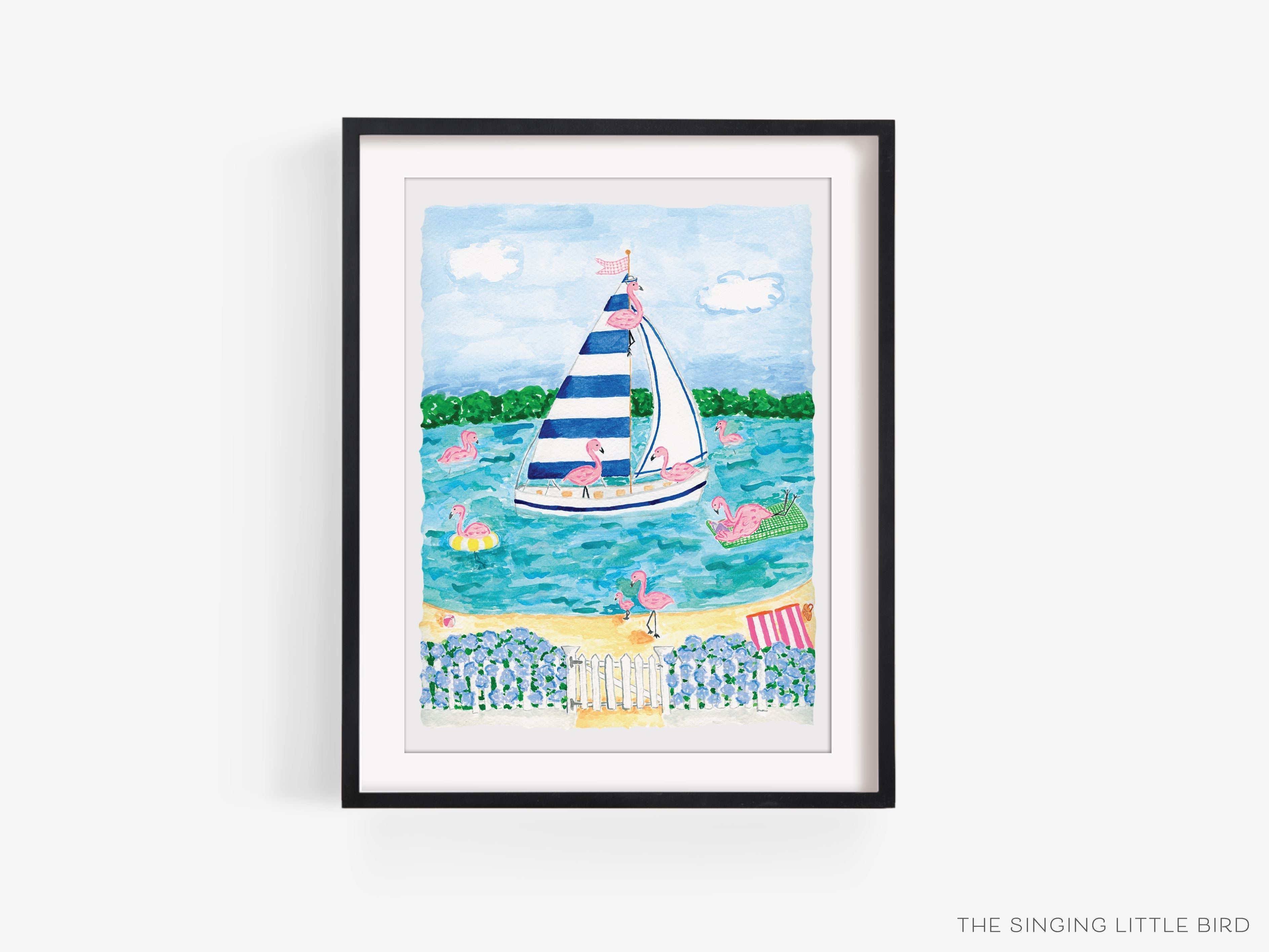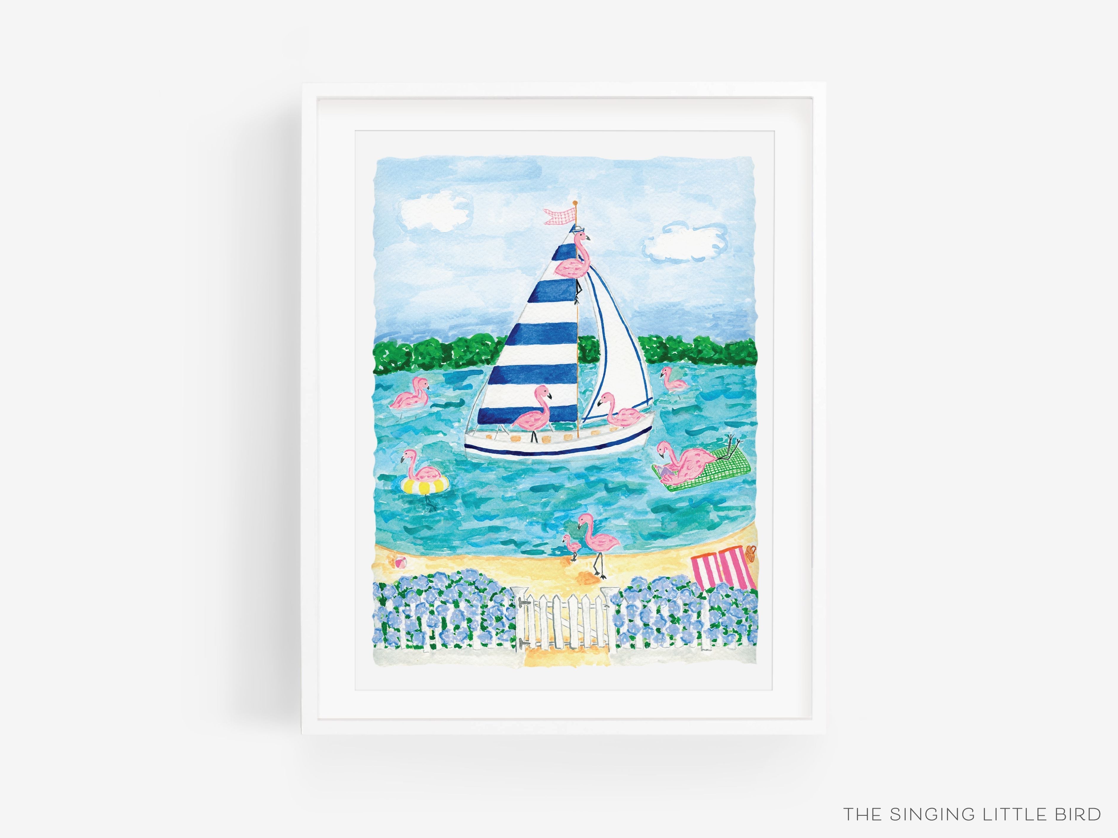 Flamingo Lake Art Print | Hand Painted Flock of Flamingos Art | Summer Lake Scene Watercolor | Blue and White Wall Art | Preppy Sailboat | Decor