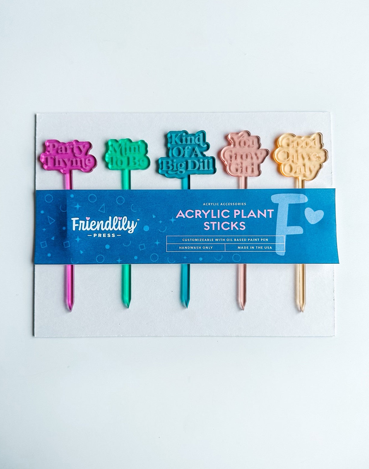 5 Piece acrylic plant stick set. Made of 1/8th inch acrylic and measure approximately 4.5" in height. Hand wash only. These are perfect for labeling your herbs indoor or outdoor. The perfect gift for a gardener! Always handle with care to prevent accidental breaking.