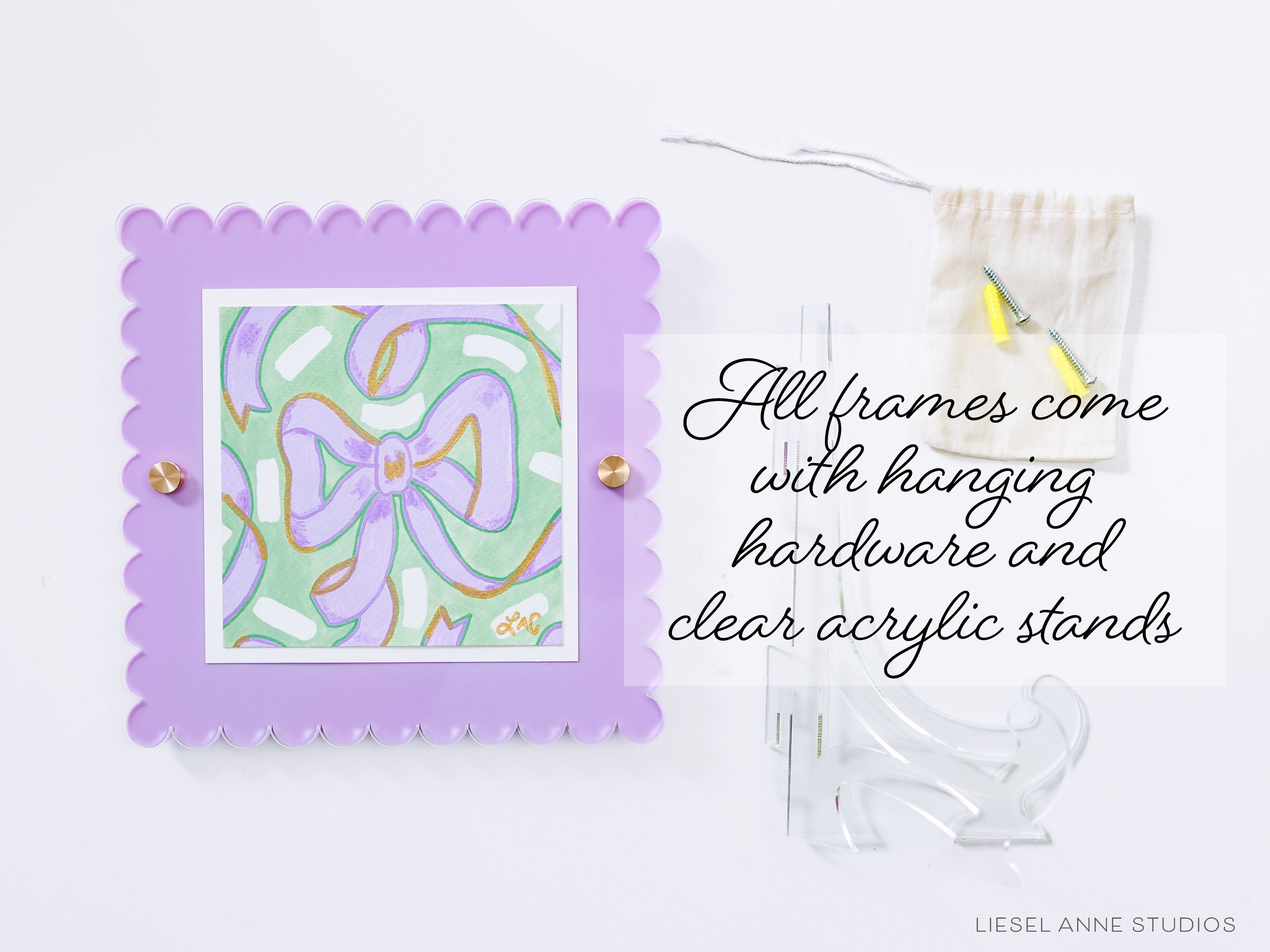 - Optional acrylic frame measures 8"x 8" (hanging hardware and clear acrylic stand are included with frame)