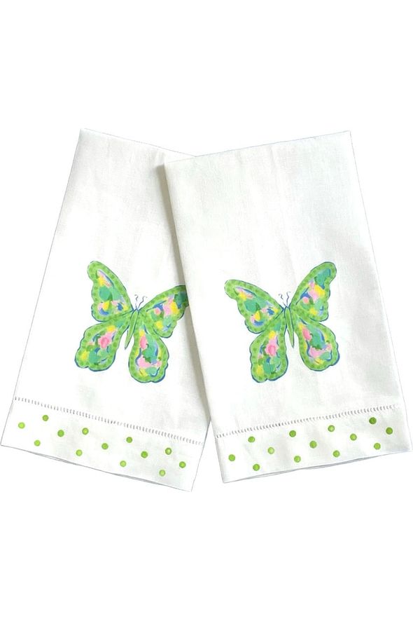 Fresh guest towels will brighten your powder room with a beautiful green mosaic butterfly design printed on white linen with hand painted polka dots. It is a great gift idea for a housewarming present and make a perfect hostess gift.
