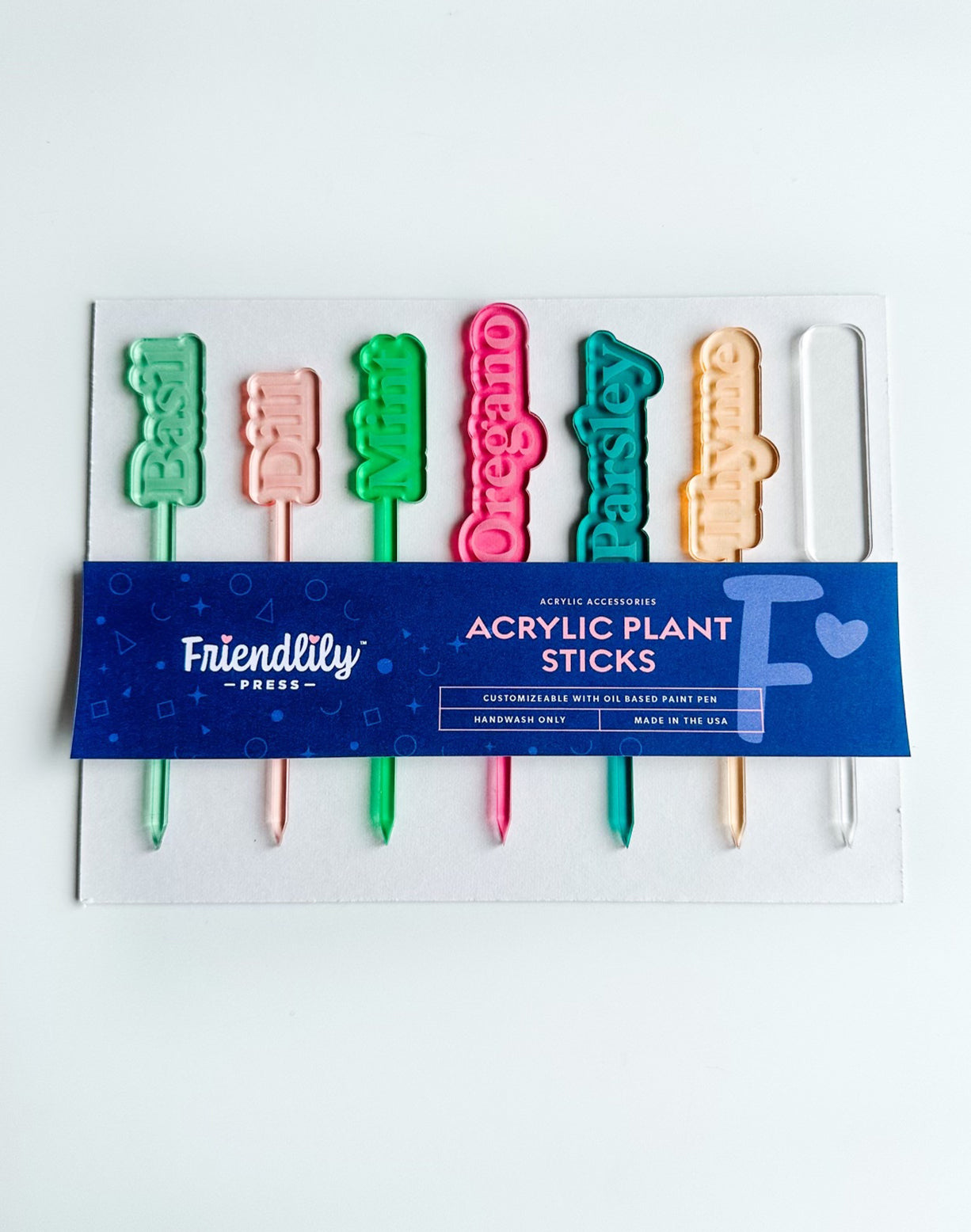 7 Piece acrylic plant stick set including one customizable stick to write in your own name! Made of 1/8th inch acrylic and measure approximately 4.5" in height. Hand wash only. These are perfect for labeling your herbs indoor or outdoor. The perfect gift for a gardener! Always handle with care to prevent accidental breaking.
