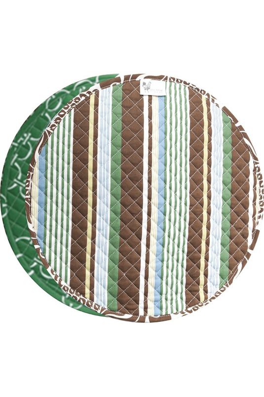 linked-up ivy green reversible bold striped chocolate brown printed round quilted cloth placemats