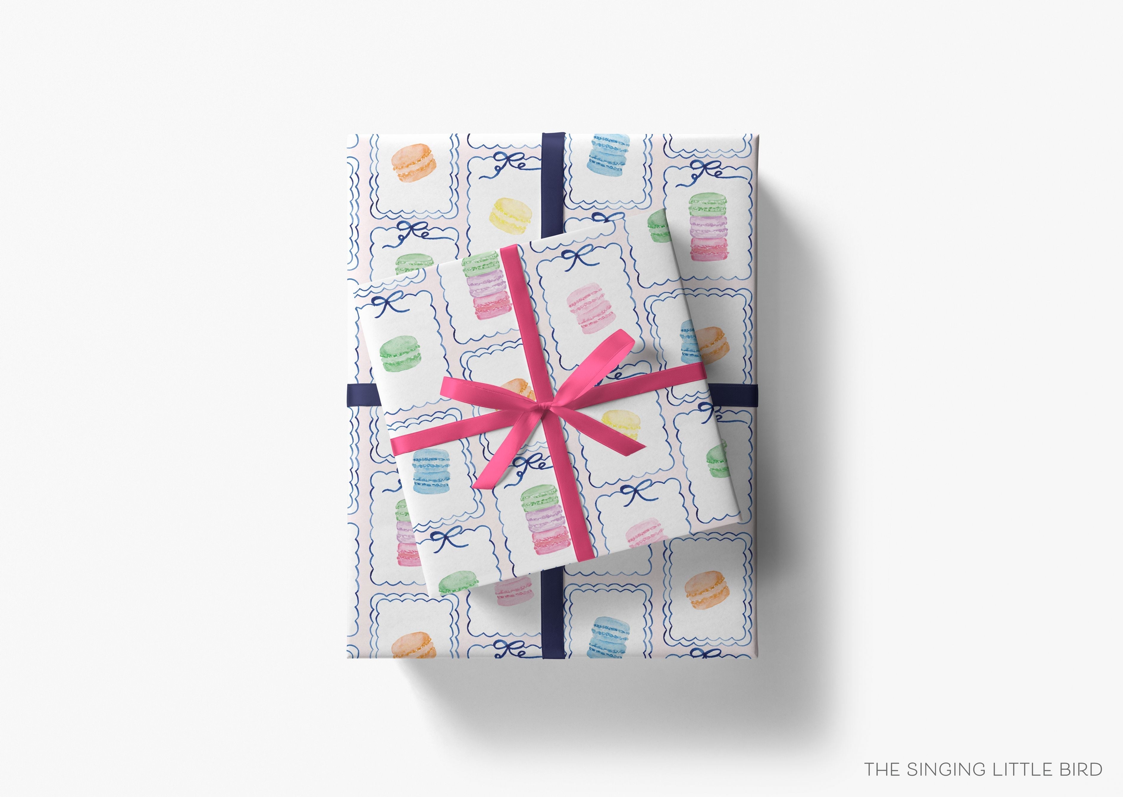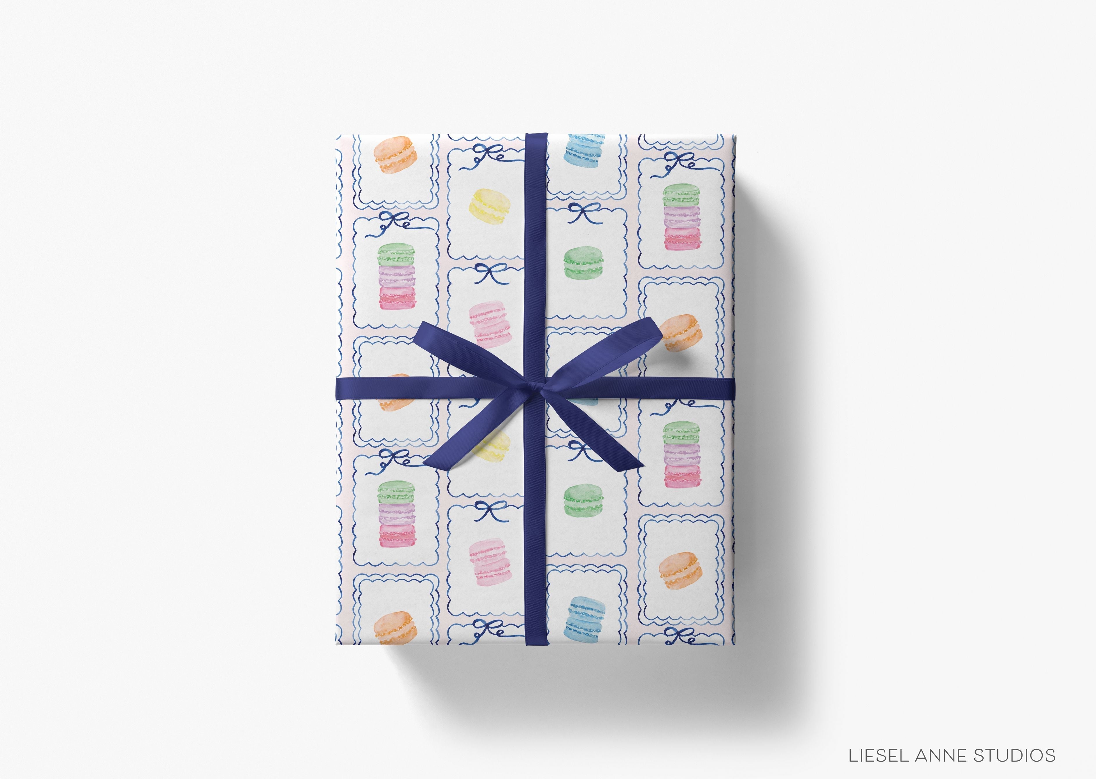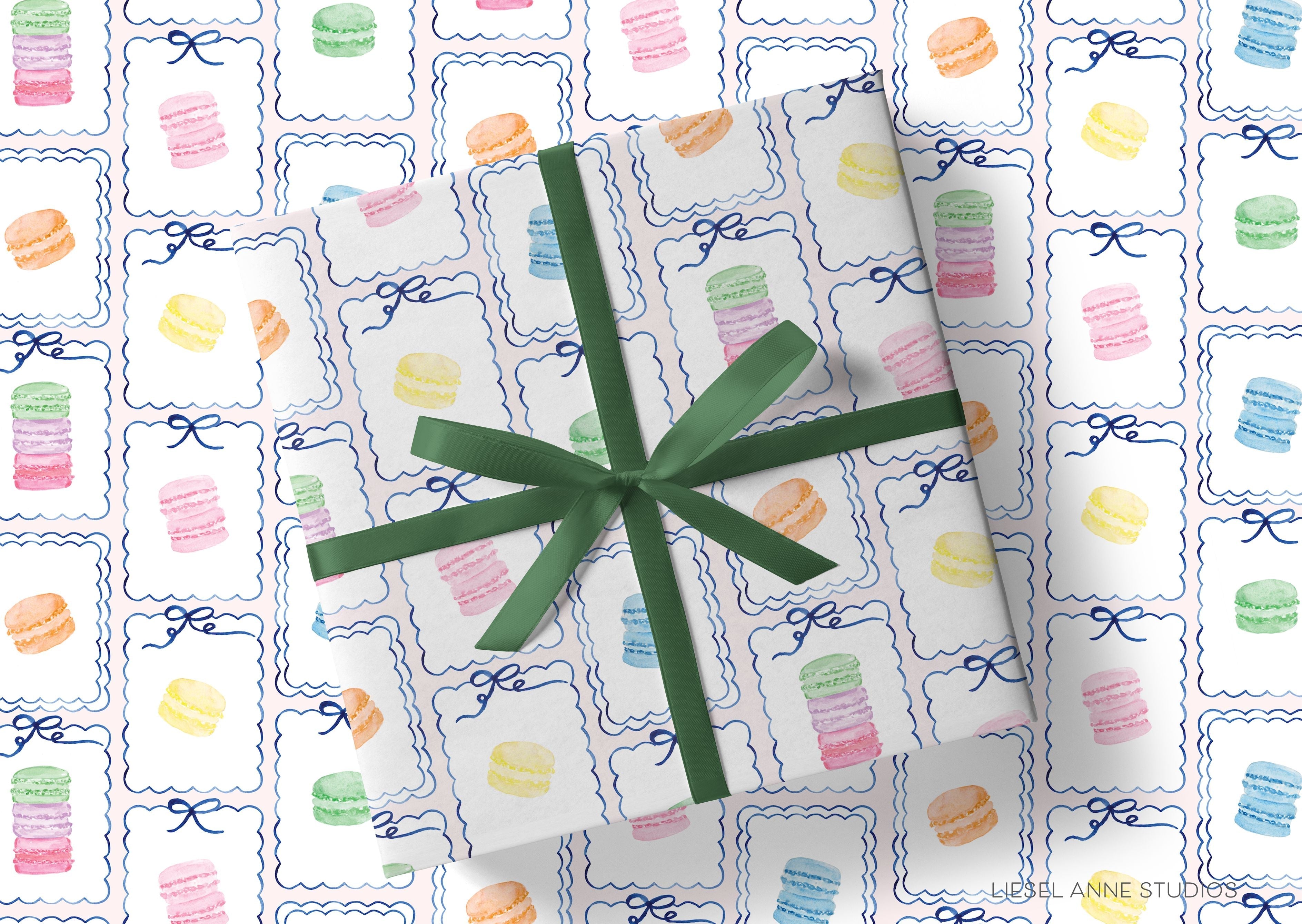 Macaron Gift Wrap | Pink Wrapping Paper | Happy Birthday Wrapping Paper | Parisian Gift | Blue Bow Celebration Paper | French Themed Shower