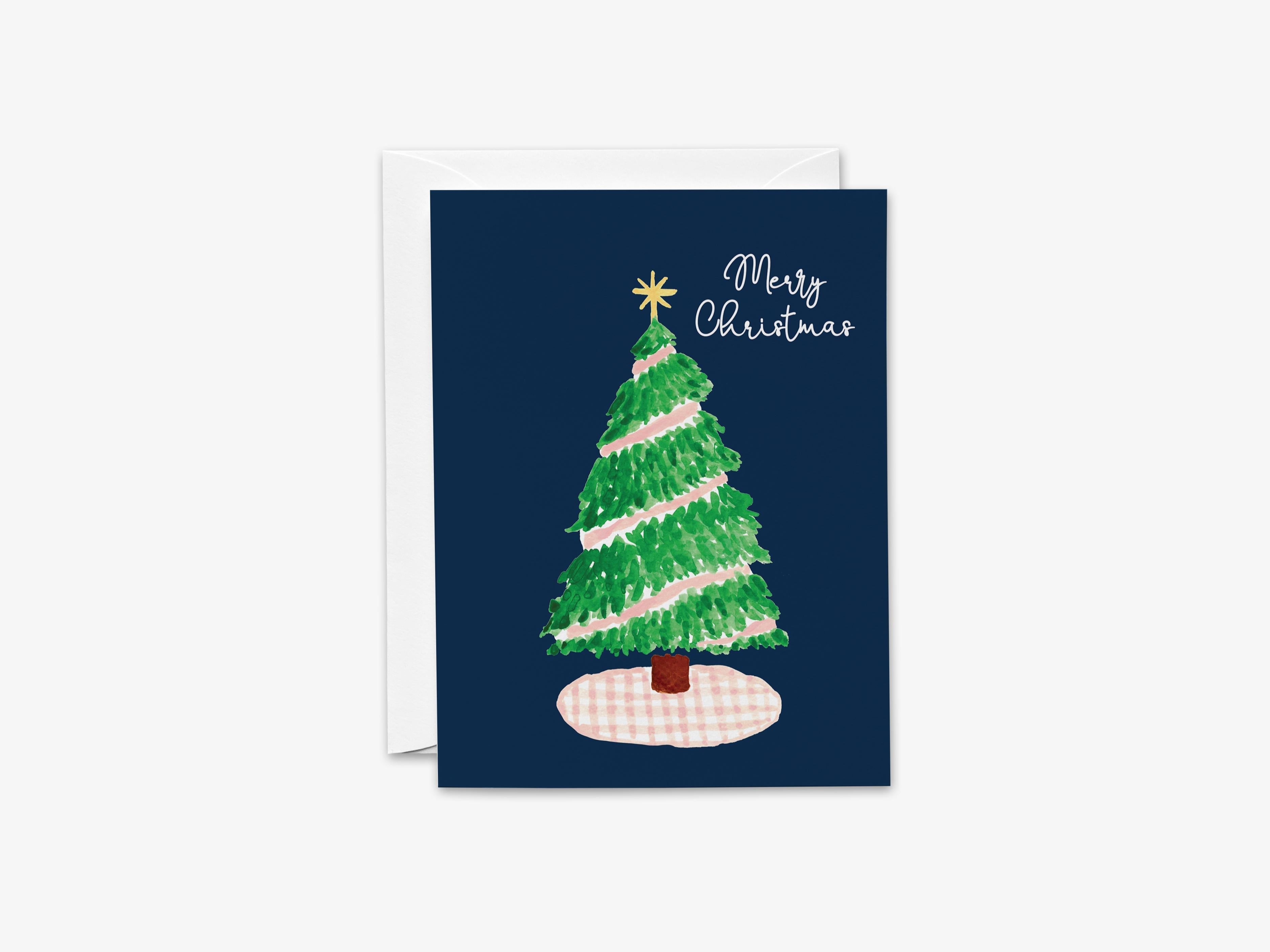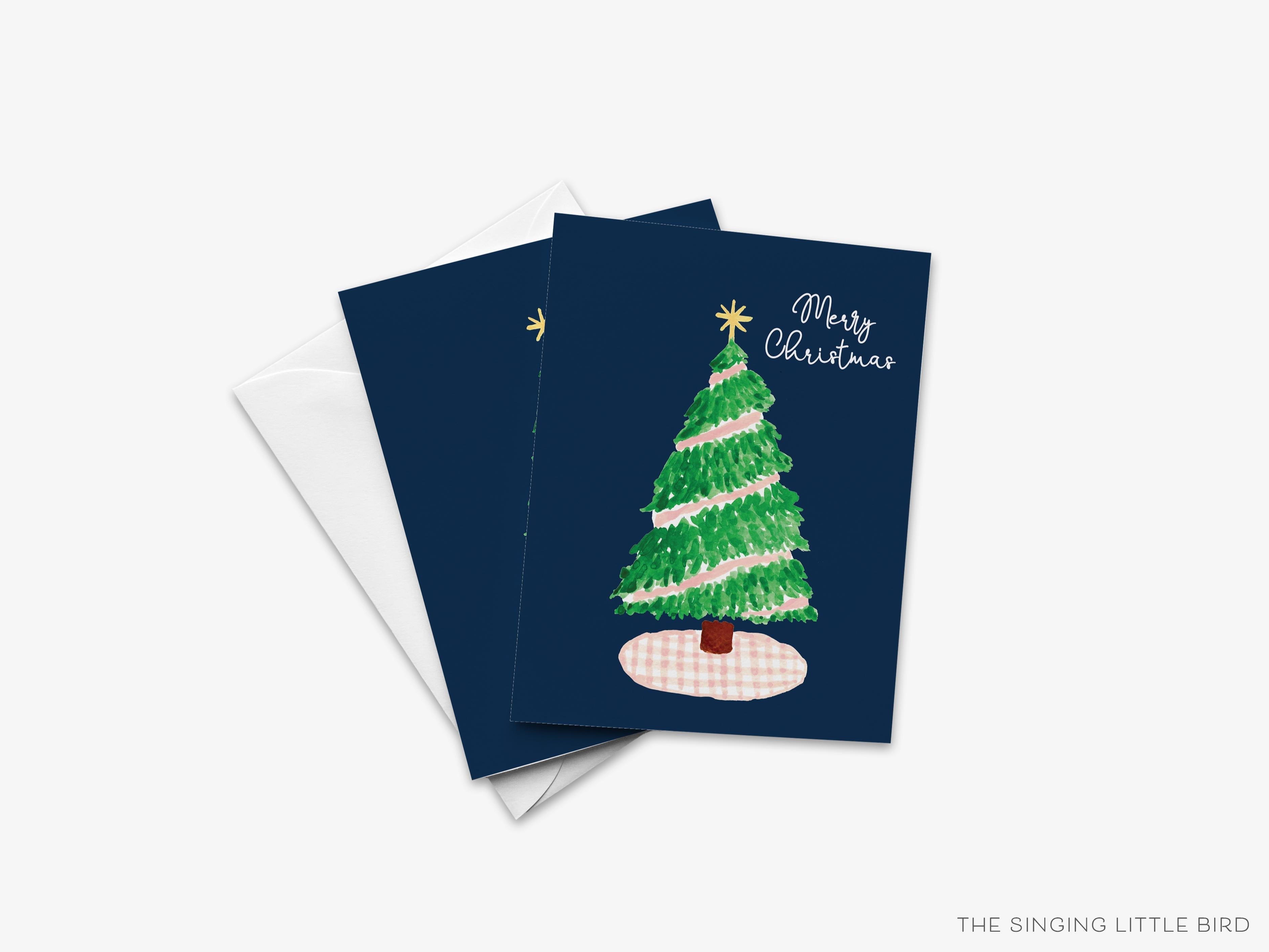 Merry Christmas Cards | Pink Gingham Tree Holiday Cards | Navy Christmas Card Set | Family Holiday Card | Cute Winter Cards | Preppy Cards