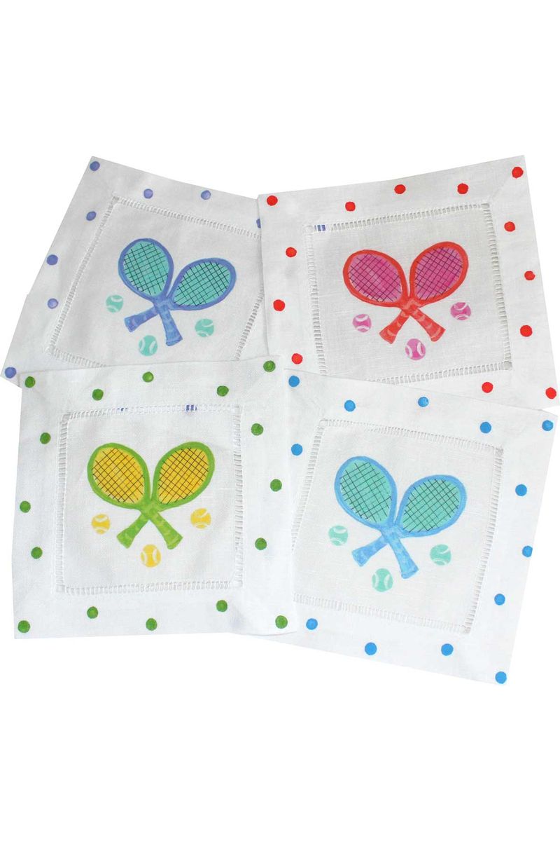 Serve up these custom designed multi color tennis racquet linen cocktail napkins. The perfect complement to any beverage. Having the option to personalize them makes them a great hostess, housewarming, and birthday gift idea for the tennis lover