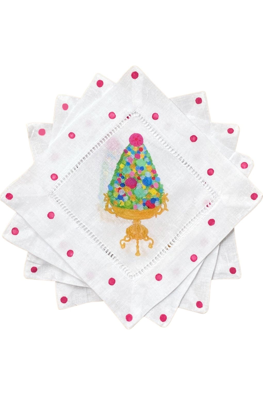 Inspired by the creative team of Parker Kennedy Living's beautiful ornament topiraries they make every year. Set of 4 Linen cocktail napkins with a colorful ornament topiary on a beautiful brass bowl with a hot pink polka dot border. Perfect addition to a cocktail party.