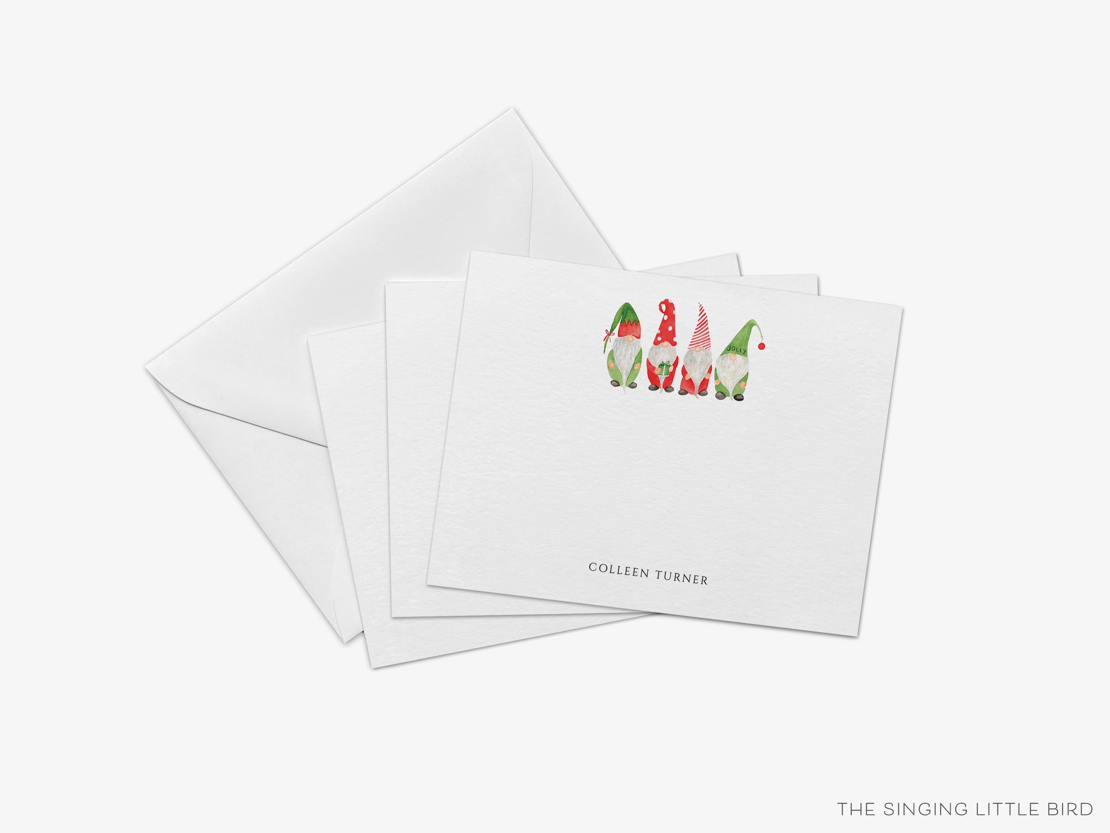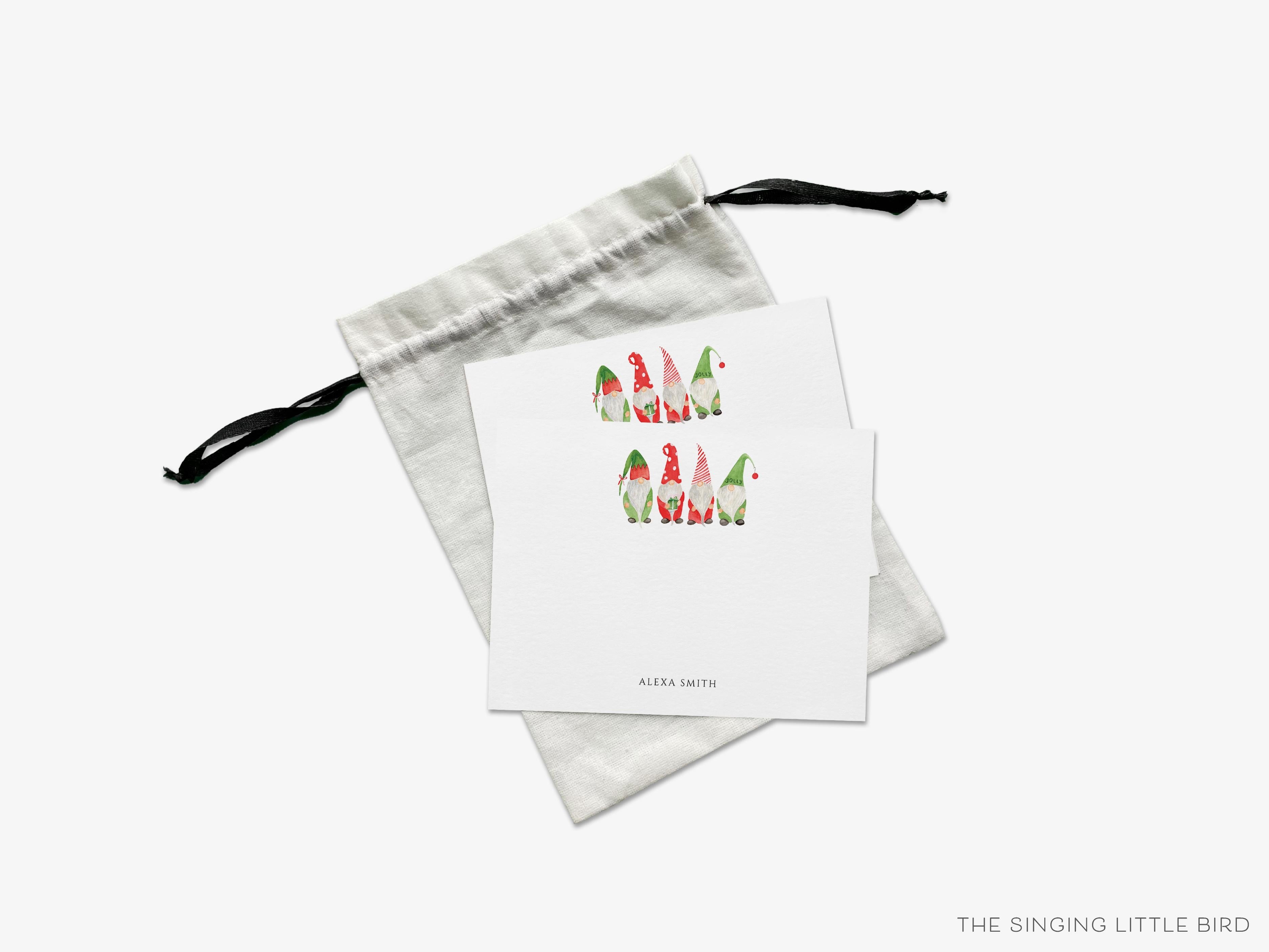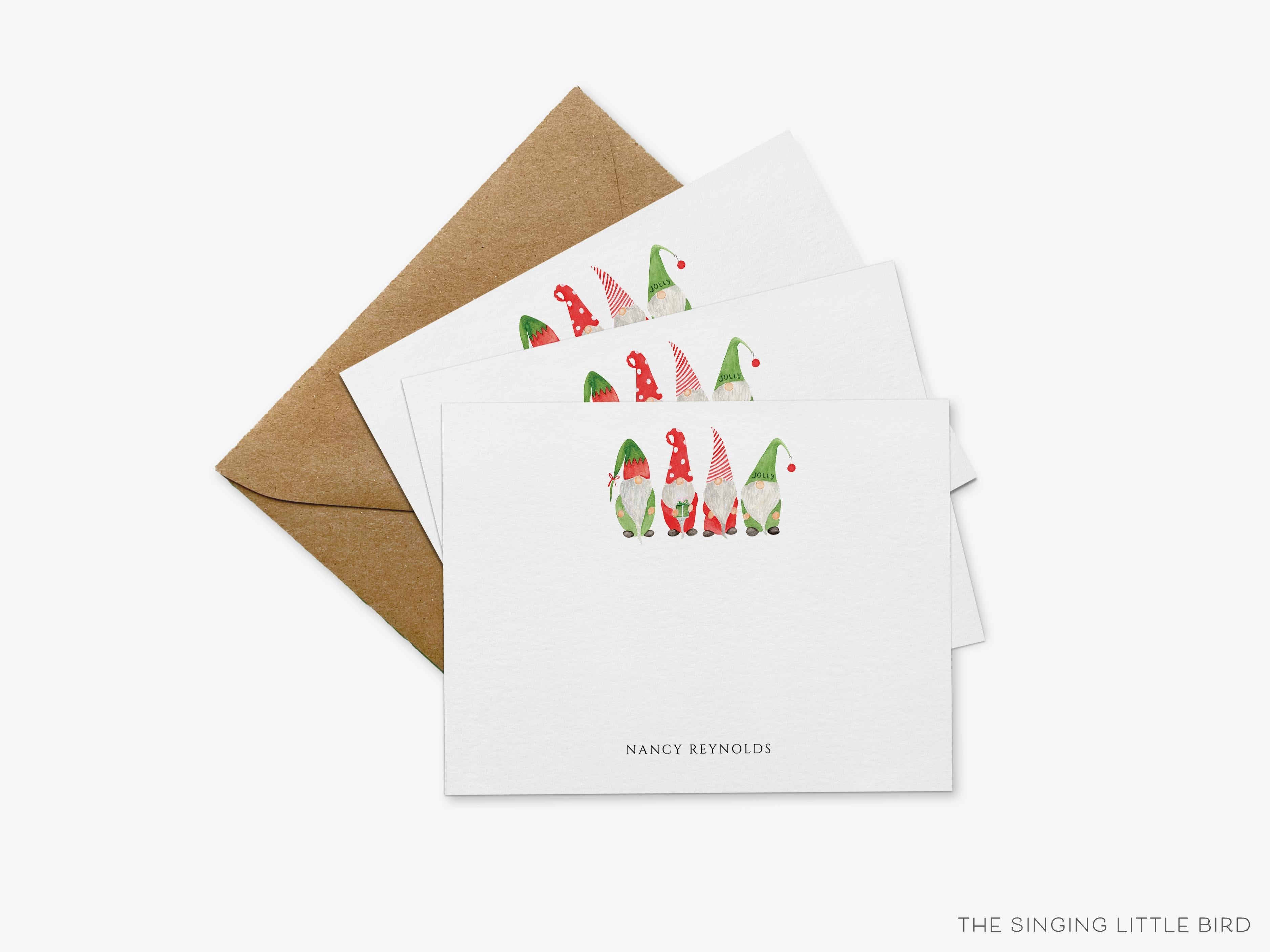 • Sets of Personalized Christmas Gnome Flat Note Cards + White or Kraft Envelopes