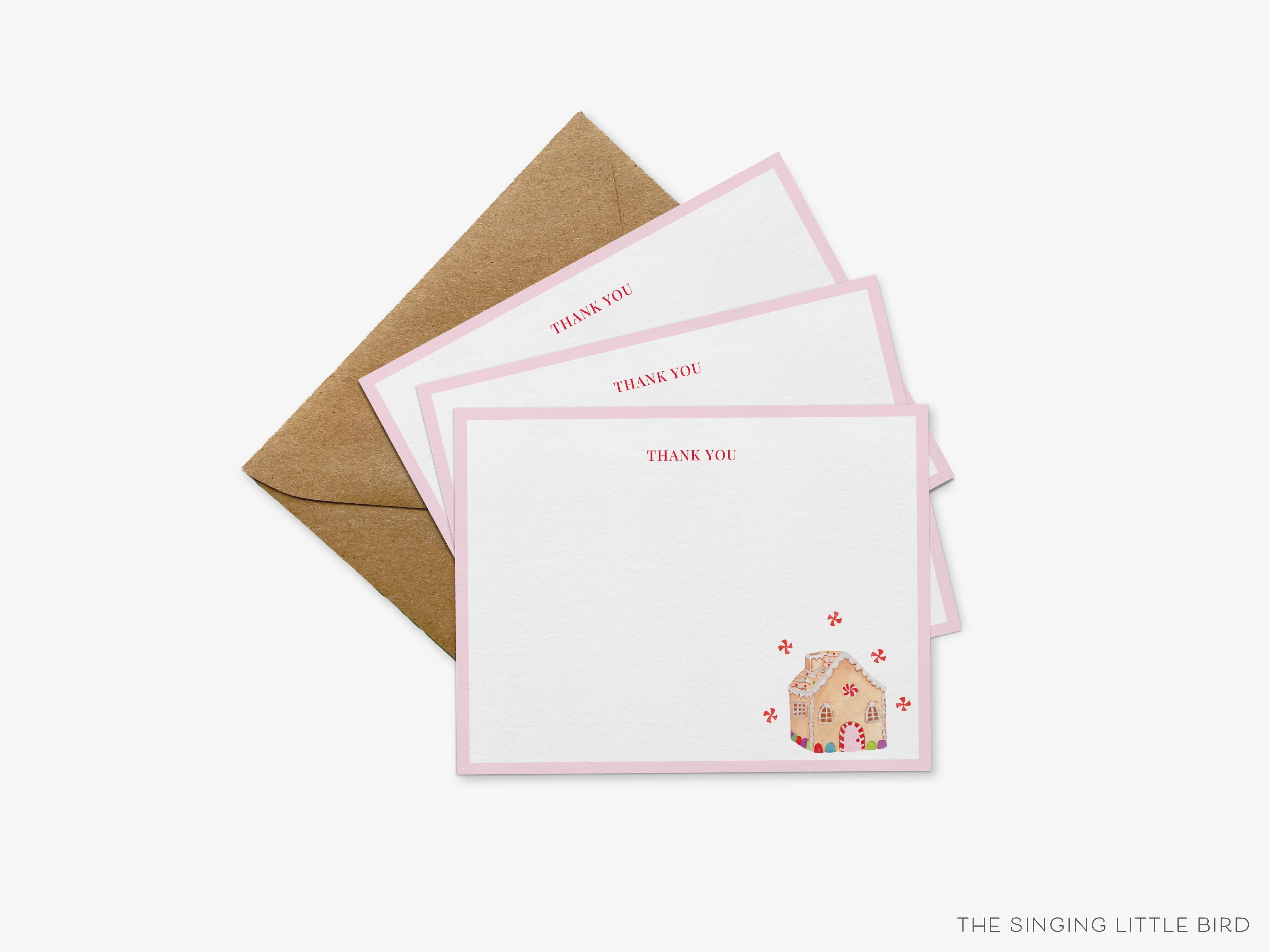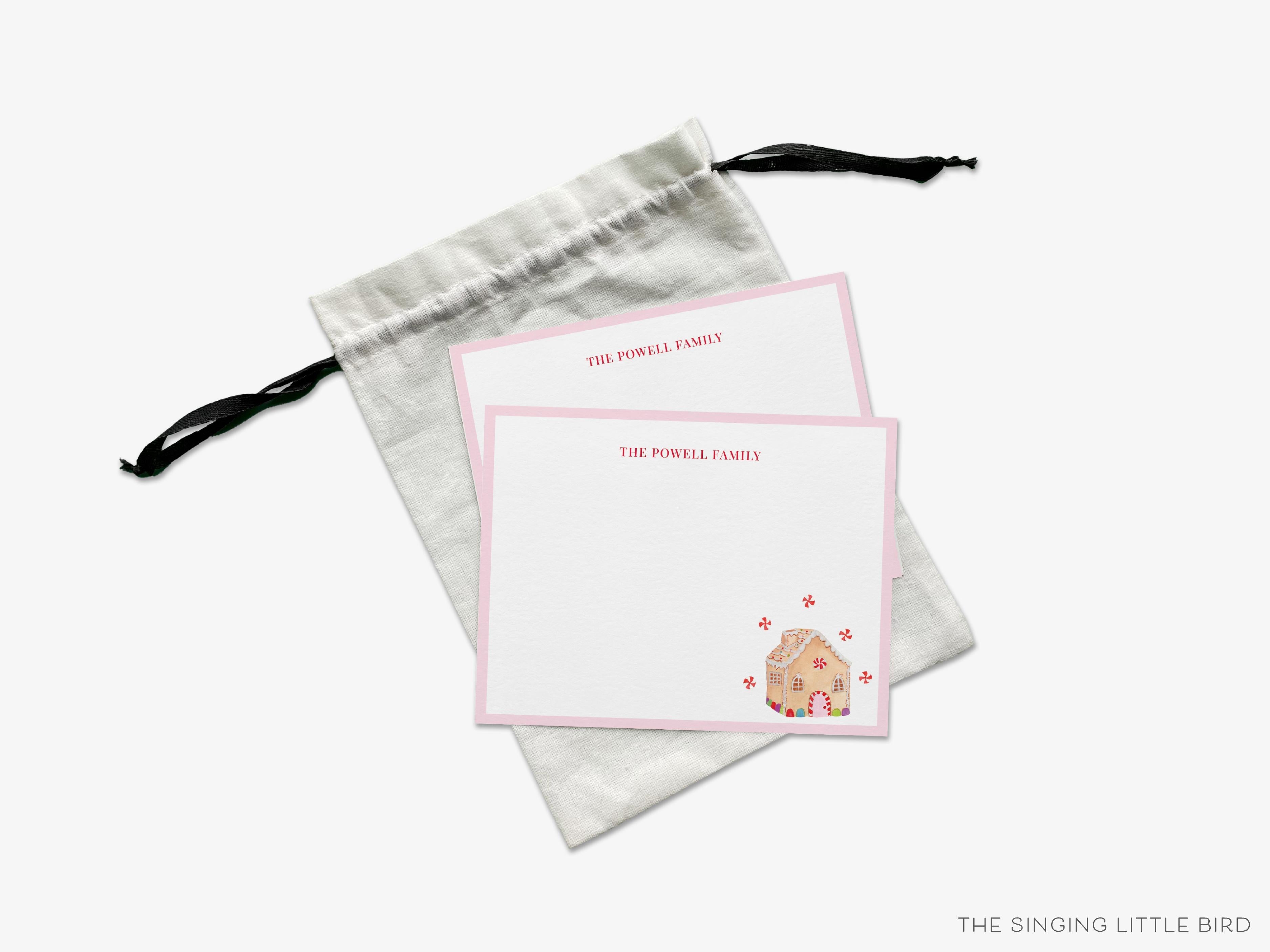 • Sets of Personalized Gingerbread House Christmas Flat Note Cards + White or Kraft Envelopes