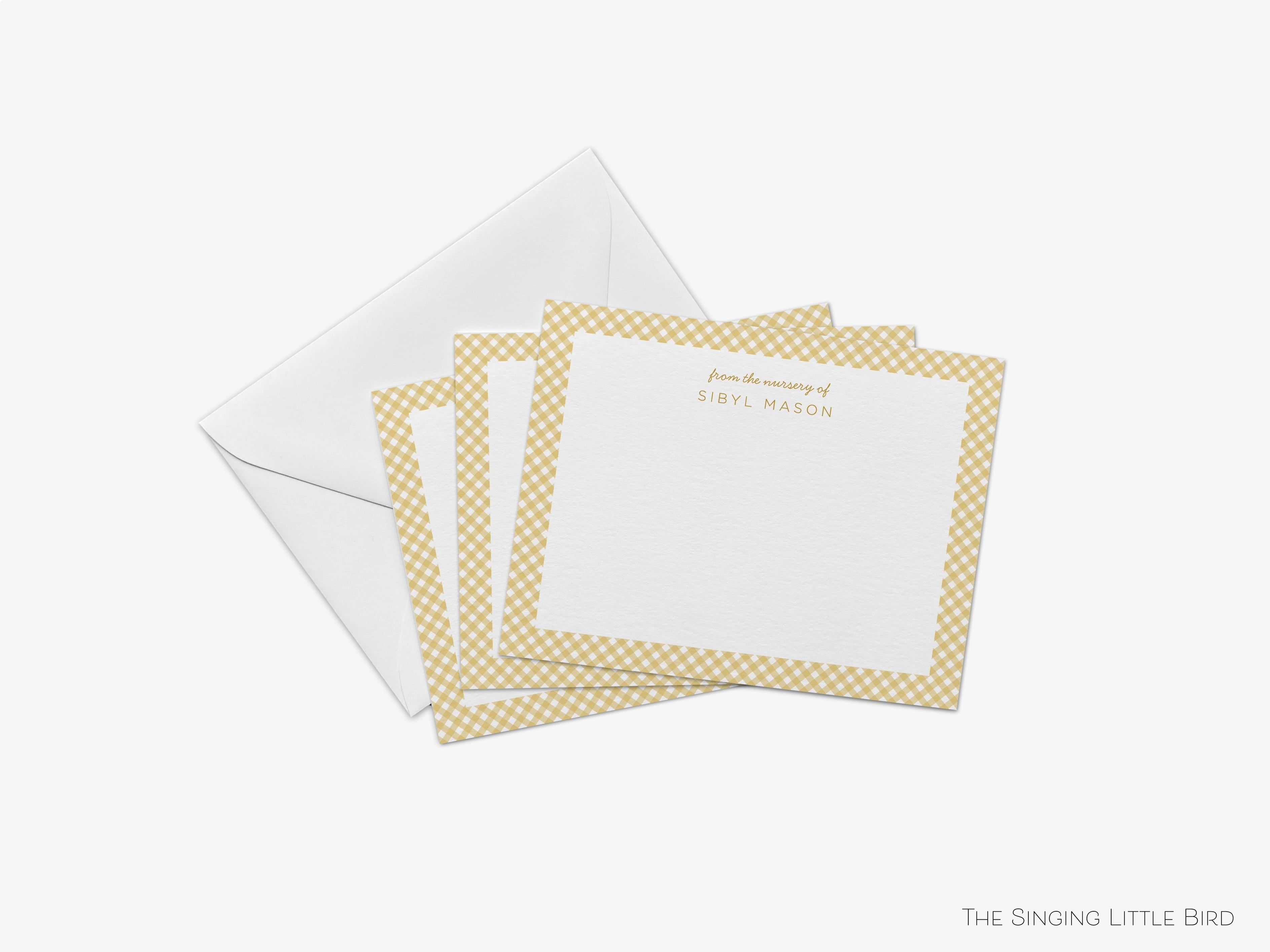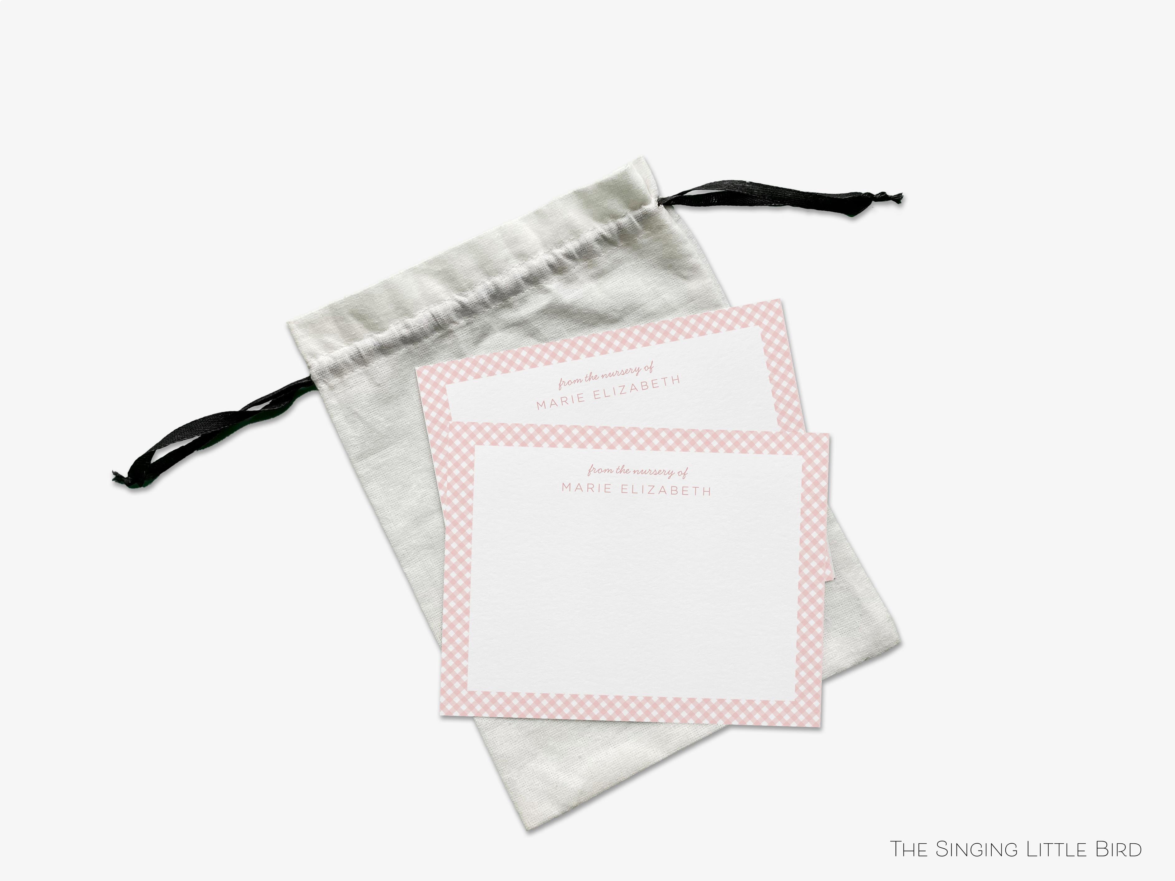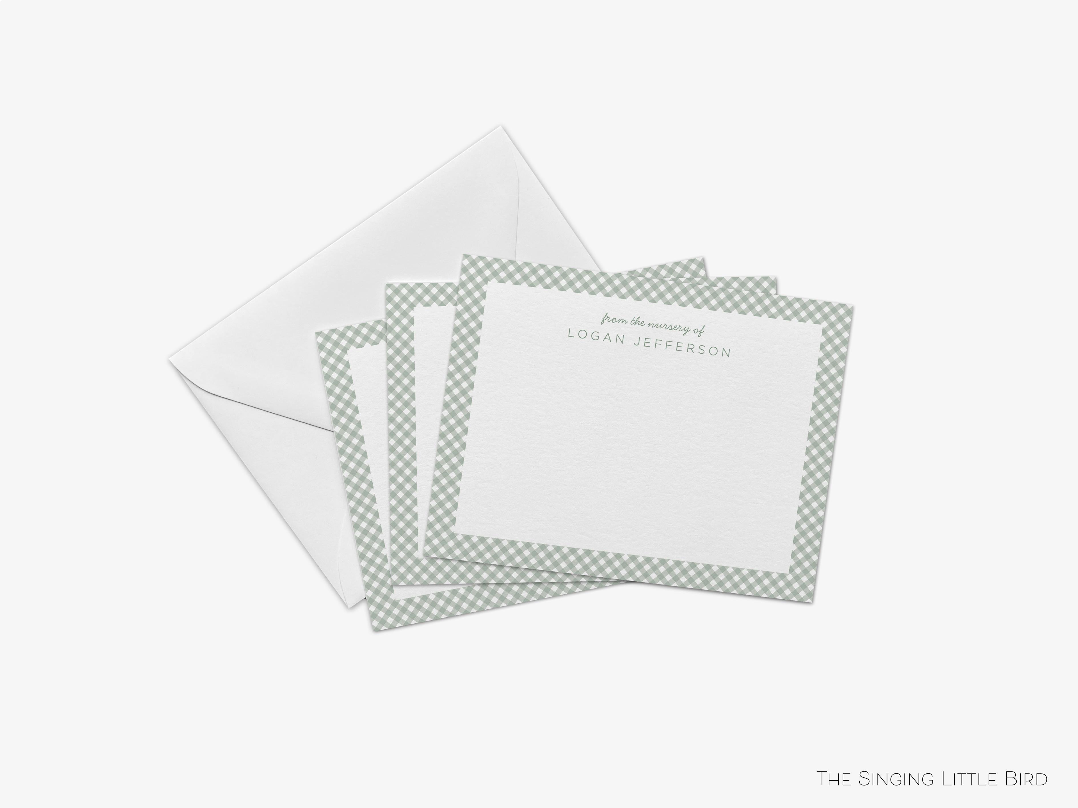 • Sets of Personalized Gingham Nursery Flat Note Cards + White or Kraft Envelopes