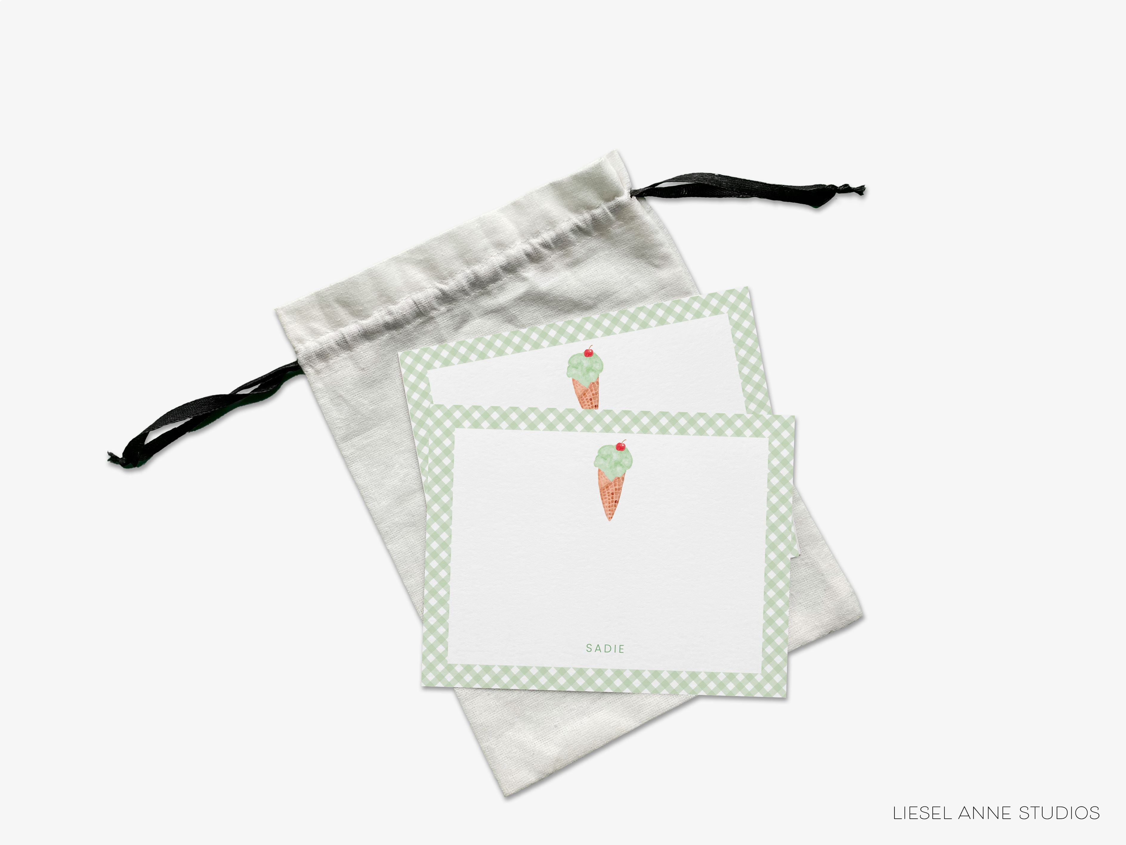• Sets of Personalized Green Ice Cream Flat Note Cards + White or Kraft Envelopes