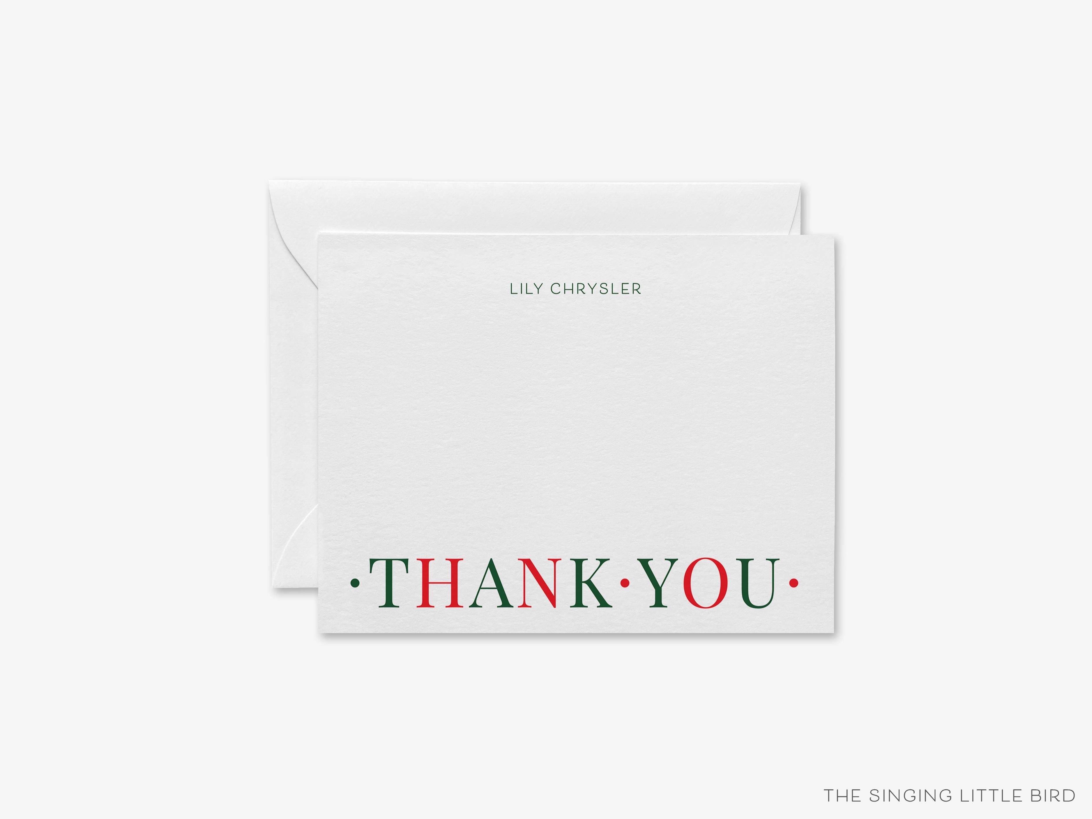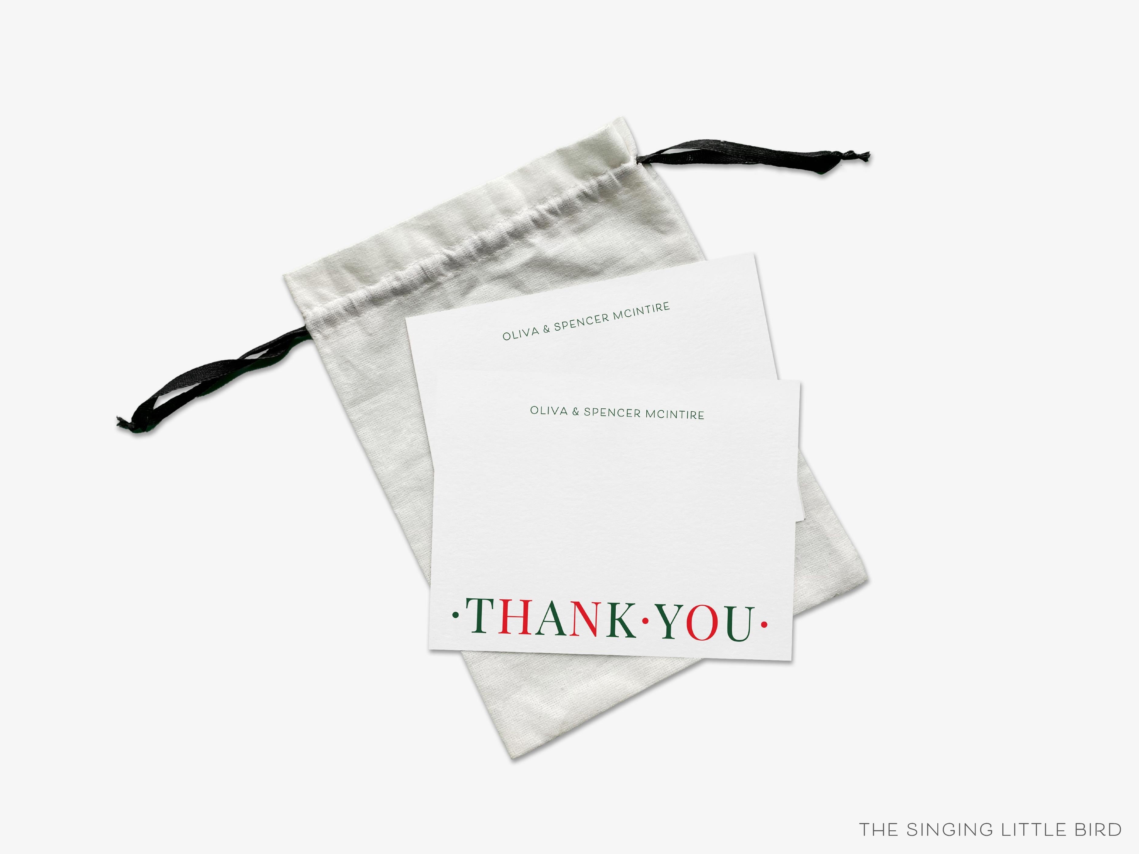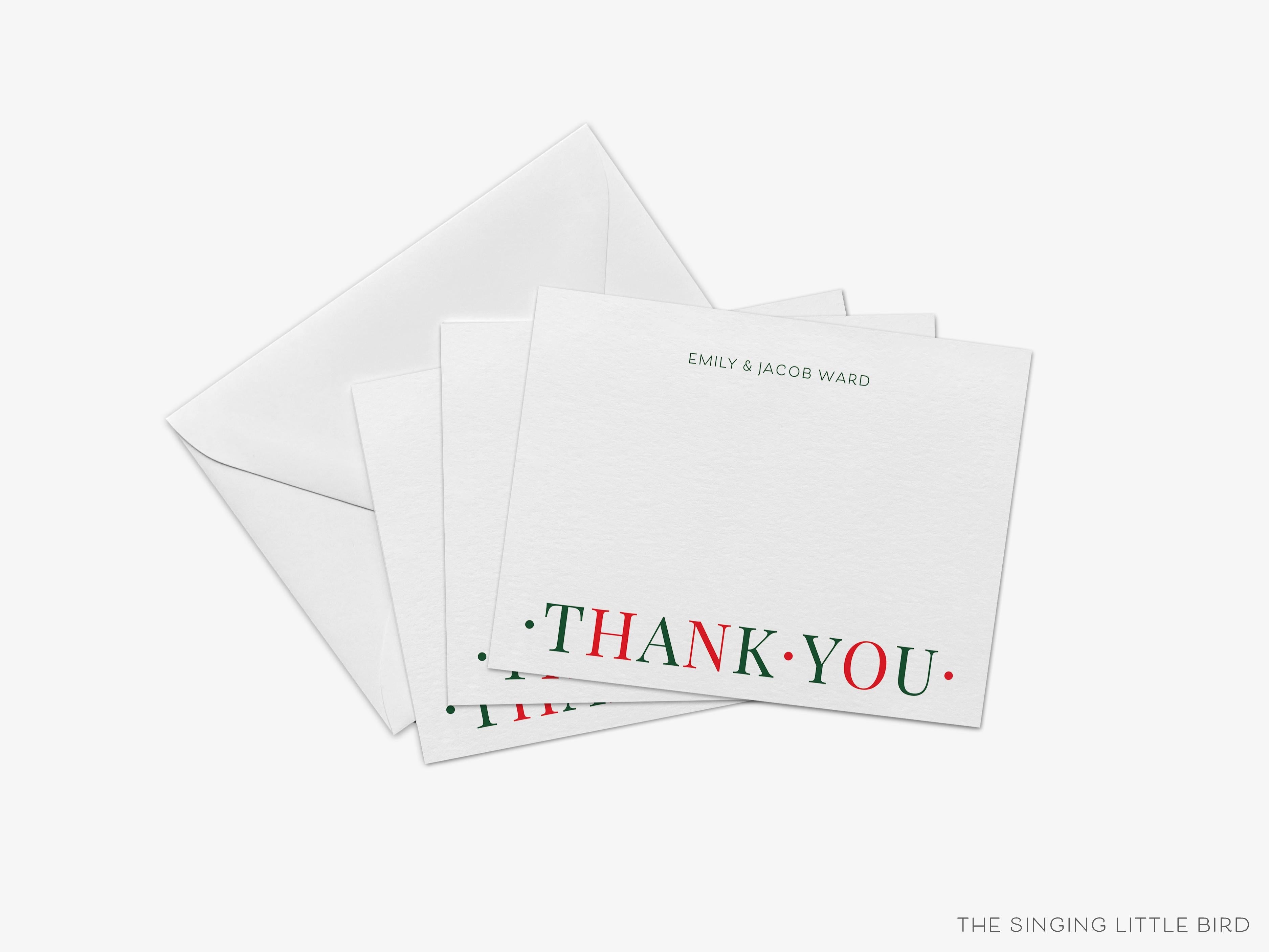 • Sets of Personalized Christmas Thank You Flat Note Cards + White or Kraft Envelopes