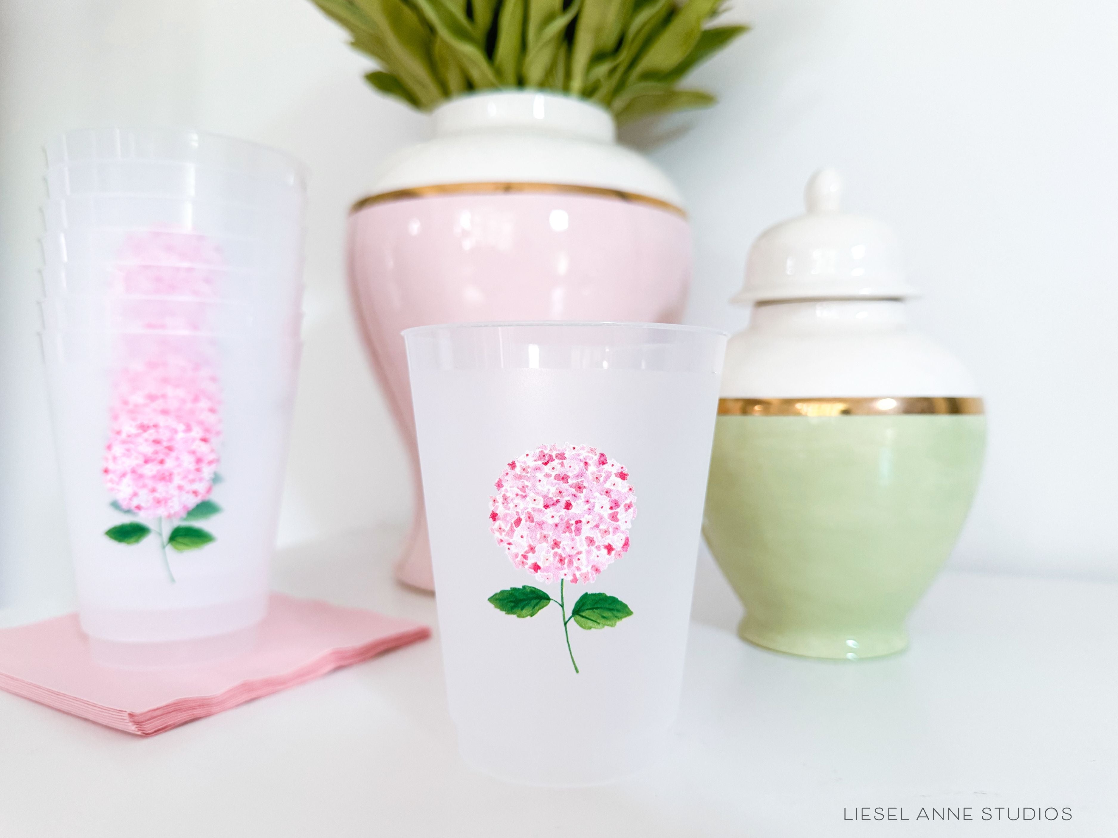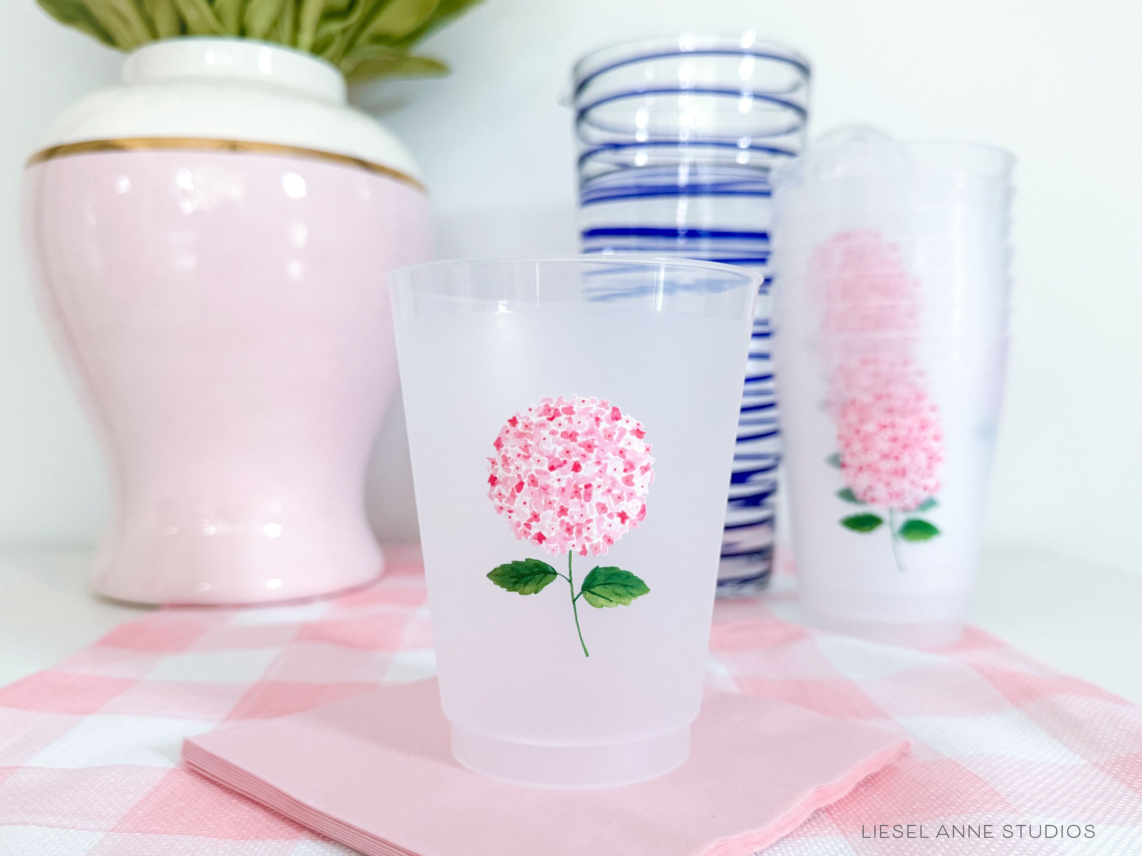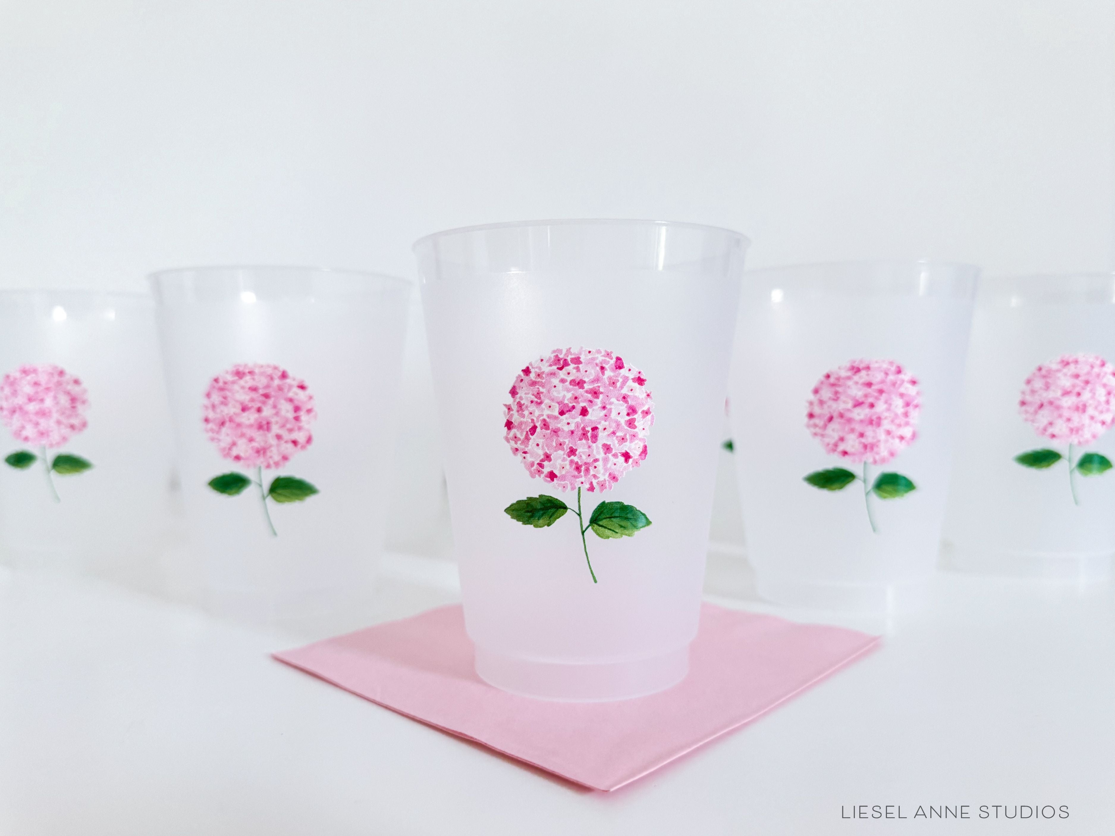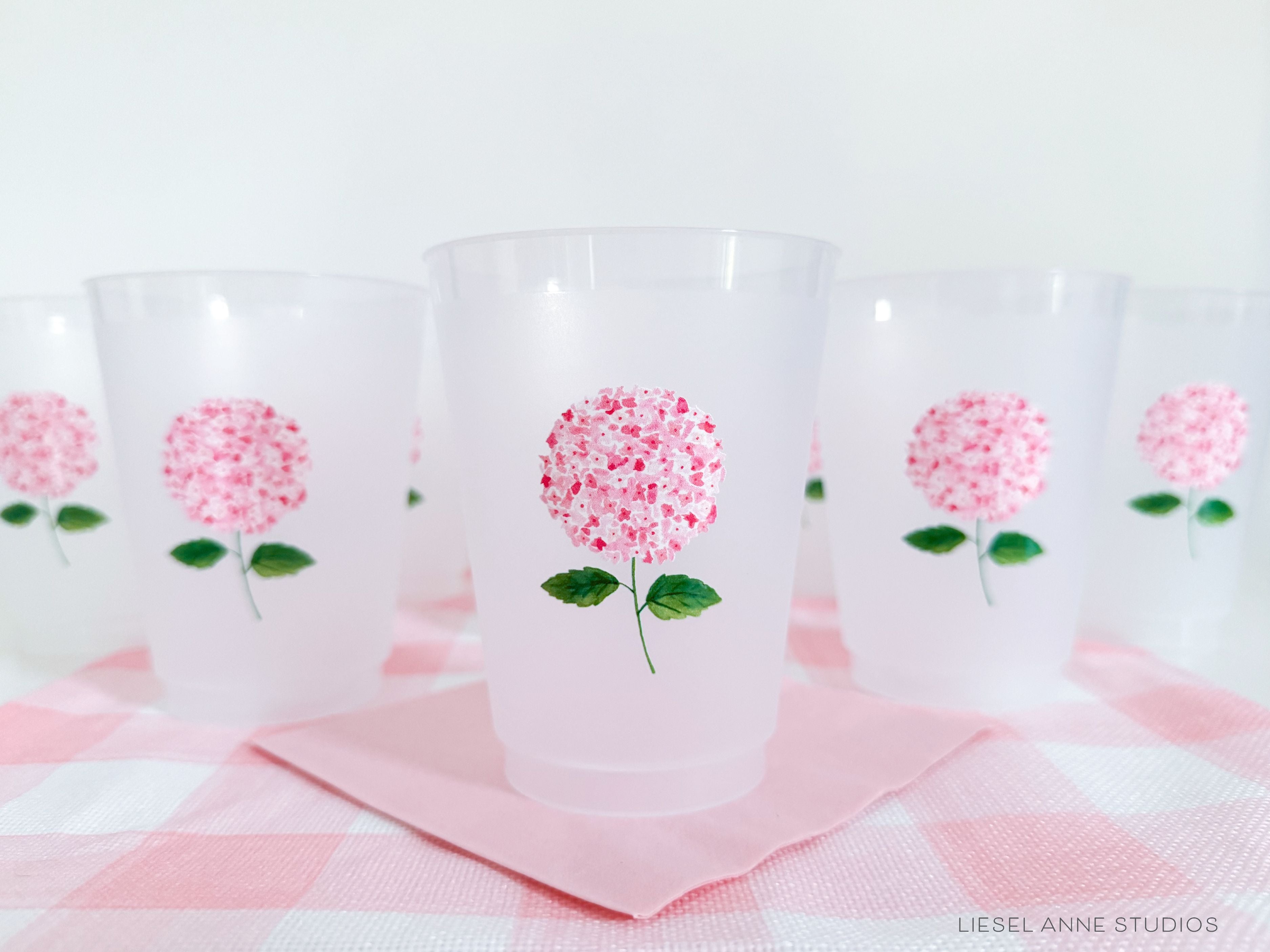 Pink Hydrangea Frosted Shatterproof Cups | Set of 8 | Reusable Bridal Shower Baby Shower Party Cups | Bachelorette Wedding Cups | 16oz Floral Cup