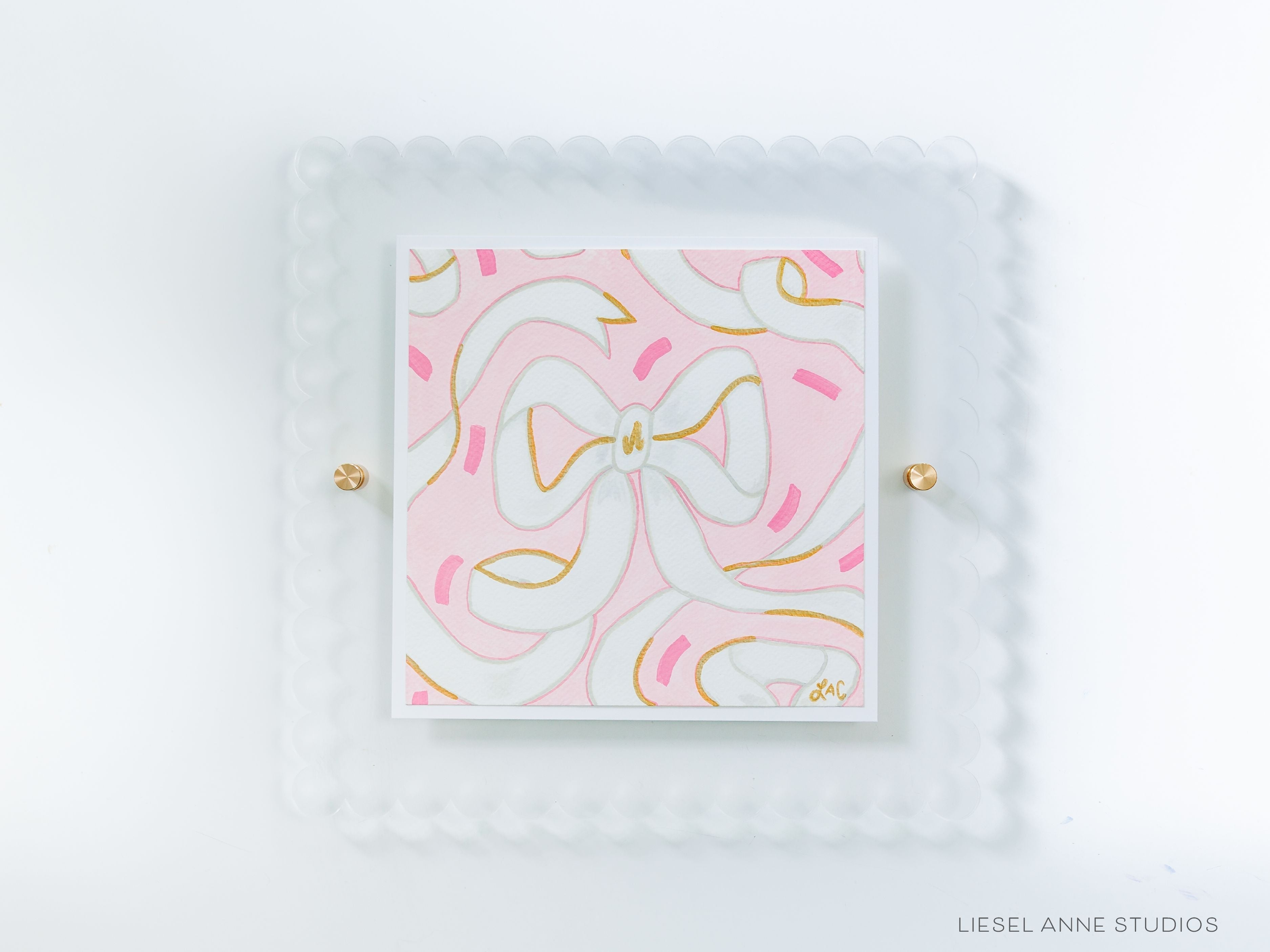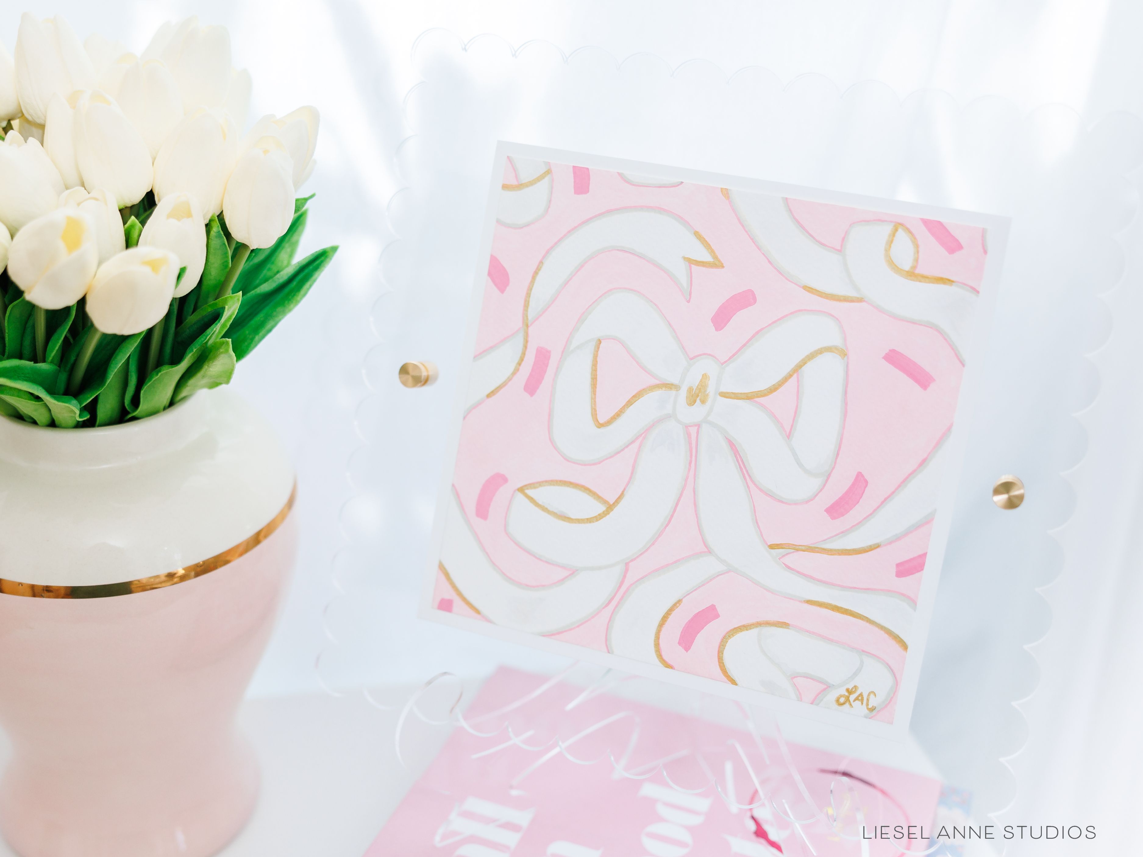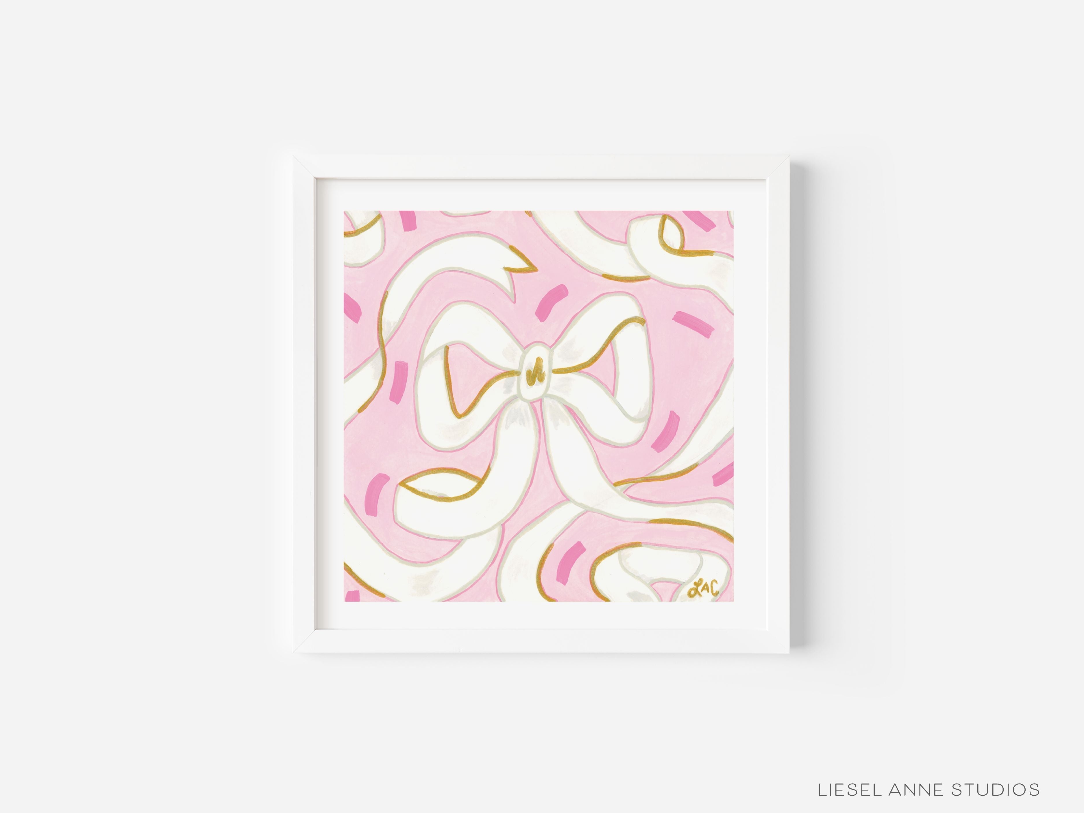 - The print features our signature White golden bows with a light pink base and hand painted gold embellishments