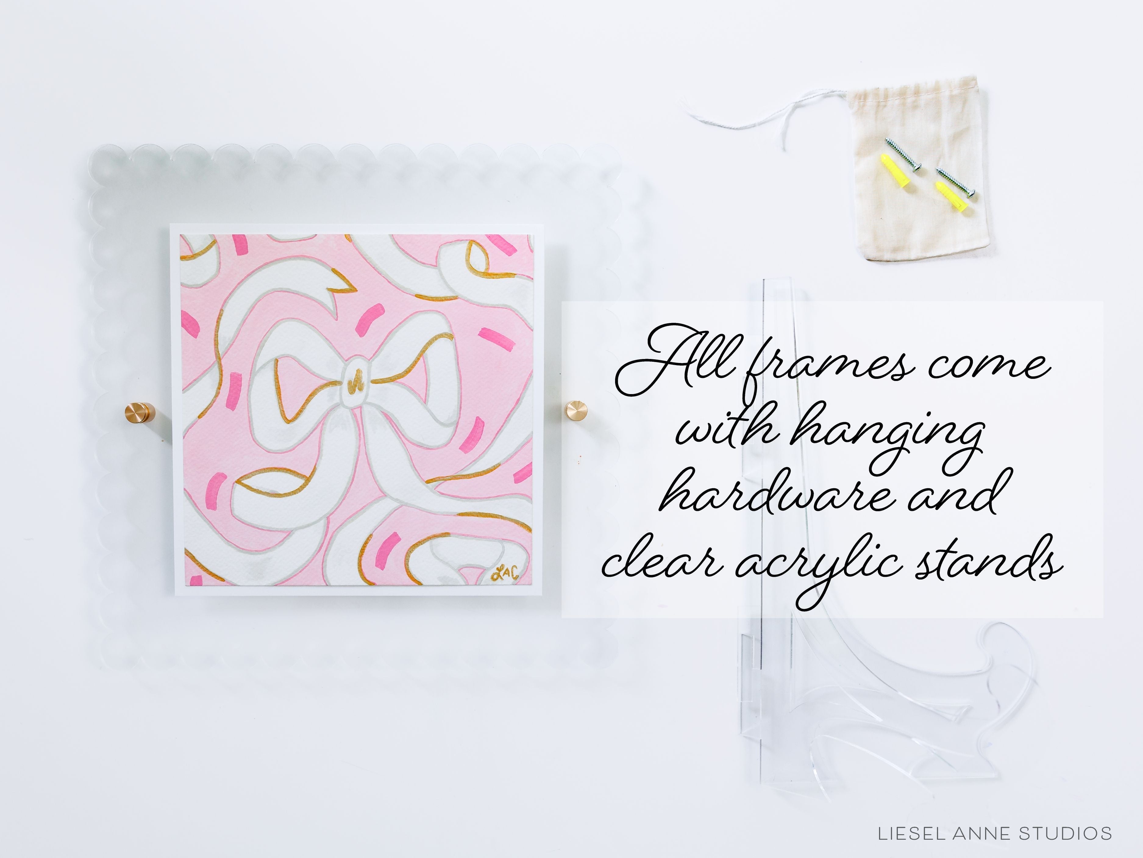 - Optional acrylic frame measures 12"x 12" (hanging hardware and clear acrylic stand are included with frame)