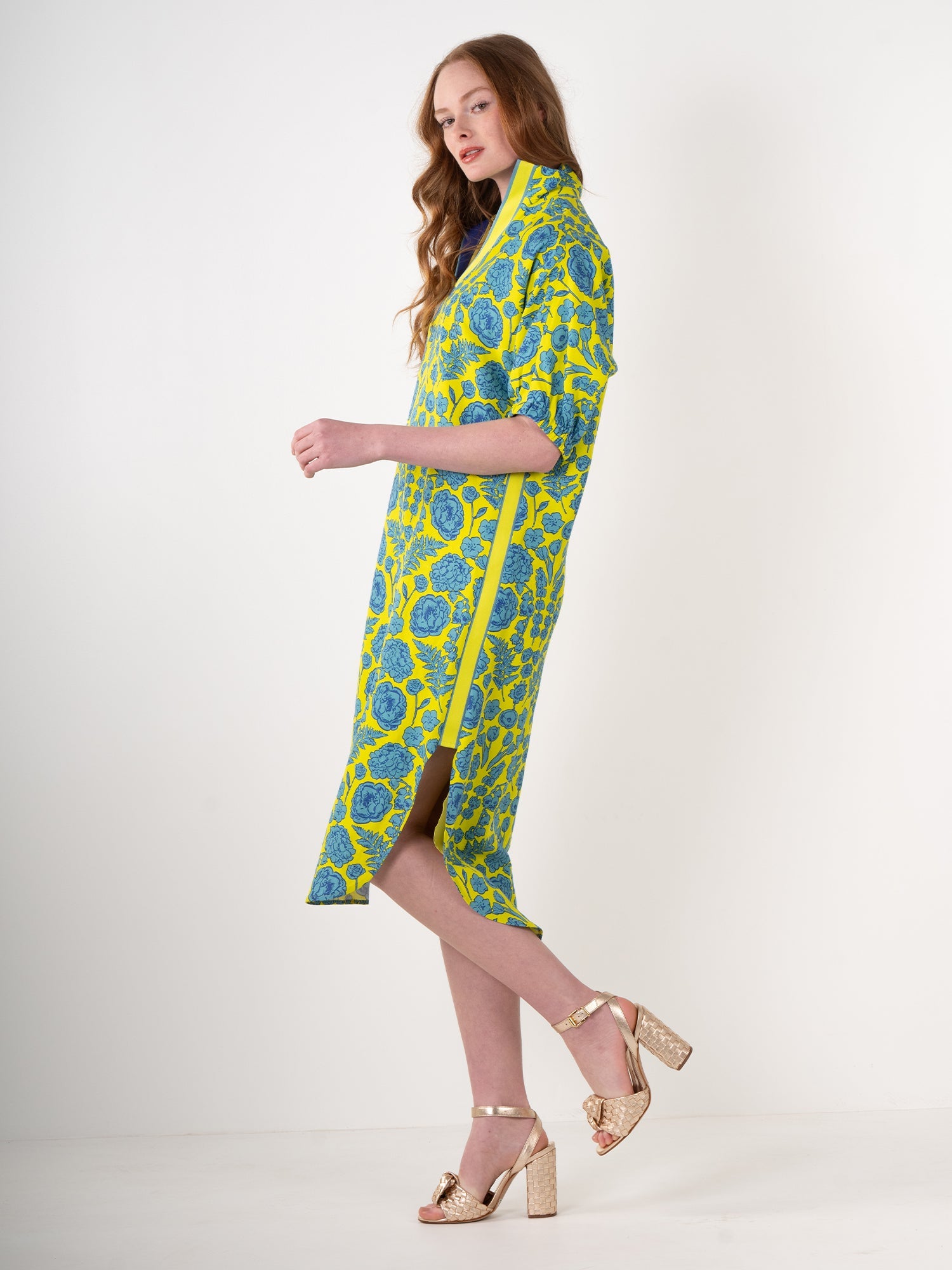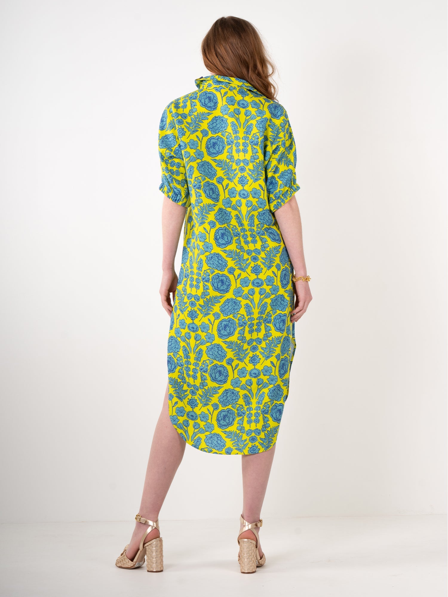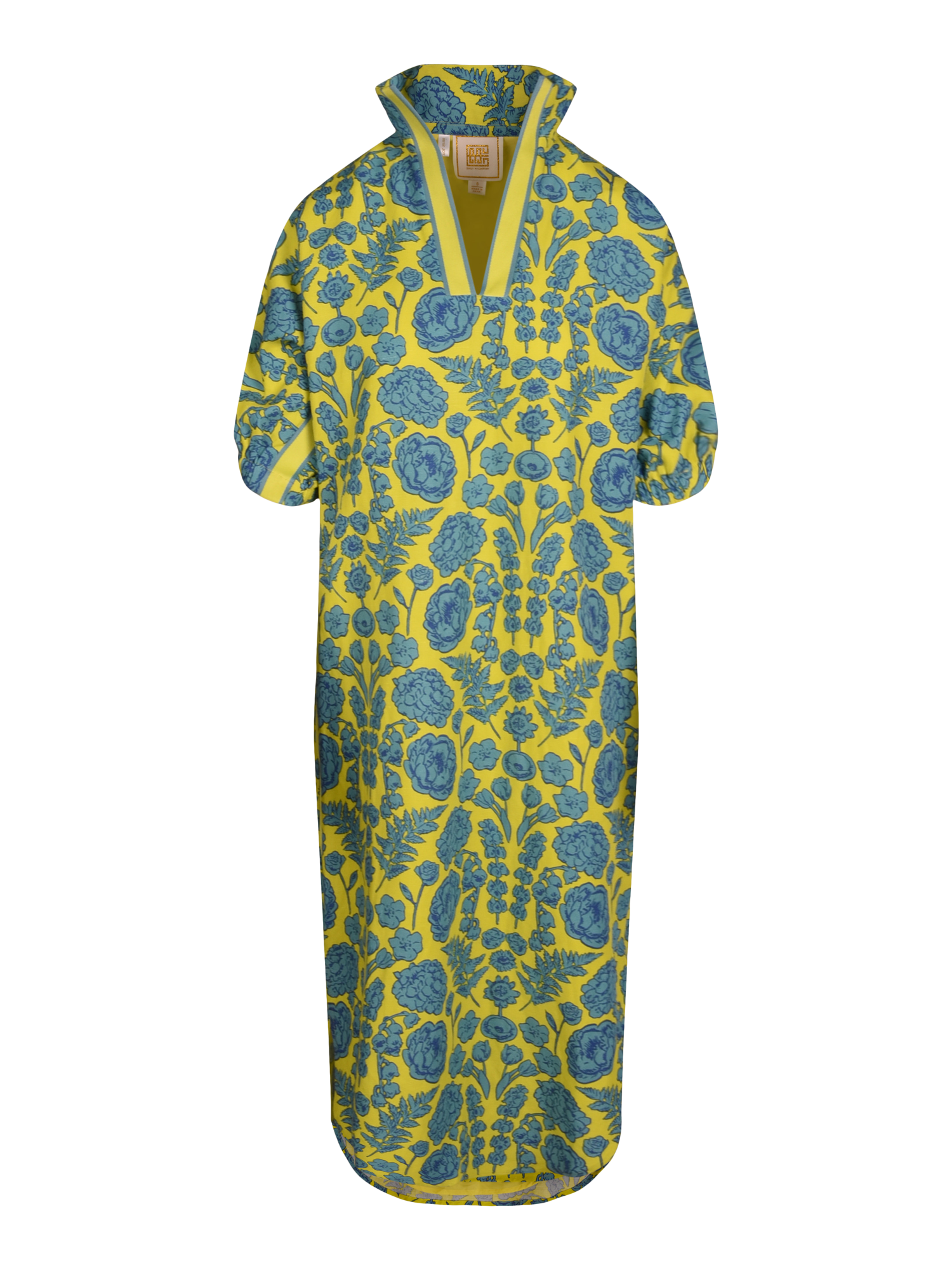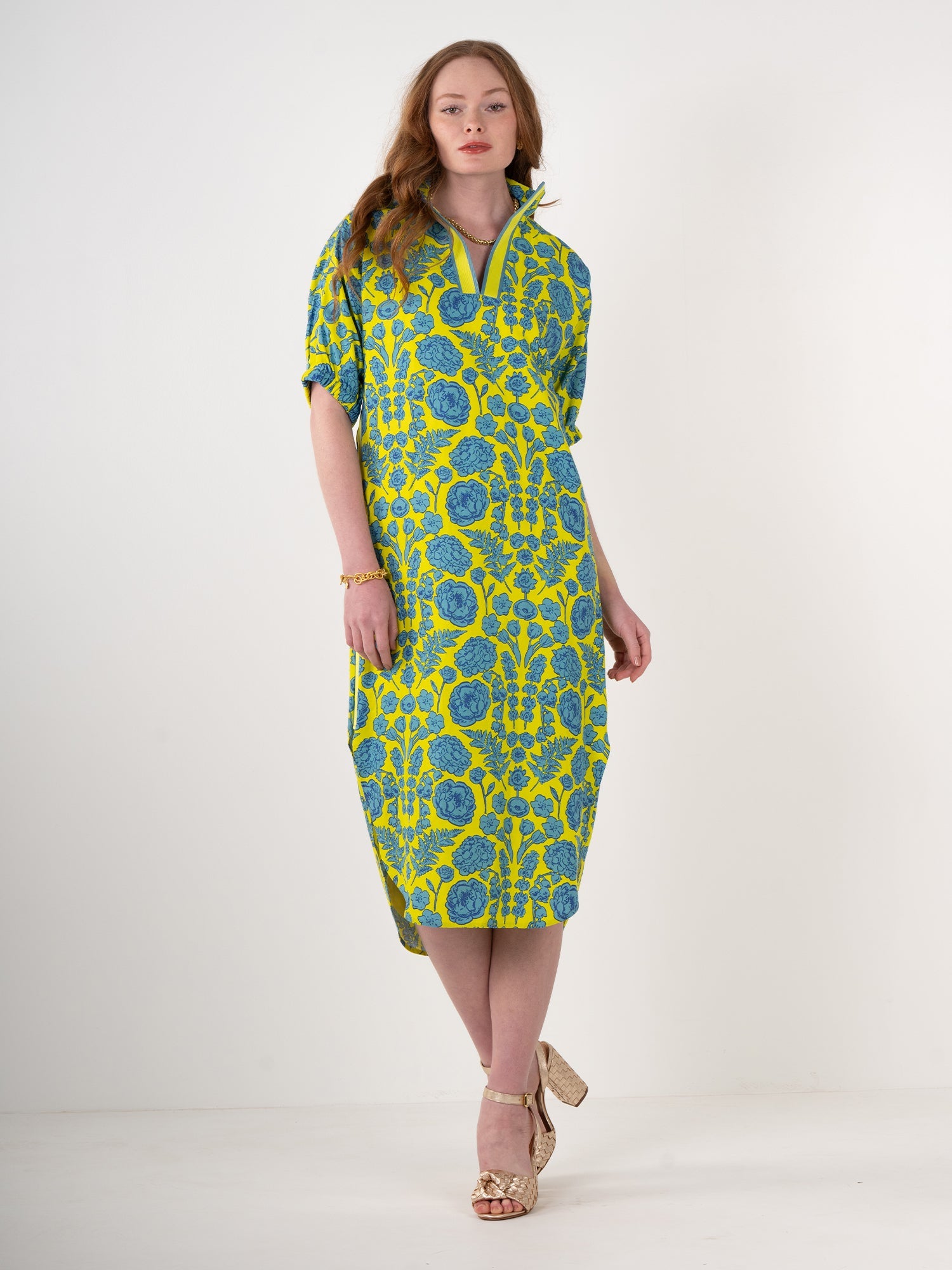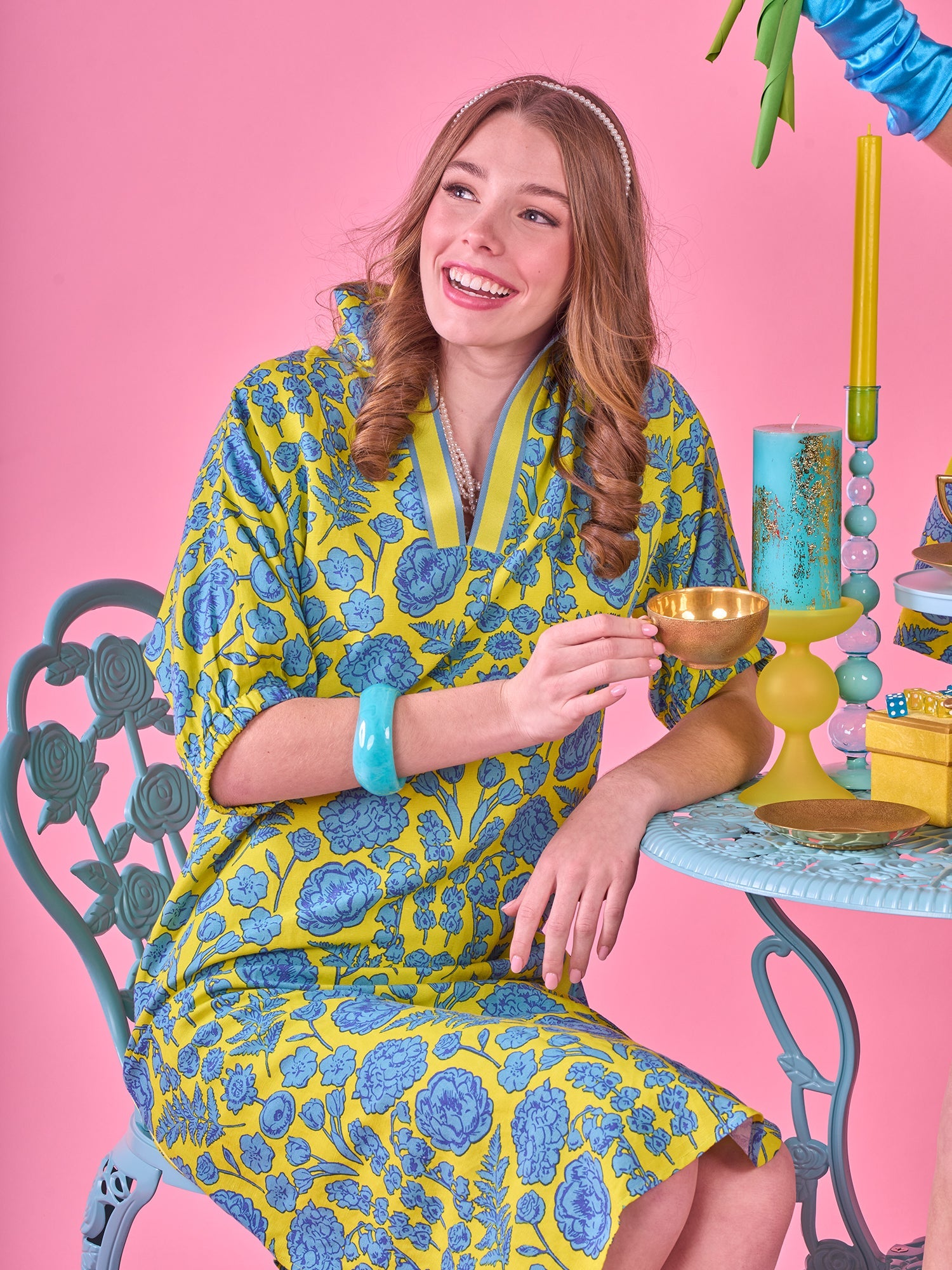 Fashion meets vibrant style in the versatile Poppy Caftan in Joy Bouquet. Designed for a relaxed yet refined silhouette, this piece features a classic popped collar for a touch of timeless style, along with loose, elastic dolman sleeves that offer both comfort and a flattering drape. The curved tail hem adds a unique and stylish detail, enhancing the flow and movement of the dress. The showstopping print showcases a beautiful compilation of the Emily McCarthy team's favorite flowers, translated into a vibrant chartreuse and turquoise palette that exudes joyful energy. Perfect for a myriad of occasions, this caftan dress can be dressed up with heels for a special event or styled more casually with sandals for a relaxed daytime look. Its versatility and unique design make it a true wardrobe essential.
