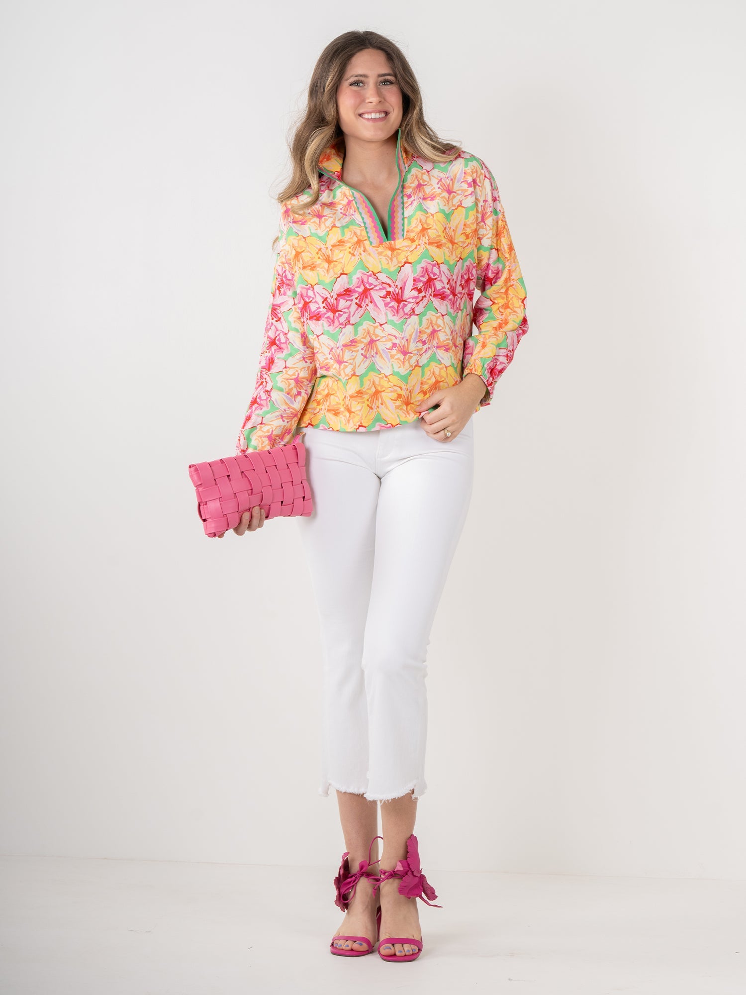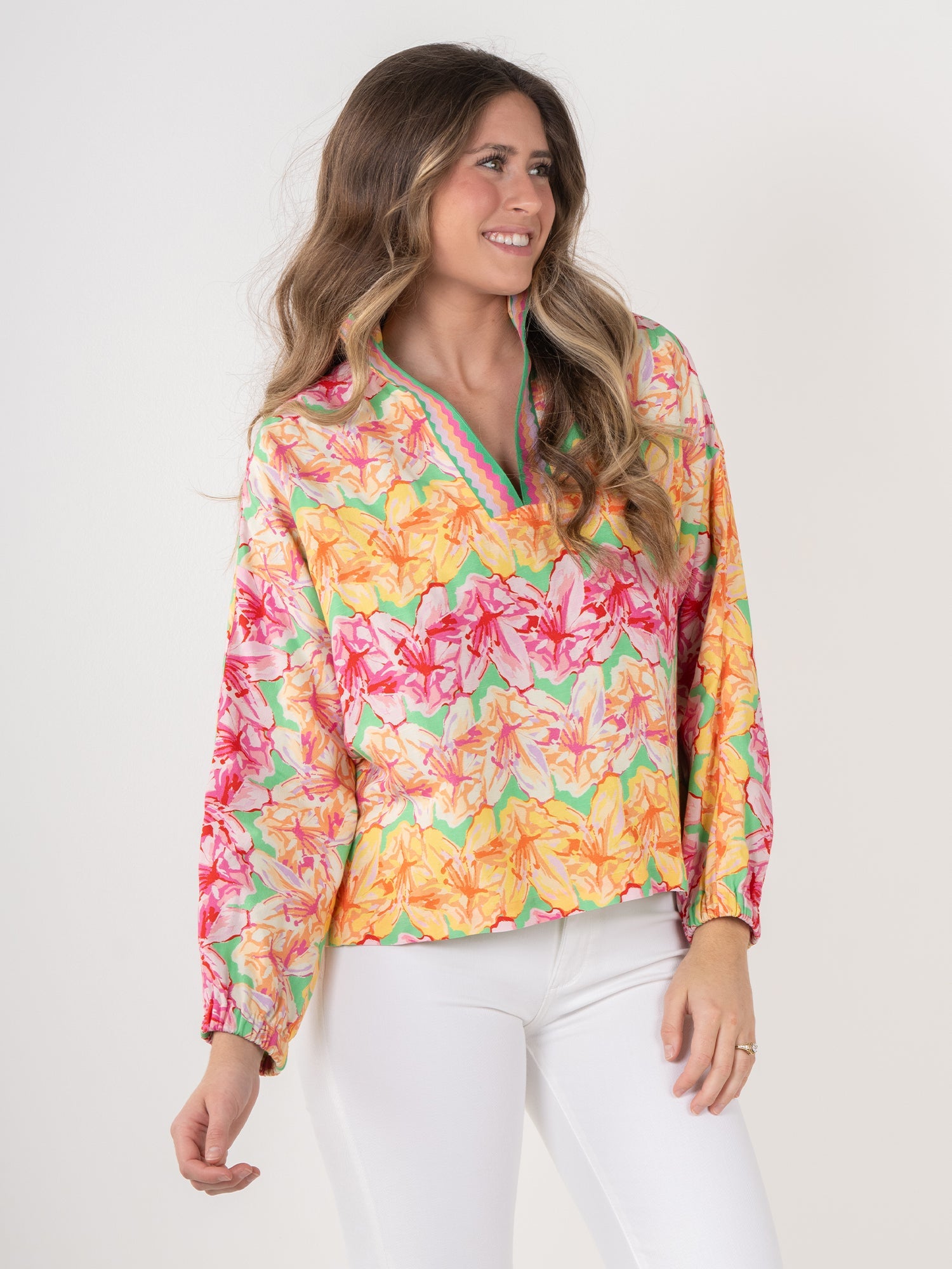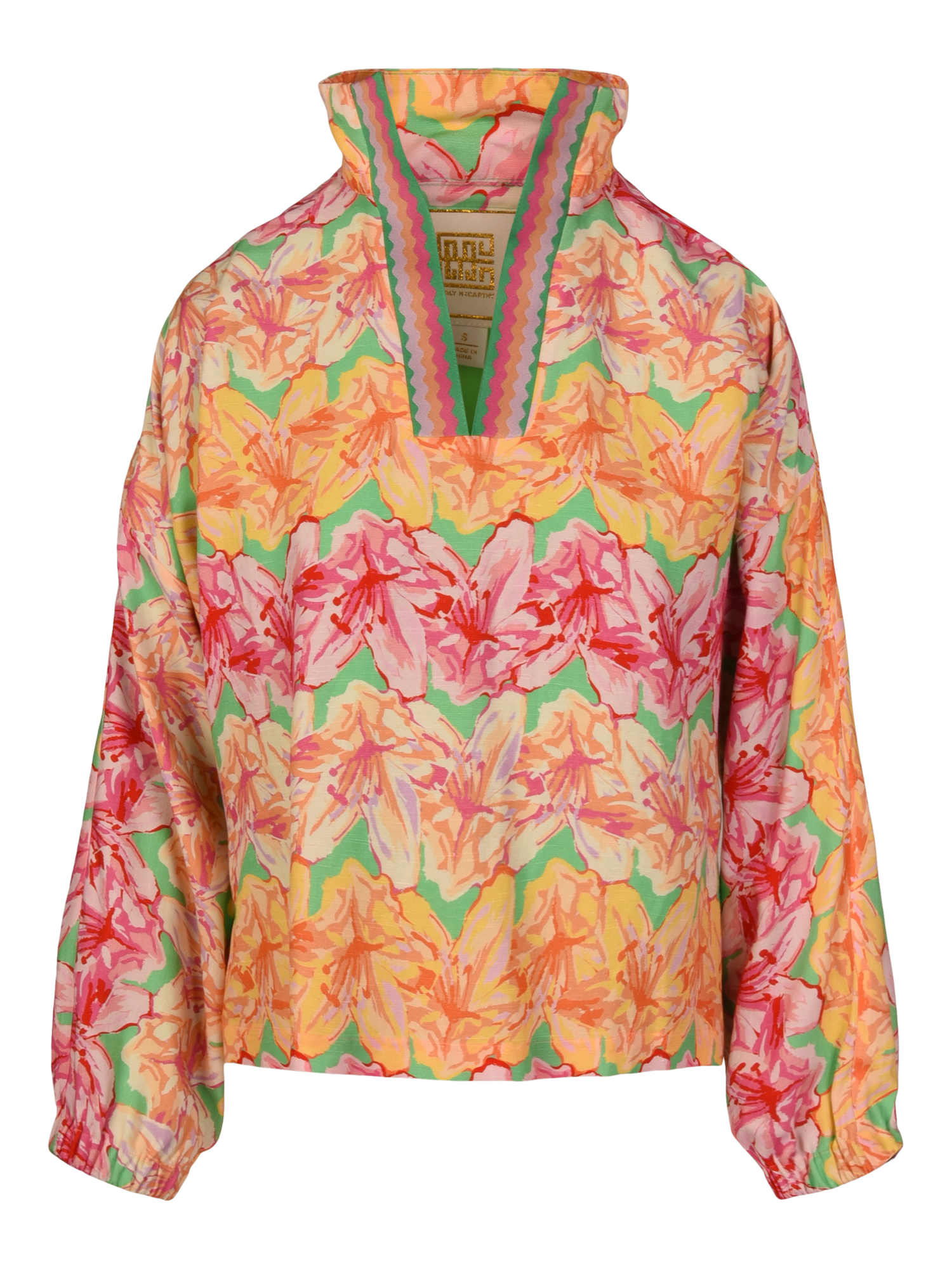 Embrace the vibrant energy of spring with the Poppy Pop-Over Azalea. This top features a captivating pattern of painterly azaleas in a refreshing palette of pinks, oranges, yellows, and soft greens. The lively design brings a burst of botanical beauty to your wardrobe. The classic stand collar, loose-fitting silhouette, and long dolman sleeves create a chic, relaxed look. The elastic cuffs provide a gentle gather, adding subtle volume and a comfortable fit. These bold florals will be your spring wardrobe's best friend!