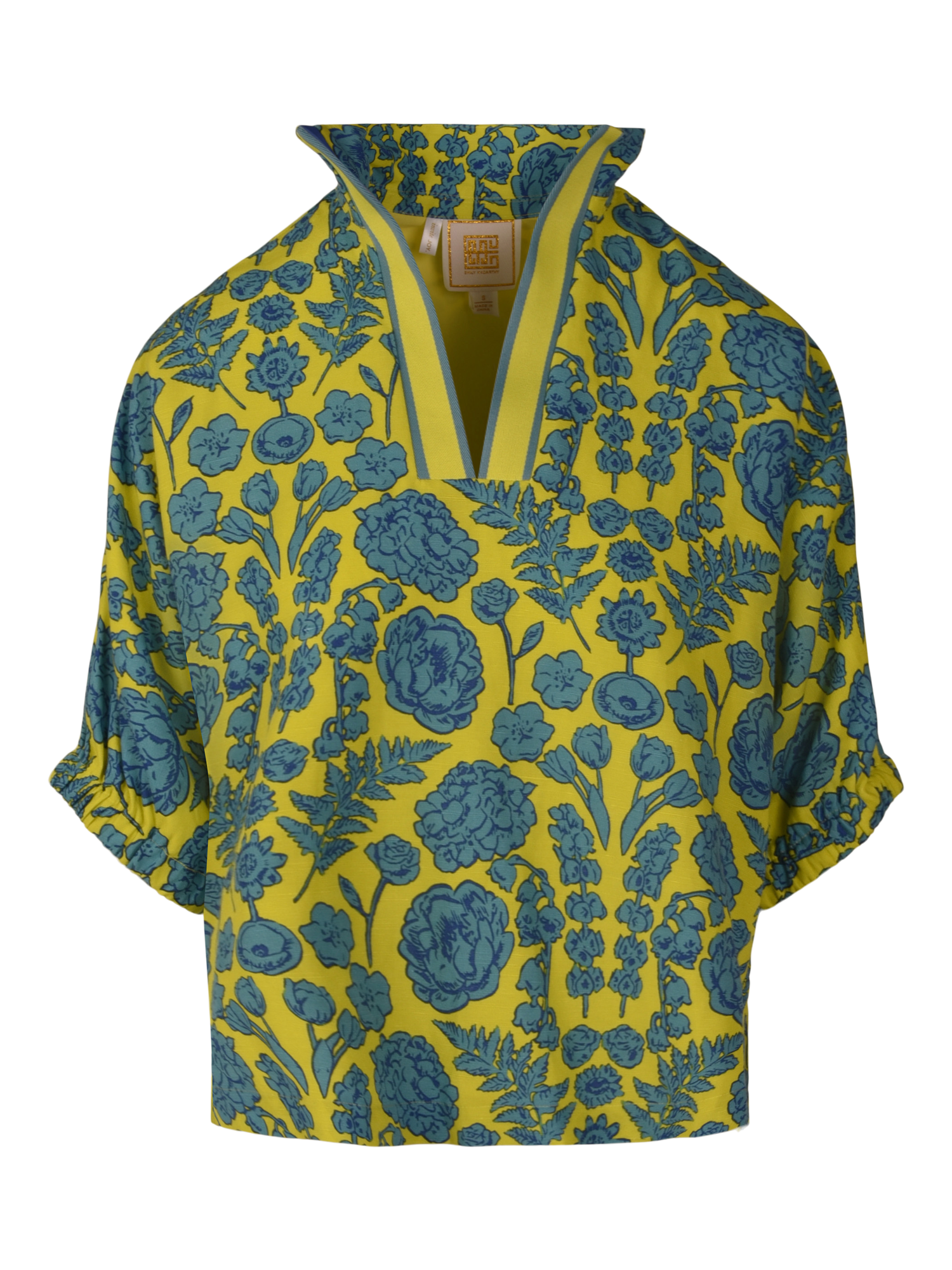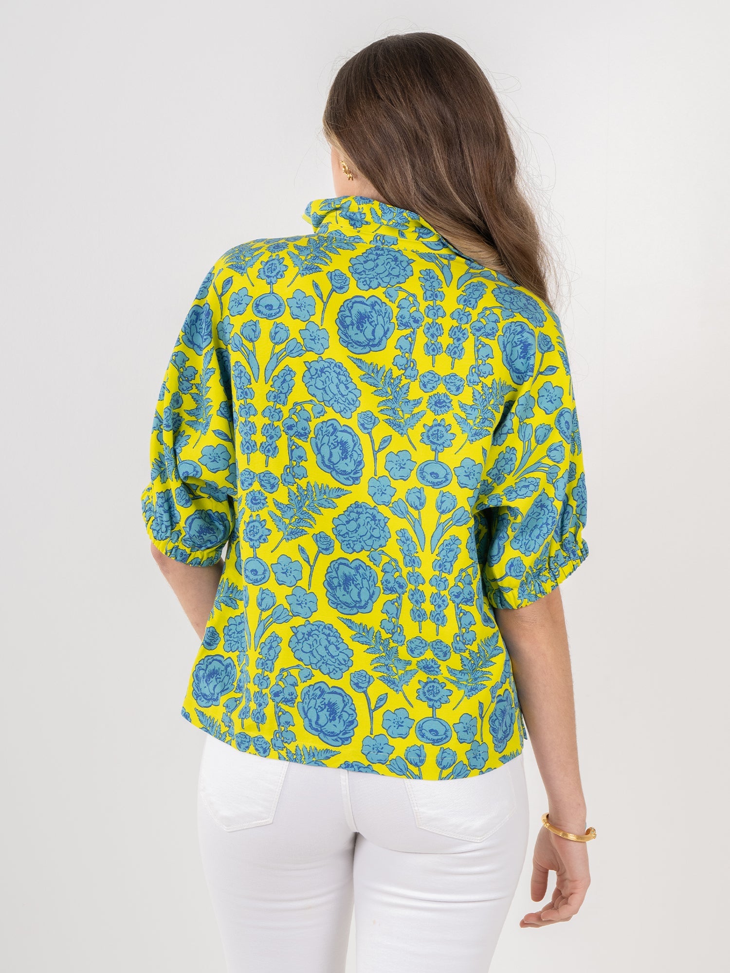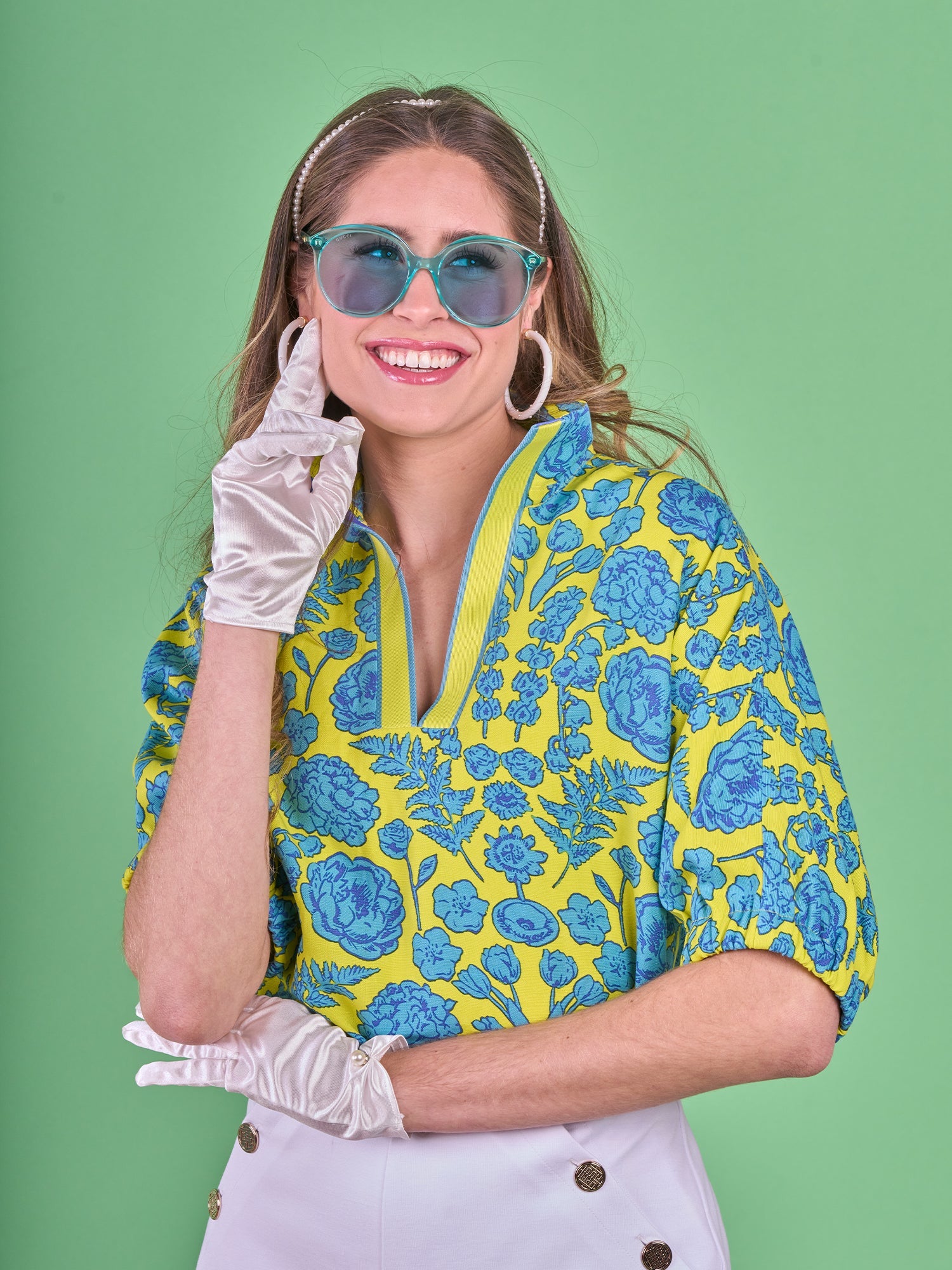 Our best selling Poppy Top in Joy Bouquet is a compilation of the Emily McCarthy team's favorite flowers, printed in vibrant seaglass blue and chartreuse. Featuring a classic stand collar, loose elastic dolman sleeves, and boxy silhouette, this top exudes timeless style with all day comfort. Pair with the Ruffle Short in Seaglass for a bright and playful color coordinating look!