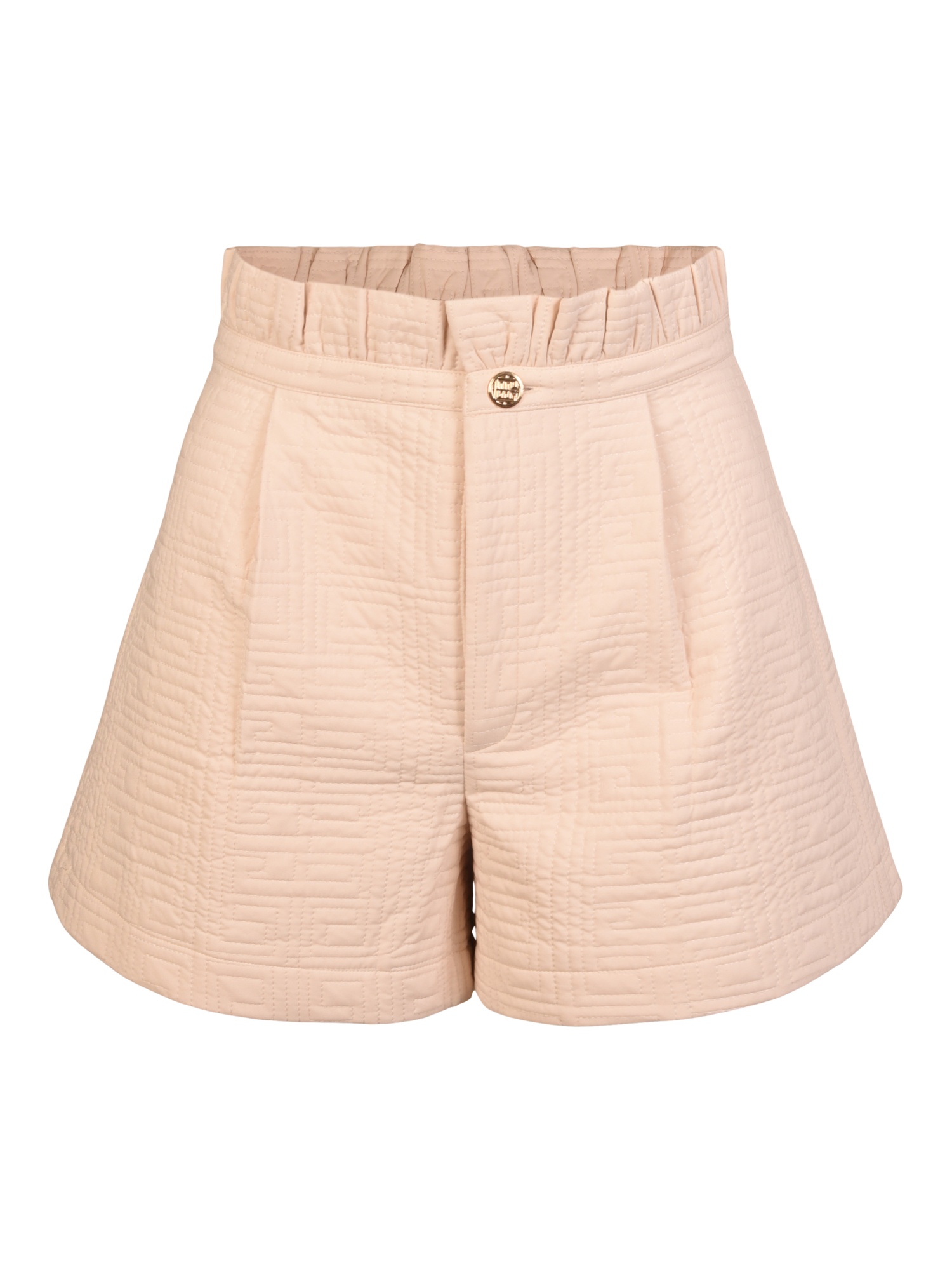 Elevate your spring staple wardrobe with the Ruffle Short in Sandshell. Featuring intricate stitching of our signature monogram logo, adding texture and sophisticated detail. The high-waisted silhouette offers a slimming effect while the ruffled waistband and signature gold button closure adds a chic and feminine touch. Fit for just about any occasion, dressed up or down!
