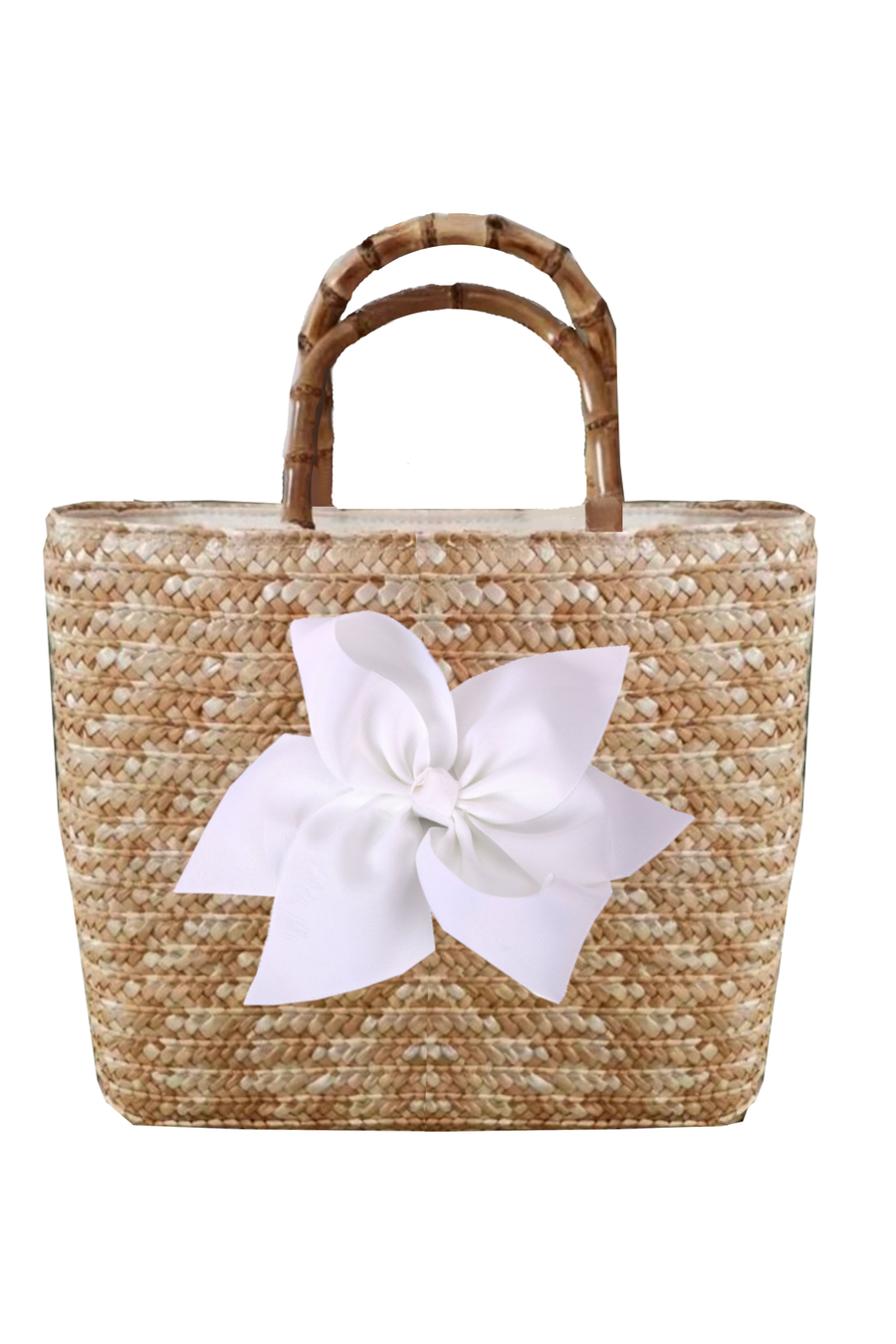This tote is a woven straw bag with bamboo handles. The bag measures approximately 12" x 10" x 4". It is fully lined and has an interior pocket. The bag closes with a zipper closure. It comes with one bow. The bow attaches with a magnetic snap and is interchangeable. Other bow colors are available in my shop. Bows also sold separately.