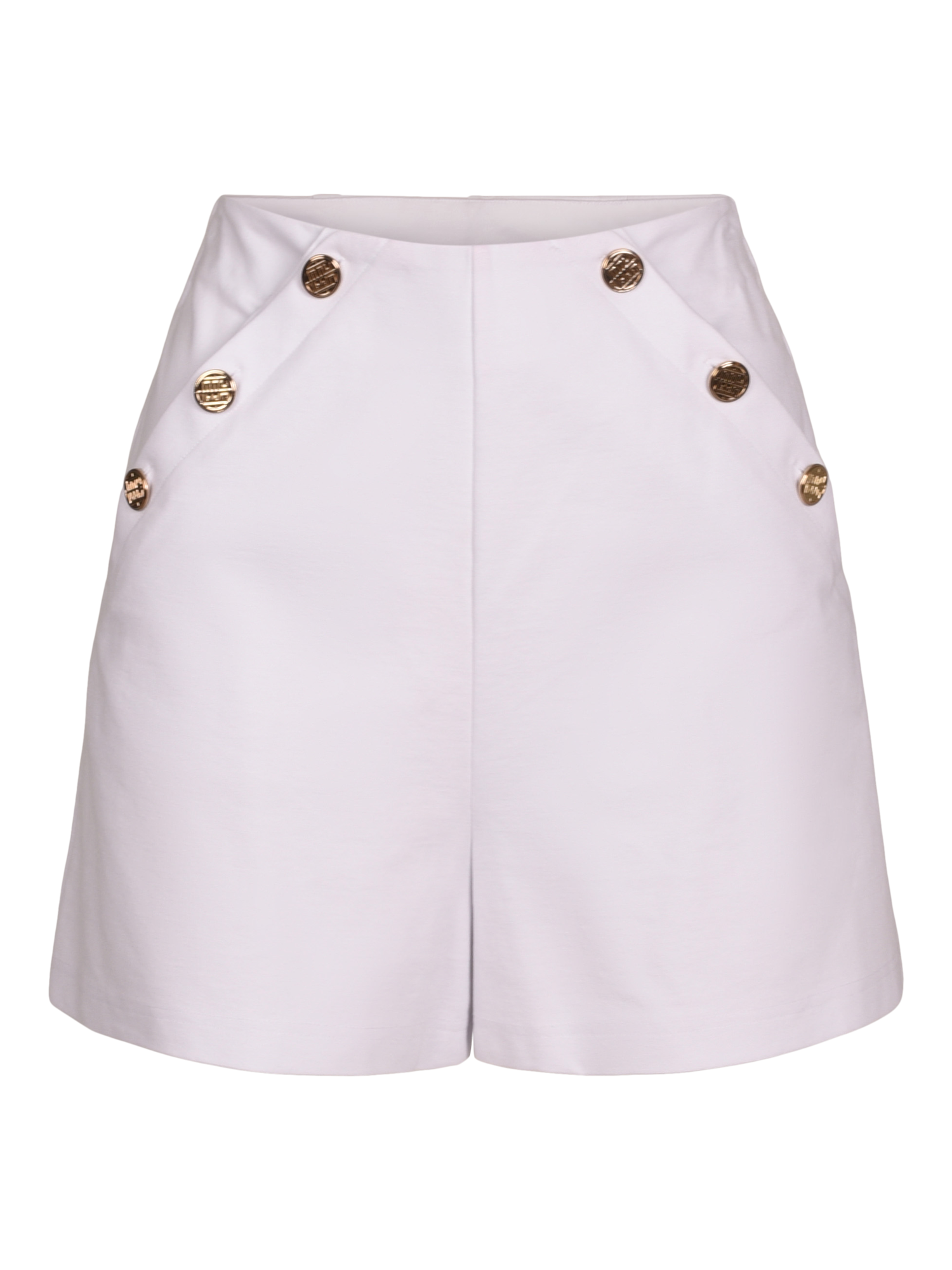Exuding chic style with a nautical inspired twist, the Saylor Short in White Ponte embraces unique detail and versatile styling abilities. These sailor style shorts feature double button closures complimented with our signature gold hardware. The slimming high-waist flatters the figure and creates an elongated effect to boost confidence and comfortability. The perfect staple piece to add to your spring wardrobe for easy outfit pairing for almost any occasion!