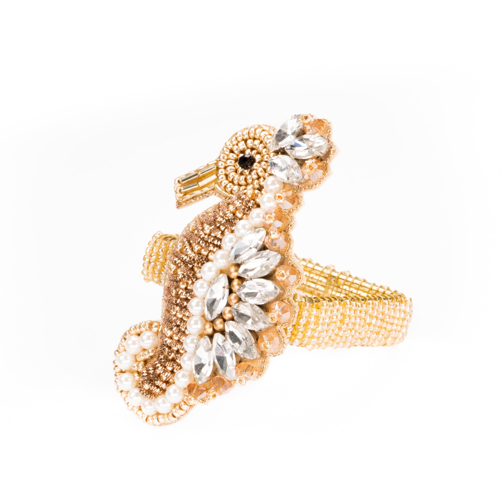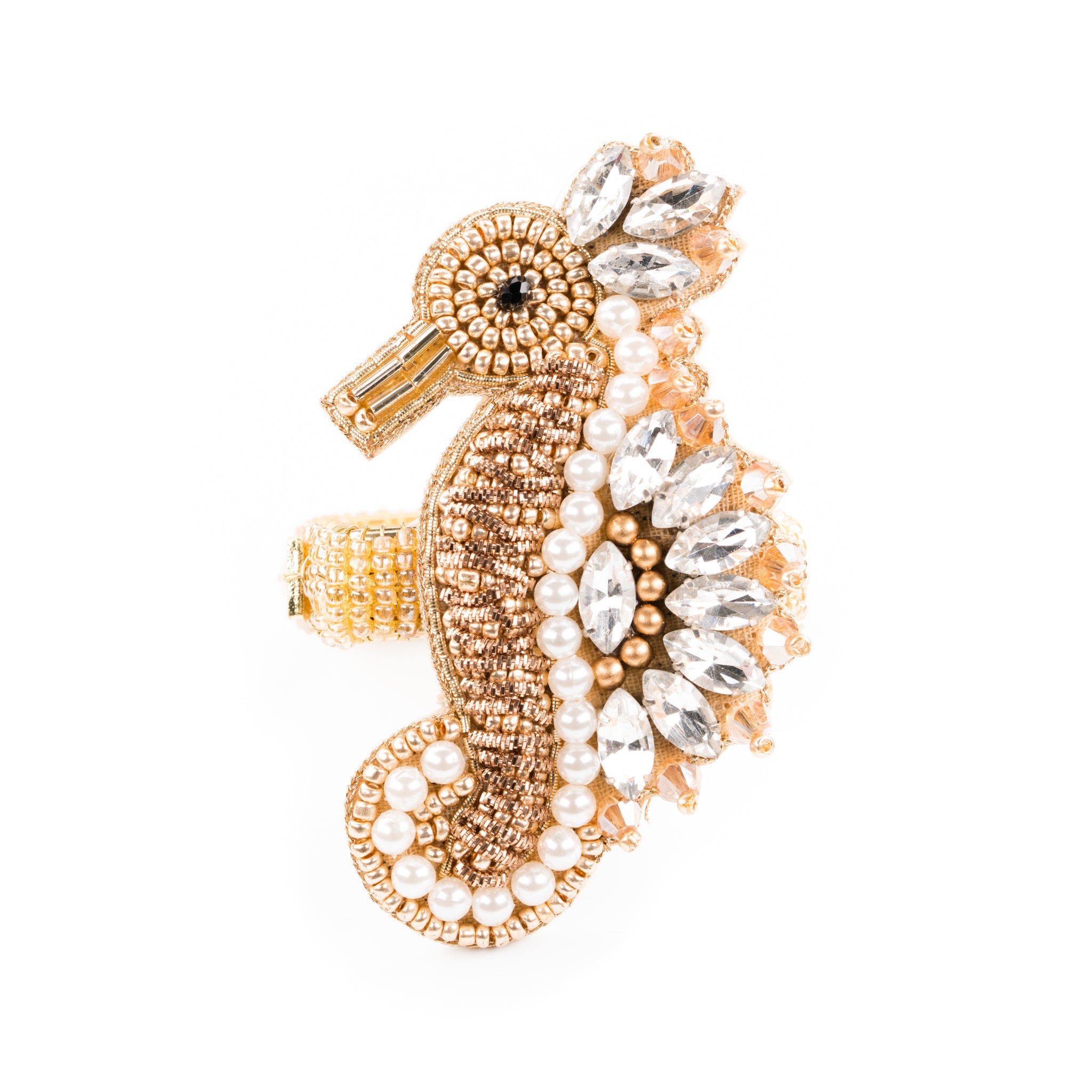 This beautiful golden seahorse features a unique combination of bead embroidery, dabka thread embroidery, rhinestones and pearls.