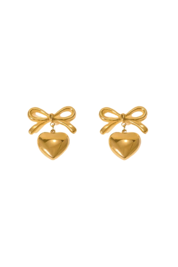 The Hepburn earring features a delicate bow and gold heart. This dainty drop earring is lightweight and perfect to pair with any outfit-- dress them up or down. These earrings are hypoallergenic and nickel free. Earrings measure 1" x .075".