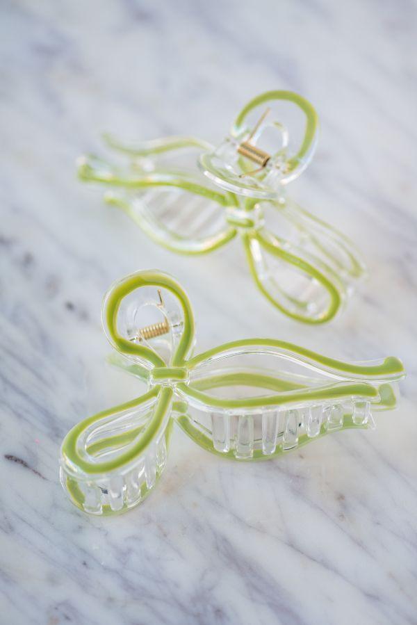 The Lacy Bow Claw Clip in olive green is equally functional and cute. This green jelly clip is equally functional and chic. This green jelly clip is perfect to keep your hair out of your face while keeping it cute. Never leave the house without it! This item measures 2.5" x 5". This listing is for one clip.