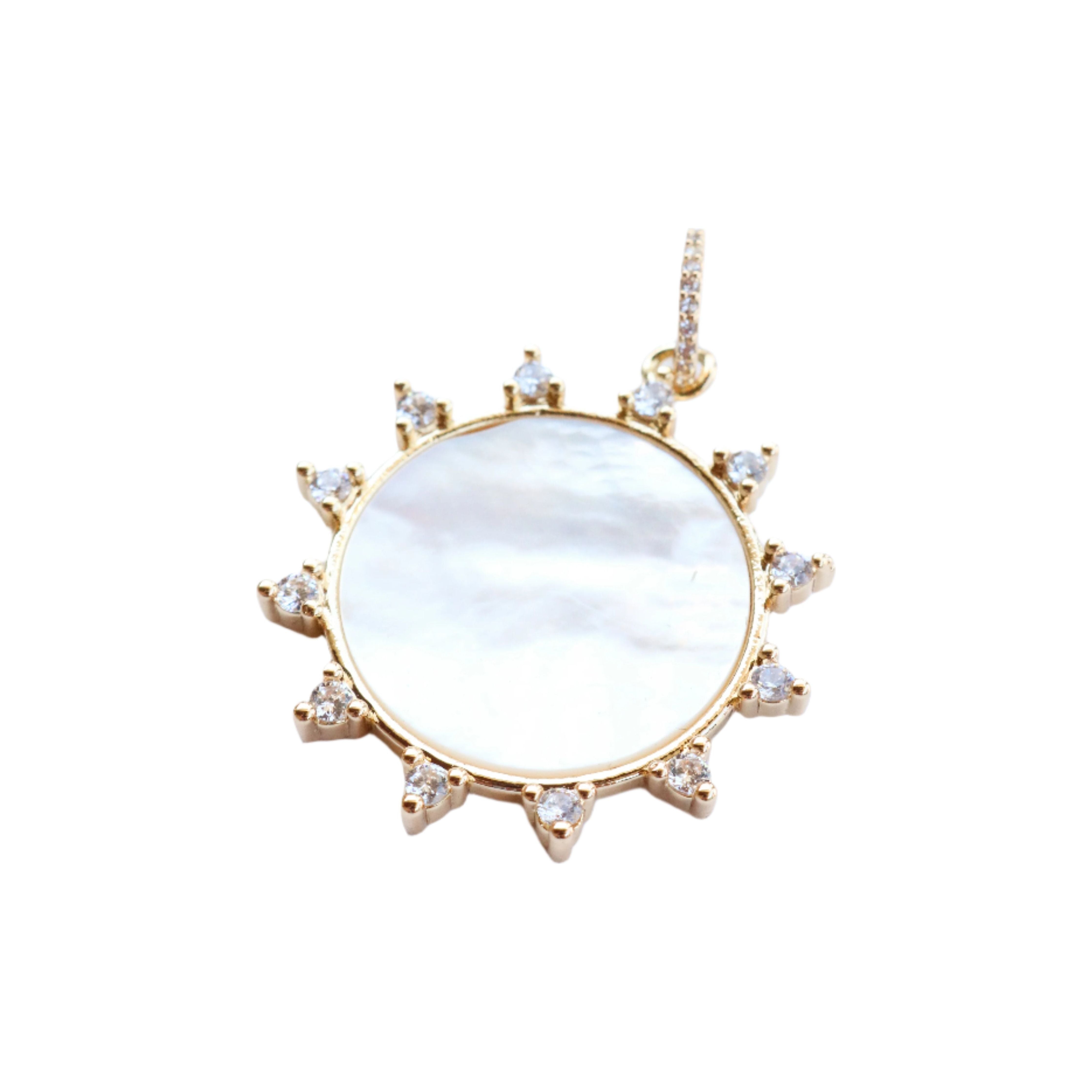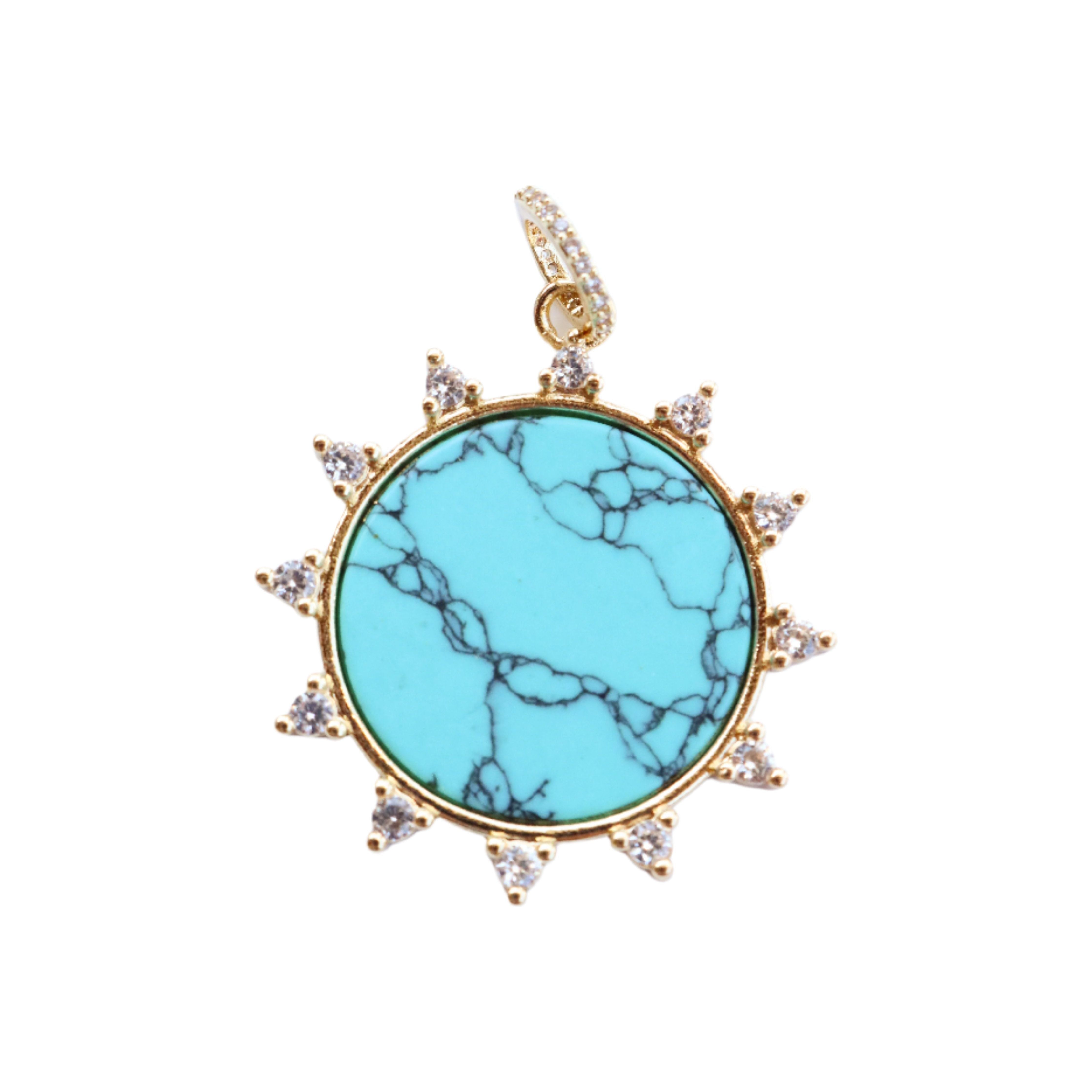 A gorgeous focal pendant to complete your gemstone necklace. The pendant comes with a pave connector that hooks easily onto our signature clasp. Available in Mother of Pearl or turquoise howlite.